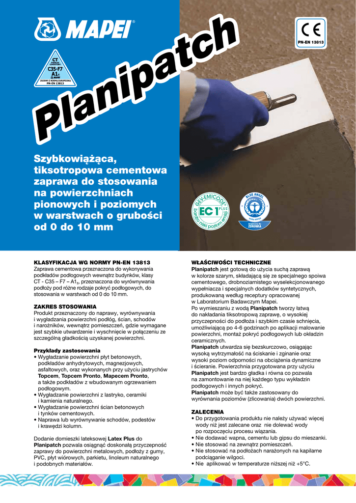 C35-F7 a ip n la ZGODNY Z NORMĄ EUROPEJSKĄ P h c t PN-EN 13813 1504-3 PN-EN Szybkowiążąca, tiksotropowa cementowa zaprawa do stosowania na powierzchniach pionowych i poziomych w warstwach o grubości od 0 do 10 mm KLASYFIKACJA WG NORMY PN-EN 13813 Zaprawa cementowa przeznaczona do wykonywania podkładów podłogowych wewnątrz budynków, klasy CT - C35 – F7 – A1fl, przeznaczona do wyrównywania podłoży pod różne rodzaje pokryć podłogowych, do stosowania w warstwach od 0 do 10 mm. ZAKRES STOSOWANIA Produkt przeznaczony do naprawy, wyrównywania i wygładzania powierzchni podłóg, ścian, schodów i narożników, wewnątrz pomieszczeń, gdzie wymagane jest szybkie utwardzenie i wyschnięcie w połączeniu ze szczególną gładkością uzyskanej powierzchni. Przykłady zastosowania • Wygładzanie powierzchni płyt betonowych, podkładów anhydrytowych, magnezjowych, asfaltowych, oraz wykonanych przy użyciu jastrychów Topcem, Topcem Pronto, Mapecem Pronto, a także podkładów z wbudowanym ogrzewaniem podłogowym. • Wygładzanie powierzchni z lastryko, ceramiki i kamienia naturalnego. • Wygładzanie powierzchni ścian betonowych i tynków cementowych. • Naprawa lub wyrównywanie schodów, podestów i krawędzi kolumn. Dodanie domieszki lateksowej Latex Plus do Planipatch pozwala osiągnąć doskonałą przyczepność zaprawy do powierzchni metalowych, podłoży z gumy, PVC, płyt wiórowych, parkietu, linoleum naturalnego i podobnych materiałów. WŁAŚCIWOŚCI TECHNICZNE Planipatch jest gotową do użycia suchą zaprawą w kolorze szarym, składającą się ze specjalnego spoiwa cementowego, drobnoziarnistego wyselekcjonowanego wypełniacza i specjalnych dodatków syntetycznych, produkowaną według receptury opracowanej w Laboratorium Badawczym Mapei. Po wymieszaniu z wodą Planipatch tworzy łatwą do nakładania tiksotropową zaprawę, o wysokiej przyczepności do podłoża i szybkim czasie schnięcia, umożliwiającą po 4-6 godzinach po aplikacji malowanie powierzchni, montaż pokryć podłogowych lub okładzin ceramicznych. Planipatch utwardza się bezskurczowo, osiągając wysoką wytrzymałość na ściskanie i zginanie oraz wysoki poziom odporności na obciążenia dynamiczne i ścieranie. Powierzchnia przygotowana przy użyciu Planipatch jest bardzo gładka i równa co pozwala na zamontowanie na niej każdego typu wykładzin podłogowych i innych pokryć. Planipatch może być także zastosowany do wyrównania poziomów (zlicowania) dwóch powierzchni. ZALECENIA •D o przygotowania produktu nie należy używać więcej wody niż jest zalecane oraz nie dolewać wody po rozpoczęciu procesu wiązania. •N ie dodawać wapna, cementu lub gipsu do mieszanki. •N ie stosować na zewnątrz pomieszczeń. •N ie stosować na podłożach narażonych na kapilarne podciąganie wilgoci. •N ie aplikować w temperaturze niższej niż +5°C. DANE TECHNICZNE Właściwości zgodne z normą: PN-EN 13813 jako CT C35-F7 A1fl WŁAŚCIWOŚCI PRODUKTU Konsystencja: drobny proszek Kolor: szary Gęstość objętościowa: 1,150 kg/m3 Zawartość suchej substancji: 100% EMICODE: EC1Plus- bardzo niska emisja lotnych związków organicznych (VOC) WŁAŚCIWOŚCI ZAPRAWY Proporcje mieszania: na 100 części Planipatch, --22 części wody. Tiksotropowość: tak Gęstość objętościowa: 1900 kg/ m3 pH: około 12 Temperatura stosowania: +5 ºC do + 30ºC Maksymalny czas użytkowania: około 10 minut Czas wiązania: około 25 minut Obciążenie ruchem pieszym: po około 2 godzinach Czas oczekiwania przed klejeniem kolejnych warstw: 4-6 godzin Wygładzanie istniejącej okładziny z użyciem Planipatch WŁASCIWOŚCI KOŃCOWE Reakcja na ogień: Klasa A1fl Wydzielanie substancji korozyjnych: CT Przepuszczalność wody: NPD Przepuszczalność pary wodnej: NPD Wytrzymałość na ściskanie : C35 Wytrzymałość na zginanie: F7 Odporność na ścieranie: NPD Izolacyjność akustyczna: NPD Dźwiękochłonność: NPD Opór cieplny: NPD Odporność chemiczna: NPD • Chronić opakowania przed zbyt szybkim wysychaniem pod wpływem działania podwyższonej temperatury otoczenia i nadmiernego wietrzenia. • Przed użyciem nie pozostawiać opakowań w miejscu narażonym na promieniowanie słoneczne. • Nie aplikować w warstwach mniejszych niż 3 mm, jeżeli na podłożu montowany będzie parkiet. • Jeżeli wymagana jest warstwa o grubości powyżej 10 mm należy użyć produktu Nivorapid. • Do wyrównywania lub szpachlowania podłoży drewnianych należy użyć mieszanki Planipatch z Latex Plus zamiast wody. Mieszanie Planipatch z Latex Plus w celu wygładzania trudnych i odkształcalnych podłoży Planipatch z dodatkiem Latex Plus do wygładzania powierzchni metalowej Przygotowanie zaprawy Wymieszać worek 25 kg Planipatch z 5,5 l czystej, zimnej wody przy użyciu wolnoobrotowego mieszadła do uzyskania jednolitej mieszanki bez grudek. Maksymalny czas użytkowania tak przygotowanej mieszanki wynosi ok. 10 minut. (w temp. 23°C i wilgotności względnej powietrza 50%). Nanoszenie zaprawy Zaprawę nanosić przy użyciu długiej metalowej pacy. Jeżeli to konieczne, kolejne warstwy można nanosić jedna po drugiej (należy odczekać około 40-50 minut pomiędzy kolejnymi warstwami, w zależności od panującej temperatury). Powierzchnie wyszpachlowane przy użyciu Planipatch są gotowe do dalszych operacji po upływie 4-6 godzin od momentu aplikacji. CZYSZCZENIE Po zakończeniu prac, dopóki produkt nie zwiąże sprzęt i narzędzia można oczyścić wodą. ZUŻYCIE 1,5 kg/m² na warstwę o grubości 1 mm. PRZECHOWYWANIE Planipatch może być przechowywany przez 12 miesięcy w oryginalnie zamkniętych opakowaniach i w suchym miejscu. Wydłużony czas magazynowania może mieć wpływ na czasy deklarowane w dokumentacji produktu, w tym na wydłużenie czasu wiązania, ale nie ma wpływu na właściwości końcowe produktu. PL OPAKOWANIA Worki 25 kg. Produkt zgodny z wymogami rozporządzenia 1