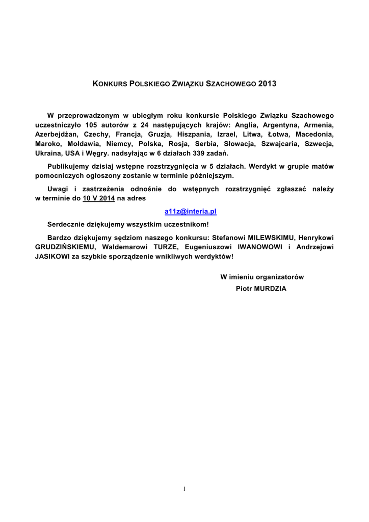 KONKURS POLSKIEGO ZWIĄZKU SZACHOWEGO 2013 W przeprowadzonym w ubiegłym roku konkursie Polskiego Związku Szachowego uczestniczyło 105 autorów z 24 następujących krajów: Anglia, Argentyna, Armenia, Azerbejdżan, Czechy, Francja, Gruzja, Hiszpania, Izrael, Litwa, Łotwa, Macedonia, Maroko, Mołdawia, Niemcy, Polska, Rosja, Serbia, Słowacja, Szwajcaria, Szwecja, Ukraina, USA i Węgry. nadsyłając w 6 działach 339 zadań. Publikujemy dzisiaj wstępne rozstrzygnięcia w 5 działach. Werdykt w grupie matów pomocniczych ogłoszony zostanie w terminie późniejszym. Uwagi i zastrzeżenia odnośnie do wstępnych rozstrzygnięć zgłaszać należy w terminie do 10 V 2014 na adres [email protected] Serdecznie dziękujemy wszystkim uczestnikom! Bardzo dziękujemy sędziom naszego konkursu: Stefanowi MILEWSKIMU, Henrykowi GRUDZIŃSKIEMU, Waldemarowi TURZE, Eugeniuszowi IWANOWOWI i Andrzejowi JASIKOWI za szybkie sporządzenie wnikliwych werdyktów! W imieniu organizatorów Piotr MURDZIA 1 ROZSTRZYGNIĘCIE KONKURSU POLSKIEGO ZWIĄZKU SZACHOWEGO 2013 – DWUCHODÓWKI Sędzia: Stefan MILEWSKI, mistrz krajowy kompozycji szachowej Do oceny otrzymałem 33 prace 27 autorów z 10 następujących państw: Azerbejdżan, Macedonia, Mołdawia, Niemcy, Polska, Rosja, Serbia, Słowacja, Ukraina i Węgry. Odpadło piękne zadanie nr 25 – antycypacja: E. Bogdanow, 5/7 HM Šahs 1975: Kh3 Hf6 Wa5 Sb2 Sf2 Pe3 Pg4 - Kd5 Gb5 Pb3 Pc6 Pf3 Pf7 Pg5 Ph4. #2 (7+8) 1.Sa4? b2! 1.Se4! oraz nr 12 ze względu na bierną rolę białego Sh2 w grze realnej. Wyróżnione kompozycje uszeregowałem następująco: I nagroda Dragan STOJNIĆ (Serbia) II nagroda III nagroda Edward PAŁŁASZ Anatolij WASYLENKO & Stefan PARZUCH (Polska) & Mark BASISTYJ (Ukraina) #2 #2 (12+11) (7+8) #2 (9+10) I nagroda nr 269 – Dragan STOJNIĆ (Serbia) Oryginalna prezentacja syntezy tematów Somow B1, Barnes, Rudenko i pseudo le Grand w zwartym trzyfazowym mechanizmie. Harmonijne skojarzenie antykrytycznych ruchów 1.Gg8? i 1.G:b6! z wariantami Somowa i aktywną grą białej królewskiej baterii matującej wywołuje duże wrażenie. Narzucające się posunięcie 1.H:f5? wprowadzające obie ideowe groźby stanowi znakomite otwarcie całej kombinacji. Niewątpliwie najlepsza kompozycja konkursu. 1.H:f5? ~ 2.Kc4 A/Ke3# B 1...Sge6! (2.Sf5?) 1.Gg8? ~ 2.Kc4# A 1...c:b5 2.Ke3# B -Somow B1 1...Sde6 2.Wc6# 1...Sfe6 2.Sf5# 1...Wh2 2.Hf4# 1...Wf7! 1.G:b6! ~ 2.Ke3# B 1...f4 2.Kc4# A -Somow B1 1...Sde6 2.Wc6# 1...Sfe6 2.Sf5# 1...Wh2 2.Hf4#. II nagroda nr 1 – Edward PAŁŁASZ & Stefan PARZUCH (Polska) "Biały gra" z zamianą 3 matów i 2 wariantami dodanymi w eleganckiej, przejrzystej pozycji. Wstęp wprowadza nie tylko dwie gry dodane po biciu gońca, ale także oryginalne poprawione obrony cz. pionków d7 i f7. Ponadto po 1...f:e6 pojawia się motyw Ruchlisa. 1…Sb~/f6/d6 2.We4/S:d7/Sfg6/H:d4# 1.Ge6! tempo 1...Sd~/Sb~/f6[f~]/f:e6/d:e6[d~]/d6 2.Sf3/H:d5/Shg6/Sfg6/Hc7/H:d4# 1.G:d3/H:b6/W:d4? Sb~/Ge4/d6! III nagroda nr 251 – Anatolij WASYLENKO & Mark BASISTYJ (Ukraina) Piękny wstęp oddający dwa pola wprowadza połączenie tematów Chernet [w złudzie i rozwiązaniu następuje ofiara tej samej bierki], pseudo le Grand i maty zamienne. 1.Gb6? ~ 2.He3# 1...W:e5 2.Hf2# 1...Sd4 2.W:d4# 1...Sg4! 1.Hc3? ~ 2.Se2#1...W:e5 2.Hf3# 1...Sd4 2.H:d4# 1...Gg4 2.Gg5# 1...Wa2! 1.S:f5? ~ 2.He4# 1...G:f5 2.Hg3# 1...W:e5 2.Hf2# 1...K:f5 2.He4# 1...c3! 1.Se4! ~ 2.Hg3# 1...Kf3 2.Hf2# 1...K:e5 2.Gc7# 1...f:e4 2.H:e4#. 2 IV nagroda Walerij SZANSZYN (Rosja) Specjalna nagroda Stefan PARZUCH (Polska) #2 #2 (14+9) 1 wyróżnienie honorowe Żivko JANEVSKi (Macedonia) (6+8) #2 (10+7) IV nagroda nr 144 – Walerij SZANSZYN (Rosja) Wstęp oddaje jedno pole i wywołuje żywą grę. W złudach i rozwiązaniu różnorodne zamiany. 1.Sd~? ~ 2.Wd6# 1…Wg:d4 a 2.Hd8# 1…Wd:d4! B 1.Sf5!? ~ 2.Wd6# 1…Wd:d4 b 2.S:e3# 1…Wg:d4! a (2.Hd8?) 1.Sdf7!!? ~ 2.Wd6# 1…K:e6 2.Sd6# switchback 1…Se8! 1.Se~? ~ 2.We5# 1…S:e6 c 2.H:a8# 1…S:c5! d 1.Sc6!? ~ 2.We5# 1…S:c5 d 2.W:c5# 1…S:e6! c (2.H:a8?) 1.Sef7! ~ 2.We5# 1…K:e6 2.Se5# switchback 1…S:e6 2.H:a8# 1…We4 2.f:e4# 1…Wg5 2.H:g5#. Specjalna nagroda nr 72 – Stefan PARZUCH (Polska) Biały wzmocniony atak (ogółem 5 złud), Zagorujko po 1…d3 i gra królewskiej baterii. Dobrze skonstruowana dwuchodówka o wyrazistej treści. Oryginalne rozwinięcie dawnego pomysłu: A. Maksimowskich, Šahs 1975: Kf5 Wg4 Gc8 Sf1 Sh4 Pc4 Pf6 Pg3 Pg7 - Kh3 Sc3 Sh8 Pd6 Pe5 Ph6. #2 (9+6). 1.Wf4/We4/Wg5/Wg6? e4/Sc~/h5/Sf7! 1.Wd4! 1.Wa5 [W~]? d3! 1.Wb5? d3 2.Wb4# 1...a5! 1.Wc5? d3 2.Wc4# 1...b5! 1.Wd6? e6! 1.Wd7?Sf~! 1.Wd8! tempo 1...d3 2.c:d3# 1...a5/b5/e6/Sc7/Sf8~ 2.Kb5/Kc5/Kd6/K:c7/Kd7#. 1 wyróżnienie honorowe nr 96 – Żivko JANEVSKi (Macedonia) Biała korekcja, paradoks Dombrowskisa, zamiana matów i obron. Pomysł zrealizowany został w ekonomicznej pozycji z dobrym, zwalniającym pole dla czarnego króla, wstępem. 1...g:f5 x 2.We7# A 1...d:e3 2.Gc3# 1.K:g4? ~ 2.We7# A 1...Gd6! 1...g:f5+ x 2.W:f5# 1.Se~? ~ 2.Sd3# B 1..Gd6! 1...d:e3 2.Gc3# C 1.Sc3!? ~ 2.Sd3# B 1...d:e3! 1...d:c3 2.G:c3# C 1.Sf6! ~ 2.S:g4# (2.Sd3? B) 1...g:f5 x 2.Sd3# B 1...g:f6 2.We7# A 1...d:e3 2.Gc3# C 1...Gd6 2.Scd7#. 2 wyróżnienie honorowe Andrzej BABIARZ (Polska) 3 wyróżnienie honorowe Zoltan LABAi (Słowacja) 4 wyróżnienie honorowe Jurij ALEKSIEJEW & Aleksandr TIUNIN (Rosja) #2 (10+8) #2 (6+10) #2 (10+12) 2 wyróżnienie honorowe nr 109 – Andrzej BABIARZ (Polska) Zamiana matów z efektownym wstępem i silną tematyczną złudą. 1…Kd4 2.Sf3# 1.Hd8? ~ 2.Hd5# 1....Wd7/Sd6/Sb6/b:c4 2.Hf6/H:d6/Hd6/S:c4# 1...f6! 1.Wd6! ~ 2.Wd5# 1...Wd7/Sd6/Sb6/f6/b:c4/K:d6 2.Sc6/Sc6/H:e7/H:f6/S:c4/Gf4#. 3 3 wyróżnienie honorowe nr 168 – Zoltan LABAI (Słowacja) Cykl podwójnych gróźb, Option. 1.Hf6? ~ 2.H:e6 A/He5# B 1…We2/Hh2/Wa6 2.Hd4/H:e6/He5# 1…He1! 1.Hg3? ~ 2.He5 B/Hd6# C 1…We2/Hh2/Wa6 2.Hd6/H:f3/He5# 1…f4! 1.He7! ~ 2.Hd6 C/H:e6# A 1…We2/Hh2/Wa6 2.Hd6/H:e6/He5#. 4 wyr
