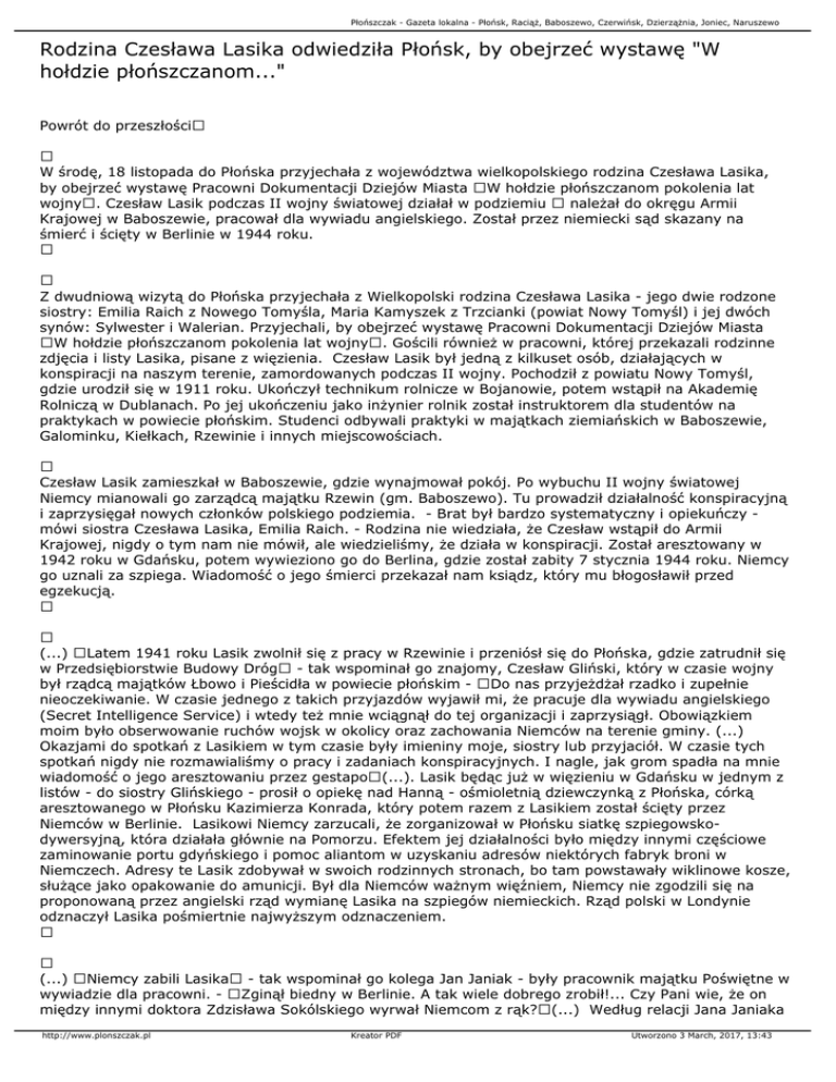 Płońszczak - Gazeta lokalna - Płońsk, Raciąż, Baboszewo, Czerwińsk, Dzierzążnia, Joniec, Naruszewo Rodzina Czesława Lasika odwiedziła Płońsk, by obejrzeć wystawę "W hołdzie płońszczanom..." Powrót do przeszłości W środę, 18 listopada do Płońska przyjechała z województwa wielkopolskiego rodzina Czesława Lasika, by obejrzeć wystawę Pracowni Dokumentacji Dziejów Miasta W hołdzie płońszczanom pokolenia lat wojny. Czesław Lasik podczas II wojny światowej działał w podziemiu należał do okręgu Armii Krajowej w Baboszewie, pracował dla wywiadu angielskiego. Został przez niemiecki sąd skazany na śmierć i ścięty w Berlinie w 1944 roku. Z dwudniową wizytą do Płońska przyjechała z Wielkopolski rodzina Czesława Lasika - jego dwie rodzone siostry: Emilia Raich z Nowego Tomyśla, Maria Kamyszek z Trzcianki (powiat Nowy Tomyśl) i jej dwóch synów: Sylwester i Walerian. Przyjechali, by obejrzeć wystawę Pracowni Dokumentacji Dziejów Miasta W hołdzie płońszczanom pokolenia lat wojny. Gościli również w pracowni, której przekazali rodzinne zdjęcia i listy Lasika, pisane z więzienia. Czesław Lasik był jedną z kilkuset osób, działających w konspiracji na naszym terenie, zamordowanych podczas II wojny. Pochodził z powiatu Nowy Tomyśl, gdzie urodził się w 1911 roku. Ukończył technikum rolnicze w Bojanowie, potem wstąpił na Akademię Rolniczą w Dublanach. Po jej ukończeniu jako inżynier rolnik został instruktorem dla studentów na praktykach w powiecie płońskim. Studenci odbywali praktyki w majątkach ziemiańskich w Baboszewie, Galominku, Kiełkach, Rzewinie i innych miejscowościach. Czesław Lasik zamieszkał w Baboszewie, gdzie wynajmował pokój. Po wybuchu II wojny światowej Niemcy mianowali go zarządcą majątku Rzewin (gm. Baboszewo). Tu prowadził działalność konspiracyjną i zaprzysięgał nowych członków polskiego podziemia. - Brat był bardzo systematyczny i opiekuńczy mówi siostra Czesława Lasika, Emilia Raich. - Rodzina nie wiedziała, że Czesław wstąpił do Armii Krajowej, nigdy o tym nam nie mówił, ale wiedzieliśmy, że działa w konspiracji. Został aresztowany w 1942 roku w Gdańsku, potem wywieziono go do Berlina, gdzie został zabity 7 stycznia 1944 roku. Niemcy go uznali za szpiega. Wiadomość o jego śmierci przekazał nam ksiądz, który mu błogosławił przed egzekucją. (...) Latem 1941 roku Lasik zwolnił się z pracy w Rzewinie i przeniósł się do Płońska, gdzie zatrudnił się w Przedsiębiorstwie Budowy Dróg - tak wspominał go znajomy, Czesław Gliński, który w czasie wojny był rządcą majątków Łbowo i Pieścidła w powiecie płońskim - Do nas przyjeżdżał rzadko i zupełnie nieoczekiwanie. W czasie jednego z takich przyjazdów wyjawił mi, że pracuje dla wywiadu angielskiego (Secret Intelligence Service) i wtedy też mnie wciągnął do tej organizacji i zaprzysiągł. Obowiązkiem moim było obserwowanie ruchów wojsk w okolicy oraz zachowania Niemców na terenie gminy. (...) Okazjami do spotkań z Lasikiem w tym czasie były imieniny moje, siostry lub przyjaciół. W czasie tych spotkań nigdy nie rozmawialiśmy o pracy i zadaniach konspiracyjnych. I nagle, jak grom spadła na mnie wiadomość o jego aresztowaniu przez gestapo(...). Lasik będąc już w więzieniu w Gdańsku w jednym z listów - do siostry Glińskiego - prosił o opiekę nad Hanną - ośmioletnią dziewczynką z Płońska, córką aresztowanego w Płońsku Kazimierza Konrada, który potem razem z Lasikiem został ścięty przez Niemców w Berlinie. Lasikowi Niemcy zarzucali, że zorganizował w Płońsku siatkę szpiegowskodywersyjną, która działała głównie na Pomorzu. Efektem jej działalności było między innymi częściowe zaminowanie portu gdyńskiego i pomoc aliantom w uzyskaniu adresów niektórych fabryk broni w Niemczech. Adresy te Lasik zdobywał w swoich rodzinnych stronach, bo tam powstawały wiklinowe kosze, służące jako opakowanie do amunicji. Był dla Niemców ważnym więźniem, Niemcy nie zgodzili się na proponowaną przez angielski rząd wymianę Lasika na szpiegów niemieckich. Rząd polski w Londynie odznaczył Lasika pośmiertnie najwyższym odznaczeniem. (...) Niemcy zabili Lasika - tak wspominał go kolega Jan Janiak - były pracownik majątku Poświętne w wywiadzie dla pracowni. - Zginął biedny w Berlinie. A tak wiele dobrego zrobił!... Czy Pani wie, że on między innymi doktora Zdzisława Sokólskiego wyrwał Niemcom z rąk?(...) Według relacji Jana Janiaka http://www.plonszczak.pl Kreator PDF Utworzono 3 March, 2017, 13:43 Płońszczak - Gazeta lokalna - Płońsk, Raciąż, Baboszewo, Czerwińsk, Dzierzążnia, Joniec, Naruszewo Czesław Lasik, gdy Sokólski został aresztowany, zorganizował grupę Polaków, którzy mówili po niemiecku, przebrał ich w niemieckie mundury. Wywieźli Sokólskiego z więzienia - Niemcy sądzili, że aresztant pojechał na egzekucję. Niedawno w Poznaniu, przy Pomniku Polskiego Państwa Podziemnego i AK - 24 września tego roku - została odsłonięta tablica pamiątkowa poświęcona Czesławowi Lasikowi. Po wojnie były takie czasy, że nic nie można było w tej sprawie zrobić - mówi Emilia Raich. Postanowiliśmy zebrać dokumenty i sprawie nadać bieg po informacji w telewizji o odsłonięciu pomnika AK w Poznaniu. Mój brat nikogo nie zdradził, choć sam został zdradzony. W 1967 roku wezwano mnie do komisji badającej zbrodnie hitlerowskie i prokurator powiedział, że rodzina nawet nie wie, jakiego ma bohatera, że na przykład wysadził Niemcom bazę paliw. Rodzina Czesława Lasika o wystawie płońskiej pracowni dokumentacji dowiedziała się z internetu i postanowiła przyjechać do Płońska, by ją zobaczyć. Wśród osób, które zginęły podczas wojny, przypominanych przez pracownię, jest również Czesław Lasik. Wystawa zrobiła na nas ogromne wrażenie - mówi pani Maria. - Widać, że włożono w ni