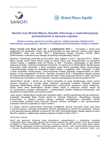 INFORMACJA PRASOWA Sanofi oraz Bristol-Myers Squibb informują o restrukturyzacji porozumienia w sprawie sojuszu - Zmiana umowy upraszcza zasady sojuszu, dzięki poprawie efektywności obowiązków operacyjnych, zgodnie ze strategicznymi priorytetami każdej ze spółek Paryż, Francja oraz Nowy Jork, NY – 3 października 2012 r. – W związku z utratą praw wyłączności do preparatów: Plavix oraz Avapro/Avalide na wielu ważnych rynkach, firmy Sanofi (EURONEXT: SAN oraz NYSE: SNY) i Bristol-Myers Squibb Company (NYSE: BMY) poinformowały o restrukturyzacji swojego pomyślnego długofalowego sojuszu. Zgodnie z nowelizacją warunków porozumienia, która wejdzie w życie 1 stycznia 2013 r., BristolMyers Squibb zwróci firmie Sanofi prawa do leków Plavix oraz Avapro/Avalide na wszystkich rynkach świata, z wyjątkiem praw do Plavixu w USA i Portoryko, przekazując w ręce Sanofi wyłączną kontrolę i swobodę działalności handlowej. W zamian za to Bristol-Myers Squibb będzie otrzymywać opłaty licencyjne z tytułu sprzedaży przez Sanofi preparatu Plavix (oznaczonego i nieoznaczonego marką) we wszystkich krajach świata, z wyjątkiem USA i Portoryko, a także z tytułu sprzedaży (oznaczonego i nieoznaczonego marką) preparatu Avapro/Avalide na całym świecie, w obu przypadkach do 2018 r. Ponadto, w grudniu 2018 r. Bristol-Myers Squibb otrzyma od Sanofi finalną płatność w wysokości 200 mln USD. Prawa dotyczące Plavixu w USA i Portoryko nie zmienią się i pozostaną w mocy zgodnie z obecnie obowiązującą umową do grudnia 2019 r. „Bristol-Myers Squibb i Sanofi już od dawna pomyślnie ze sobą współpracują, niosąc pomoc osobom cierpiącym na choroby układu krążenia”, powiedział Lamberto Andreotti, Dyrektor Generalny Bristol-Myers Squibb. „Znowelizowane porozumienie upraszcza naszą działalność. Dzięki niemu firma Bristol-Myers Squibb będzie mogła w większym stopniu skupić się na zrealizowaniu swojego obiecującego i nowatorskiego portfela badawczo-rozwojowego oraz zbudowaniu fundamentów pod przyszły sukces”. „Nasz sojusz z Bristol-Myers Squibb jest niezwykle udany i bardzo wartościowy dla obu partnerów”, powiedział Hanspeter Spek, Prezes Sanofi ds. Operacji Globalnych. “Nowelizacja naszego porozumienia w dalszym stopniu wspiera realizację strategicznych priorytetów Sanofi, a jednocześnie pozwala nadal oferować kliniczne korzyści wynikające z tych ugruntowanych produktów milionom pacjentów na całym świecie”. Co więcej, warunki porozumienia przynoszą rozwiązanie sporów toczonych przez obie firmy w sprawie sojuszu, skutkując powstaniem różnych zobowiązań po stronie obu partnerów. Jednym z nich jest jednorazowa płatność w kwocie 80 mln USD, którą Bristol-Myers Squibb zapłaci na rzecz Sanofi w związku z zakłóceniami dostaw preparatu Avalide w USA w 2011 r. Informacje o Sanofi Sanofi jest globalnym dostawcą usług zdrowotnych, zaangażowanym w odkrywanie, produkcję i dystrybucję leków, które mają poprawić stan zdrowia pacjentów na całym świecie. Firma jest notowana na giełdach w Paryżu (EURONEXT: SAN) oraz w Nowym Jorku (NYSE: SNY). Do Grupy Sanofi należą: Sanofi Pasteur, największy na świecie producent szczepionek, Zentiva – lider produkcji leków generycznych w Europie Środkowo-Wschodniej, NepentesPharma, uznany w branży polski producent leków oraz 1/2 dermokosmetyków oraz Genzyme, producent leków stosowanych w chorobach rzadkich. Grupa Sanofi w Polsce zatrudnia ponad 1000 osób. Według danych IMS, Grupa Sanofi zajmuje jedno z wiodących miejsc w krajowym rankingu największych firm farmaceutycznych. Sanofi-Aventis Sp. z o.o. jest członkiem Związku Pracodawców Innowacyjnych Firm Farmaceutycznych INFARMA, Izby Gospodarczej Farmacja Polska, a także członkiem PASMI – Polskiego Związku Producentów Leków bez Recepty. Więcej informacji znajduje się na stronie www.sanofi.pl Informacje o Bristol-Myers Squibb Bristol-Myers Squibb to światowy koncern farmaceutyczny i producent pokrewnych produktów ochrony zdrowia, którego misją jest przedłużanie i poprawa jakości ludzkiego życia. W celu uzyskania dalszych informacji, prosimy odwiedzić stronę internetową www.bms.com lub http://twitter.com/bmsnews. Stwierdzenia odnoszące się do przyszłości Niniejszy komunikat prasowy zawiera stwierdzenia odnoszące się do przyszłości w rozumieniu amerykańskiej ustawy o reformie postępowania sądowego w sprawach związanych z prywatnymi papierami wartościowymi z roku 1995 (Private Securities Litigation Reform) w aktualnie obowiązującej wersji. W myśl tej definicji, stwierdzenia odnoszące się do przyszłości nie stanowią faktów historycznych. Stwierdzenia te zawierają przewidywania i oszacowania wraz z założeniami będącymi podstawą do ich wysnuwania, a także obejmują stwierdzenia dotyczące planów, celów, zamiarów i oczekiwań związanych z przyszłymi wynikami finansowymi, zdarzeniami, działaniami, usługami, opracowywaniem produktów i możliwości, oraz stwierdzenia dotyczące przyszłych wyników. Stwierdzenia odnoszące się do przyszłości zazwyczaj zawierają czasowniki typu „spodziewać się”, „oczekiwać”, „uważać, że...”, „zamierzać”, „szacować”, „planować” i temu podobne. Mimo iż zarząd firmy Sanofi jest przekonany o tym, że oczekiwania zwerbalizowane w owych stwierdzeniach odnoszących się do przyszłości są uzasadnione, inwestorzy powinni zdawać sobie sprawę z tego, że informacje i stwierdzenia odnoszące się do przyszłości uzależnione są od rozlicznych form ryzyka i niepewności, z których wiele nie daje się przewidzieć i z których wiele znajduje się poza kontrolą Sanofi, oraz że owe formy ryzyka i niepewności mogą sprawić, że faktyczne wyniki i rozwój będą znacznie się różniły od tych, które podano, implikowano czy przewidywano w informacjach lub stwierdzeniach odnoszących się do 