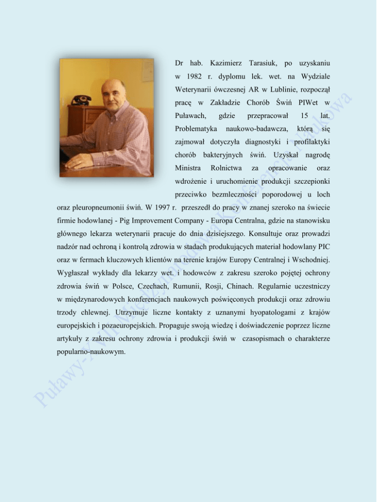 Dr hab. Kazimierz Tarasiuk, po uzyskaniu w 1982 r. dyplomu lek. wet. na Wydziale Weterynarii ówczesnej AR w Lublinie, rozpoczął pracę w Zakładzie Chorób Świń PIWet w Puławach, gdzie Problematyka przepracował naukowo-badawcza, 15 lat. którą się zajmował dotyczyła diagnostyki i profilaktyki chorób bakteryjnych świń. Uzyskał nagrodę Ministra Rolnictwa za opracowanie oraz wdrożenie i uruchomienie produkcji szczepionki przeciwko bezmleczności poporodowej u loch oraz pleuropneumonii świń. W 1997 r. przeszedł do pracy w znanej szeroko na świecie firmie hodowlanej - Pig Improvement Company - Europa Centralna, gdzie na stanowisku głównego lekarza weterynarii pracuje do dnia dzisiejszego. Konsultuje oraz prowadzi nadzór nad ochroną i kontrolą zdrowia w stadach produkujących materiał hodowlany PIC oraz w fermach kluczowych klientów na terenie krajów Europy Centralnej i Wschodniej. Wygłaszał wykłady dla lekarzy wet. i hodowców z zakresu szeroko pojętej ochrony zdrowia świń w Polsce, Czechach, Rumunii, Rosji, Chinach. Regularnie uczestniczy w międzynarodowych konferencjach naukowych poświęconych produkcji oraz zdrowiu trzody chlewnej. Utrzymuje liczne kontakty z uznanymi hyopatologami z krajów europejskich i pozaeuropejskich. Propaguje swoją wiedzę i doświadczenie poprzez liczne artykuły z zakresu ochrony zdrowia i produkcji świń w czasopismach o charakterze popularno-naukowym.