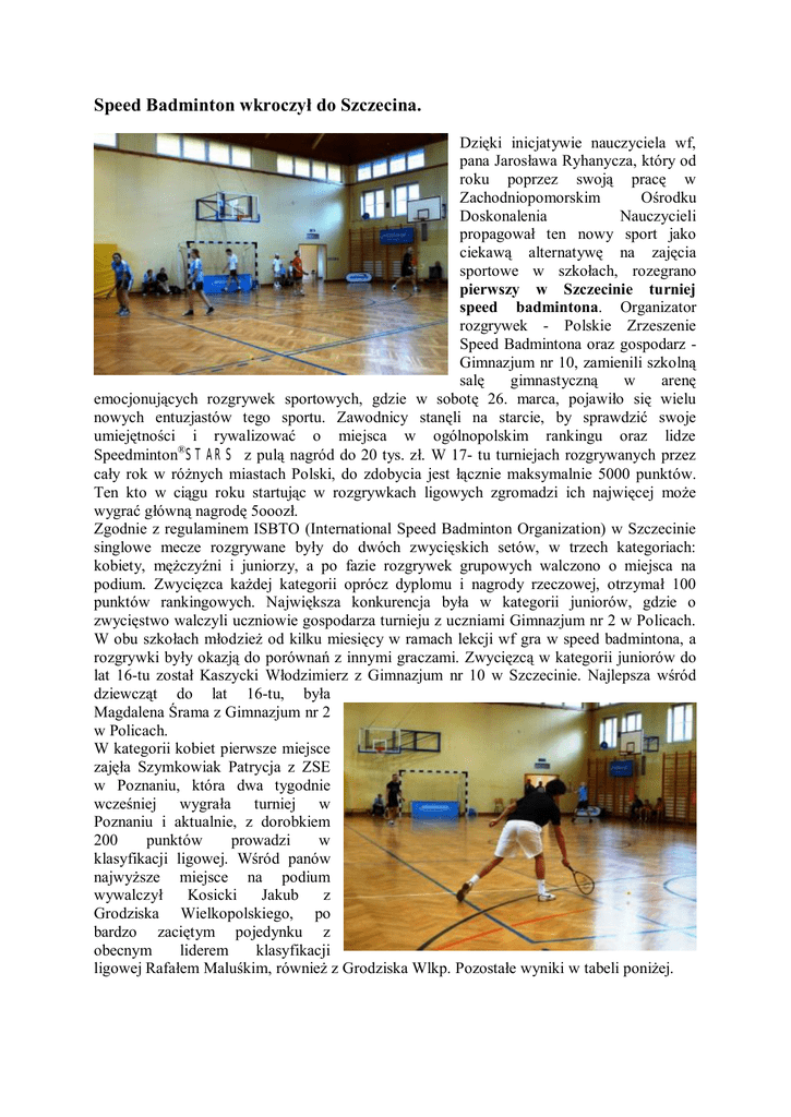 Speed Badminton wkroczył do Szczecina. Dzięki inicjatywie nauczyciela wf, pana Jarosława Ryhanycza, który od roku poprzez swoją pracę w Zachodniopomorskim Ośrodku Doskonalenia Nauczycieli propagował ten nowy sport jako ciekawą alternatywę na zajęcia sportowe w szkołach, rozegrano pierwszy w Szczecinie turniej speed badmintona. Organizator rozgrywek - Polskie Zrzeszenie Speed Badmintona oraz gospodarz Gimnazjum nr 10, zamienili szkolną salę gimnastyczną w arenę emocjonujących rozgrywek sportowych, gdzie w sobotę 26. marca, pojawiło się wielu nowych entuzjastów tego sportu. Zawodnicy stanęli na starcie, by sprawdzić swoje umiejętności i rywalizować o miejsca w ogólnopolskim rankingu oraz lidze Speedminton®STARS z pulą nagród do 20 tys. zł. W 17- tu turniejach rozgrywanych przez cały rok w różnych miastach Polski, do zdobycia jest łącznie maksymalnie 5000 punktów. Ten kto w ciągu roku startując w rozgrywkach ligowych zgromadzi ich najwięcej może wygrać główną nagrodę 5ooozł. Zgodnie z regulaminem ISBTO (International Speed Badminton Organization) w Szczecinie singlowe mecze rozgrywane były do dwóch zwycięskich setów, w trzech kategoriach: kobiety, mężczyźni i juniorzy, a po fazie rozgrywek grupowych walczono o miejsca na podium. Zwycięzca każdej kategorii oprócz dyplomu i nagrody rzeczowej, otrzymał 100 punktów rankingowych. Największa konkurencja była w kategorii juniorów, gdzie o zwycięstwo walczyli uczniowie gospodarza turnieju z uczniami Gimnazjum nr 2 w Policach. W obu szkołach młodzież od kilku miesięcy w ramach lekcji wf gra w speed badmintona, a rozgrywki były okazją do porównań z innymi graczami. Zwycięzcą w kategorii juniorów do lat 16-tu został Kaszycki Włodzimierz z Gimnazjum nr 10 w Szczecinie. Najlepsza wśród dziewcząt do lat 16-tu, była Magdalena Śrama z Gimnazjum nr 2 w Policach. W kategorii kobiet pierwsze miejsce zajęła Szymkowiak Patrycja z ZSE w Poznaniu, która dwa tygodnie wcześniej wygrała turniej w Poznaniu i aktualnie, z dorobkiem 200 punktów prowadzi w klasyfikacji ligowej. Wśród panów najwyższe miejsce na podium wywalczył Kosicki Jakub z Grodziska Wielkopolskiego, po bardzo zaciętym pojedynku z obecnym liderem klasyfikacji ligowej Rafałem Maluśkim, również z Grodziska Wlkp. Pozostałe wyniki w tabeli poniżej. VI Speedminton® Cup Polska Speedminton® STARS/ORSB Tournament – 100 RP 26.03.2011 Szczecin WYNIKI Miejsce 1. 2. 3-4. 5-8. Miejsce/ Place 1. 2. 3-4. 5-8. 9. -10. Mężczyźni Miejscowość Kobiety Miejscowość Kosicki Jakub (100rp) Maluśki Rafał (75rp) Brzozowski Grzegorz (50rp) Drukała Janusz (50rp) Ryhanycz Jarosław (30rp) Dudek Patryk (30rp) Korkosz Damian (30rp) Grodzisk Wlkp. Grodzisk Wlkp. Szczecin Szczecin Szczecin Grodzisk Wlkp. Poznań Szymkowiak Patrycja (100rp) Ledzianowska Anna (75rp) Bomirska Lidia (50rp) Serbak Weronika (50rp) Szczecińska Anna (30rp) Poznań Grodzisk Wlkp. Lipków Grodzisk Wlkp. Poznań Juniorzy (-16) Miejscowość Kaszycki Włodzimierz (100rp) Kosiński Konrad (75rp) Warachowski Michał (50rp) Izbicki Michał (50rp) Śrama Magdalena (30rp) Cyrankowska Aleksandra (30rp) Skotnicka Wioleta (30rp) Wójcik Angelika (30rp) Dulas Filip (20rp) Pabin Karol (20rp) Szczecin (Gim. Nr 10) Szczecin (Gim. Nr 10) Szczecin (Gim. Nr 10) Szczecin (Gim. Nr 10) Police (Gim. Nr 2) Police (Gim. Nr 2) Police (Gim. Nr 2) Police (Gim. Nr 2) Police (Gim. Nr 2) Police (Gim. Nr 2) www.speedbadminton.pl Polskie Zrzeszenie Speed Badmintona