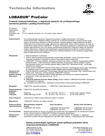 Technische Information LOBADUR® ProColor Preparat rozpuszczalnikowy, o łagodnym zapachu do profesjonalnego barwienia parkietu i podłóg drewnianych Nr artykułu: Opakowanie: Giscode: Zawartość sub. stałych: 11012 0,75 l G1 9 ± 4% zaleŜnie od koloru ,37 ± 3% kolory: biały i papirus Zastosowanie: Do profesjonalnego barwienia / bejcowania parkietu i podłóg drewnianych. Pod lakiery wodorozcieńczalne. Najlepsze efekty uzyskuje się na drewnie liściastym o grubych porach (dąb, jesion). Na kolorowym drewnie o drobnych porach i drewnie iglastym mogą uwidocznić się ślady szlifowania oraz powierzchnie mogą zabarwić się niejednolicie. Kolory moŜna mieszać ze sobą, do ® rozjaśniania naleŜy uŜywać LOBADUR ProColor transparent (bezbarwny). Właściwy kolor uŜytego drewna, jego struktura i pory oraz jakość wyszlifowanej powierzchni mają duŜy wpływ na uzyskany stopień zabarwienia. Zalecane jest kaŜdorazowe przeprowadzenia barwienia na próbce drewna z zachowaniem zaleceń dotyczących szlifowania i aplikacji preparatu w celu akceptacji osiągniętego stopnia zabarwienia przez inwestora. Wskazówki: • Materiał dokładnie wymieszać • Jeśli na większą powierzchnię potrzebne będzie kilka opakowań, naleŜy wymieszać razem zawartość wszystkich opakowań w jednym odpowiednio duŜym pojemniku ® • LOBADUR ProColor nakładać nierdzewną szpachlą do lakieru, następnie rozprowadzić polerką jednotarczową z LOBA specjalnym padem beŜowym. W przypadku starych podłóg z fugami alternatywnie moŜna uŜyć zamiast szpachli wałka LOBATOOL Microfaser 60-80 – rozcierając preparat (nie rolować). ® • przed uŜyciem LOBADUR ProColor Weiß (biały) na drewnach zawierających taninę (dąb), pozostawić do schnięcia przez noc, a następnie nanieść wałkiem jedną warstwę LOBADUR PrimaSeal. 1. PodłoŜe starannie wyszlifować. Przestrzegać zaleceń karty informacyjnej LOBA „NajwaŜniejszy jest ® ostatni szlif”. Odkurzyć, nanosić etapami LOBADUR ProColor. 2. Usuwać nadmiar materiału padem (LOBA specialny pad beŜowy) do uzyskania jednolitej 2 powierzchni. Jeden pad starcza na ok. 10 m . 3. Schnięcie. 4. Tylko przy aplikacji ProColor Weiss (biały) nałoŜyć wałkiem LOBADUR PrimaSeal i pozostawić do schnięcia na 2 godziny ® 4a. wszystkie pozostałe kolory - aplikacja 3 warstw lakieru wodorozcieńczalnego LOBADUR . Zalecenia dot. stosowania – parkiet i podłogi drewniane : Narzędzia: LOBATOOL szpachla metalowa Rozprowadzanie preparatu: ZuŜycie materiału: LOBATOOL specjalny pad beŜowy Czas schnięcia: Lakierowanie moŜliwe najwcześniej po upływie 12 godzin Matowienie: LOBADUR ProColor nie naleŜy matowić. Zalecane lakiery nawierzchniowe: Minimalizujące sklejanie kantów ® LOBADUR WS Global Rozcieńczalnik: Składowanie i transport: Szpachla: Wałek Mikrofaser 60-80: / LOBATOOL wałek Mikrofaser 60-80 25 - 30 ml/m² (25 - 40 m²/ l) 30 - 40 ml/m² (20 - 25 m²/ l) Kolory: biały i papirus zawsze ok. 50 ml/m² (20m²/l) ® DuŜe obciąŜenia ® Bardzo duŜe obciąŜenia ® LOBADUR WS EasyFinish LOBADUR WS 2K Supra ® ® LOBADUR WS Viva LOBADUR WS 2K Duo Materiał jest gotowy do uŜycia i nie naleŜy go rozcieńczać. Dla rozjaśnienia lub zmniejszenia stopnia ® krycia moŜna mieszać z LOBADUR ProColor transparent (bezbarwny) W warunkach chłodnych i suchych, nie wraŜliwy na przemroŜenie, 18 miesięcy w stabilnych warunkach, produkt nie jest niebezpieczny wg ADR, biały i papirus – niebezpieczne dla środowiska NaleŜy przestrzegać ogólnych zasad aplikacji prduktów silnie rozpuszczalnikowych LOBADUR LOBA GmbH & Co. KG Tel: +49 (0) 7156 357 220 Fax: + 49 (0) 7156 357 211 Mail: [email protected] Sporz: 15.12.2009 DK Loba-Wakol Polska Sp. z o.o. tel:+48 (22) 834 03 33 fax:+48 (22 )569 99 17 mail: [email protected]