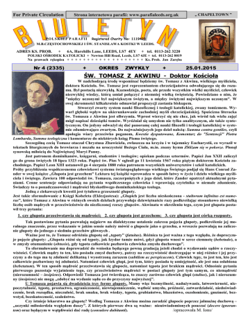 For Private Circulation Strona internetowa parafii: www.parafialeeds.org.uk P O L SK I E J P A R A F I I „ CHAPELTOWN ” Registered Charity No: 1119423 M.B.CZĘSTOCHOWSKIEJ I ŚW. STANISŁAWA KOSTKI W LEEDS. ADRES KS. PROB. + 6A, Harehills Lane, LEEDS, LS7 4EY + tel. 0113-262 3220 POLSKI OŚRODEK KATOLICKI + Newton Hill Road, Leeds, LS7 4JE + tel. 0113-262 8019 Na prawach rękopisu + + + + + + + + + + + + + + + + + + + Ks. Prob. Jan Zaręba Nr 4 (2335) + OKRES ZWYKŁY + 25.01.2015 ŚW. TOMASZ Z AKWINU - Doktor Kościoła W nadchodzącą środę wspominać będziemy św. Tomasz z Akwinu, wielkiego myśliciela, doktora Kościoła. Św. Tomasz jest reprezentantem chrześcijaństwa odwołującego się do rozumu. Był postacią niezwykłą. Kaznodzieja, poeta, ale przede wszystkim wielki myśliciel, człowiek niezwykłej wiedzy, którą umiał połączyć z niemniej wielką świętością. Powiedziano o nim, że "między uczonymi był największym świętym, a między świętymi największym uczonym". W swej skromności kilkakrotnie odmawiał propozycji zastania biskupem. Stworzył zwarty system nauki filozoficznej i teologii katolickiej, zwany tomizmem. Wywarł głęboki wpływ na ukierunkowanie zachodniej myśli chrześcijańskiej. Spuścizna literacka św. Tomasza z Akwinu jest olbrzymia. Wprost wierzyć się nie chce, jak wśród tak wielu zajęć mógł napisać dziesiątki tomów. Wyróżniał się umysłem nie tylko analitycznym, ale także syntetycznym. On jedyny odważył się dać panoramę całej nauki filozofii i teologii katolickiej w systemie zdumiewająco zwartym. Do najważniejszych jego dzieł należą: Summa contra gentiles, czyli apologia wiary przeciwko poganom, Kwestie dysputowane, Komentarz do "Sentencji" Piotra Lombarda, Summa teologiczna i komentarze do niektórych ksiąg Pisma świętego. Szczególną czcią Tomasz otaczał Chrystusa Zbawiciela, zwłaszcza na krzyżu i w tajemnicy Eucharystii, co wyraził w tekstach liturgicznych do brewiarza i mszału na uroczystość Bożego Ciała, m.in. znany hymn Zbliżam się w pokorze. Płonął synowską miłością do Najświętszej Maryi Panny. Jest patronem dominikanów, księgarni, studentów i teologów; opiekun podczas sztormów. Papież Jan XXII zaliczył go do grona świętych 18 lipca 1323 roku. Papież św. Pius V ogłosił go 11 kwietnia 1567 roku piątym doktorem Kościoła zachodniego. Papież Leon XIII ustanowił go 4 sierpnia 1880 roku patronem wszystkich uniwersytetów i szkół katolickich. Próby przybliżenia współczesnemu człowiekowi systemu światopoglądowego wielkiego Świętego podjął się Hans Conrad Zander w swej książce „Głupota jest grzechem” Lektura tej książki wprowadza w sposób łatwy w życie i dzieło wielkiego myśliciela i świętego. Zawiera 100 odpowiedzi św. Tomasza, zaczerpniętych z jego dzieł, które Zander opatrzył aktualnymi pytaniami. Cenne sentencje odpowiadają na pytania współczesnego człowieka i wprawiają czytelnika w niemałe zdumienie. Świadczy to o ponadczasowości i mądrości błyskotliwego dominikańskiego teologa. Jedną z ciekawszych kwestii jest tytułowa grzeszność głupoty. Jest takie sformułowanie z Księgi Koheleta (Eklezjastesa): „Głupich jest liczba nieskończona - stultorum infinitus est numerus”, które Tomasz z Akwinu w różnych swoich dziełach przywołuje dziewiętnaście razy podkreślając stosunkowo niewielką liczbę osób mądrych w przeciwieństwie do niezliczonej rzeszy głupców. Akwinata w określeniu tego, czym jest głupota postawił trzy pytania: 1. czy głupota przeciwstawia się mądrości; 2. czy głupota jest grzechem; 3. czy głupota jest córką rozpusty. Tak postawione pytania pozwalają najpierw na dialektyczne ustalenie zakresu pojęcia głupoty, podkreślenie jej moralnego znaczenie, przez wskazanie w jakim sensie należy mówić o głupocie jako o grzechu, a wreszcie pozwalają na zaliczenie głupoty do jednego z siedmiu grzechów głównych . Ważne jest to, że Tomasz odróżnia głupotę od „tępoty” (fatuitas). Różnica ta jest ważna z tego względu, że doprecyzuje pojęcie głupoty: „Głupota różni się od tępoty, jak Izydor tamże mówi, gdyż głupota wnosi w serce ciemnotę (hebetudo), a w zmysły otumanienie (obtusio), gdy tępota całkowicie pozbawia człowieka zmysłu duchowego”. To sformułowanie ma doprowadzić do wniosku będącego pewną gradacją jeżeli chodzi o wydawanie sądów o rzeczywistości. Człowiek mądry to ten, kto posiada zmysł duchowy, patrzy na rzeczywistość dostrzegając w niej różnice i jej przyczyny a do tego ma tę zdolność delikatną i wyostrzoną zarazem (subtilem ac perspicacem). Człowiek tępy, to jest ten, kto jest całkowicie pozbawiony tej zdolności. Natomiast człowiek głupi, jest tym, który posiada tę umiejętność, ale jest ona osłabiona (hebetatum). W ten sposób mądrość przeciwstawia się głupocie, natomiast tępota jest brakiem mądrości. Odnośnie pytania pierwszego pozostaje wyjaśnienie tego, czy przeciwieństwo mądrości w postaci głupoty jest tym samym, co niemądrość (nierozumność – insipiens). Odpowiedź Tomasza jest twierdząca, to znaczy zarówno człowiek głupi (stultus), jak i nierozumny (insipiens) nie mogą „zdobyć na wydanie sądu co do przyczyny najwyższej”. U Tomasza pojawia się dwadzieścia trzy formy głupoty. Mamy więc bezmyślność, nadużywanie, łatwowierność, niepoczytalność, tępotę, prostactwo, ograniczoność, niewtajemniczenie, wątłość umysłu, próżność, zatwardziałość, niedoświadczenie, brak rozsądku, nieczułość, brak smaku, brak wiedzy, tępota, grubiaństwo, błazeństwo, oszołomienie, gnuśność, bezwstyd, bezskuteczność, szaleństwo. Czy istnieje lekarstwo na głupotę? Według Tomasza z Akwinu można zaradzić głupocie poprzez jałmużnę duchową – „uczynki miłosierdzia względem duszy”. Z których pierwsze dwa są ważne: nieuświadomiony