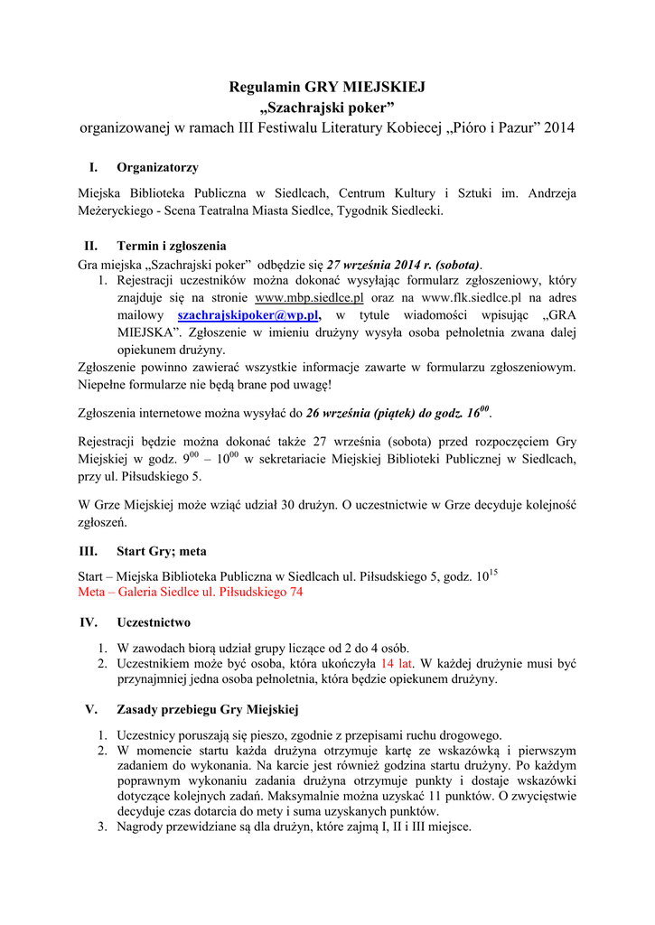 Regulamin GRY MIEJSKIEJ „Szachrajski poker” organizowanej w ramach III Festiwalu Literatury Kobiecej „Pióro i Pazur” 2014 I. Organizatorzy Miejska Biblioteka Publiczna w Siedlcach, Centrum Kultury i Sztuki im. Andrzeja Meżeryckiego - Scena Teatralna Miasta Siedlce, Tygodnik Siedlecki. II. Termin i zgłoszenia Gra miejska „Szachrajski poker” odbędzie się 27 września 2014 r. (sobota). 1. Rejestracji uczestników można dokonać wysyłając formularz zgłoszeniowy, który znajduje się na stronie www.mbp.siedlce.pl oraz na www.flk.siedlce.pl na adres mailowy [email protected], w tytule wiadomości wpisując „GRA MIEJSKA”. Zgłoszenie w imieniu drużyny wysyła osoba pełnoletnia zwana dalej opiekunem drużyny. Zgłoszenie powinno zawierać wszystkie informacje zawarte w formularzu zgłoszeniowym. Niepełne formularze nie będą brane pod uwagę! Zgłoszenia internetowe można wysyłać do 26 września (piątek) do godz. 1600. Rejestracji będzie można dokonać także 27 września (sobota) przed rozpoczęciem Gry Miejskiej w godz. 900 – 1000 w sekretariacie Miejskiej Biblioteki Publicznej w Siedlcach, przy ul. Piłsudskiego 5. W Grze Miejskiej może wziąć udział 30 drużyn. O uczestnictwie w Grze decyduje kolejność zgłoszeń. III. Start Gry; meta Start – Miejska Biblioteka Publiczna w Siedlcach ul. Piłsudskiego 5, godz. 1015 Meta – Galeria Siedlce ul. Piłsudskiego 74 IV. Uczestnictwo 1. W zawodach biorą udział grupy liczące od 2 do 4 osób. 2. Uczestnikiem może być osoba, która ukończyła 14 lat. W każdej drużynie musi być przynajmniej jedna osoba pełnoletnia, która będzie opiekunem drużyny. V. Zasady przebiegu Gry Miejskiej 1. Uczestnicy poruszają się pieszo, zgodnie z przepisami ruchu drogowego. 2. W momencie startu każda drużyna otrzymuje kartę ze wskazówką i pierwszym zadaniem do wykonania. Na karcie jest również godzina startu drużyny. Po każdym poprawnym wykonaniu zadania drużyna otrzymuje punkty i dostaje wskazówki dotyczące kolejnych zadań. Maksymalnie można uzyskać 11 punktów. O zwycięstwie decyduje czas dotarcia do mety i suma uzyskanych punktów. 3. Nagrody przewidziane są dla drużyn, które zajmą I, II i III miejsce. VI. Postanowienia ogólne 1. Wszyscy uczestnicy Gry Miejskiej „Szachrajski poker” muszą przestrzegać przepisów ruchu drogowego. 2. Uczestnicy ponoszą pełną odpowiedzialność za przestrzeganie zasad bezpieczeństwa podczas pokonywania trasy. 3. Organizatorzy nie ponoszą odpowiedzialności za szkody i czyny uczestników oraz osób trzecich. 4. Wszyscy uczestnicy startując w zawodach wyrażają zgodę na przetwarzanie danych osobowych do celów związanych z realizacją gry oraz do celów marketingowych organizatorów, patronów medialnych i sponsorów. Zapraszamy Organizatorzy