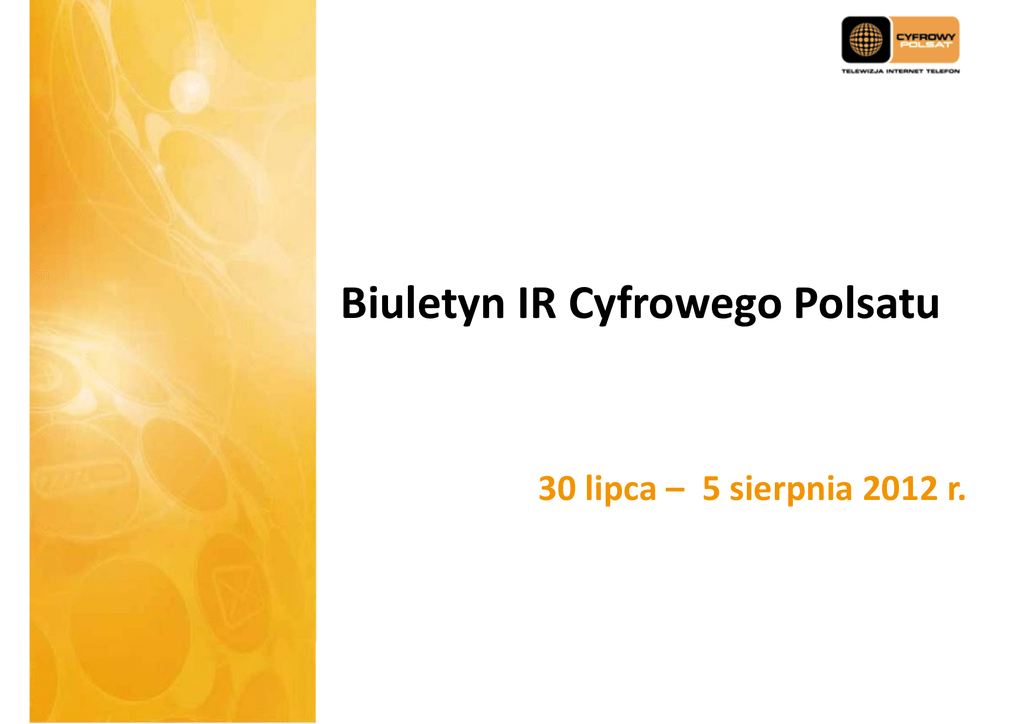 Biuletyn IR Cyfrowego Polsatu y y g 30 li 30 lipca – 5 i 5 sierpnia 2012 r. i 2012 Biuletyn Cyfrowego Polsatu Prasa o nas 30 lipca – 5 sierpnia 2012 Data Prasa o rynku TMT w Polsce 30 07 30.07 Puls Biznesu: Branson i Wejchert, Wejchert czyli Virgin po polsku Virgin Mobile wystartuje latem. O klientów może powalczyć ceną. Ma duże ambicje – z Polski chce uczynić przyczółek w regionie. ‐Uruchomienie telefonii komórkowej w Polsce stworzy platformę do rozwoju Virgin Mobile Central and Eastern Europe w Europie Środkowo‐ Wschodniej – podała spółka. O wejściu Virgin Mobile do Polski mówi się od pół roku, opóźnienie było spowodowane koniecznością zbudowania systemu dystrybucji. Virgin będzie budował usługi w Polsce w oparciu o współpracę hurtową z operatorem sieci Play. Virgin Mobile jest największym operatorem wirtualnym na świecie. świecie Działa w dziewięciu krajach. W Polsce na koniec ubiegłego roku 16 operatorów MVNO posiadało łącznie niecały 1‐proc. udział w rynku telefonii komórkowej. Parkiet: T‐Mobile ścigał się z Play O blisko 1,5 mln wzrosły od grudnia 2011 r. do końca czerwca 2012 r. bazy aktywnych kart SIM w sieciach komórkowych w Polsce – wynika z danych GUS. Półrocze to minęło na swoistym wyścigu, w którym na czoło peletonu we wszystkich kategoriach starała się przedostać Polska Telefonia Cyfrowa (T‐Mobile). Niewykluczone, że jej się to udało i w końcu drugiego kwartału zajęła pierwsze miejsce pod względem łącznej liczby SIM‐ów, przeganiając Orange. Komórkowa sieć grupy Telekomunikacji Polskiej powiększyła swoją bazę kart SIM o blisko 100 tys., do 14,8 mln. T‐Mobile może mieć ich 14,9‐15 mln. Między firmami trwa jednak medialna dyskusja na temat jakości wyniku T‐Mobile, który w ubiegłym roku metodologię naliczania aktywnych kart SIM. Biuletyn Cyfrowego Polsatu 30 lipca – 5 sierpnia 2012 Prasa o nas Data Puls Biznesu: Muzyka leci z chmury Piractwo muzyczne w Internecie przestaje się opłacać. Coraz łatwiej legalnie słuchać z chmury. Z danych Międzynarodowej Federacji Przemysłu Muzycznego (IFPI) wynika, że liczba osób korzystających z serwisów opartych na subskrypcji wzrosła w ubiegłym roku o 65 proc. do 13,4 mln. Będzie dużo więcej – francuski Deezer, jeden z liderów branży, dostępny jest niemal we wszystkich krajach świata, z wyjątkiem USA i Japonii. W Polsce z Deezerem o rynek chce powalczyć m.in. odpowiedzialna za telewizję internetową Ipla spółka Redefine. Jej przedstawiciele zastrzegają, że serwis Muzo.pl jest jeszcze „na wczesnym etapie rozwoju” i nie może się porównywać z zagranicznymi projektami. Ma już jednak około miliona plików muzycznych w bazie. ‐ Co kilka dni pojawiają się utwory z nowych albumów, które trafiają na rynek. Do końca roku, po sfinalizowaniu rozmów z kolejnymi wytwórniami, chcemy oferować 5 mln utworów – mówi Teresa Wierzbowska, rzecznik Redefine. 31 07 31.07 1.08 Prasa o rynku TMT w Polsce Rzeczpospolita: Właściciel CNN chce nadawać w Polsce Cyfrowy Polsat, TVN, TVP oraz amerykański nadawca Turner Broadcasting System (właściciel m.in. TCM, CNN i Cartoon Network) zasygnalizowały w ramach prowadzonych przez Krajową Radę Radiofonii i Telewizji konsultacji, konsultacji że są zainteresowane nadawaniem swoich kanałów w jednym z pakietów naziemnej telewizji cyfrowej (jej tzw. pierwszym multipleksie). Dziś w ramach tego pakietu nadawane są trzy kanały TVP oraz ATM Rozrywka TV, Polo TV, Eska TV i TTV. Amerykański Turner Broadcasting rozważa zgłoszenie kanału dziecięcego, a pozostali nadawcy nie podali informacji na temat planowanych kanałów. Konkurs mający wyłonić nowe cyfrowe stacje ma ruszyć jesienią tego roku. Biuletyn Cyfrowego Polsatu Prasa o nas 30 lipca – 5 sierpnia 2012 Data Prasa o rynku TMT w Polsce 1 08 1.08 Dziennik Gazeta Prawna: Sprzedaż Multimedia Polska po wakacjach We wrześniu zainteresowani przejęciem Multimedia Polska, drugiego co do wielkości operatora kablowego na polskim rynku, będą składać wiążące oferty – wynika z informacji dziennika. Teraz wszyscy prowadzą due diligence. Właściciele sieci wraz z prowadzącym transakcję bankiem JP Morgan dopuścili do niego cztery podmioty: Liberty Global, właściciel UPC Polska, a także trzy fundusze inwestycyjne – Cinven, Permira i amerykański LNK Partners. Analitycy za faworyta uważają UPC Polska, który przejęcie Multimediów traktuje jako kolejny etap konsolidacji rynku. rynku Parkiet: Euro 2012 osłabiło giełdowych nadawców Zarówno wpływy z reklam grupy TVN jak i Telewizji Polsat spadły r/r w II kwartale br. ‐ wynika z prognoz analityków. ‐ Druga połowa roku nie będzie już na rynku reklamy telewizyjnej tak słaba jak pierwsza, bo mamy już za sobą mistrzostwa Euro 2012, ale nadawcom może nie udać się odrobić straty z pierwszego półrocza ‐ mówi Sobiesław Pająk, analityk DM IDMSA. Eksperci zgodnie szacują spadek całego rynku reklamy telewizyjnej w II kwartale tego roku na około 10 proc. proc Puls Biznesu: Technicy nie liczą na zwyżki indeksów Giełdowi analitycy techniczni zapowiadają kontynuację trendu bocznego w notowaniach WIG20. Polecają akcje KGHM Orlenu i Kernela. KGHM, Kernela ‐ Na wyróżnienie zasługują też Cyfrowy Polsat i Kernel, a z mniejszych spółek uwagę zwraca Resbud – mówi analityk DM PKO BP. 2.08 Rzeczpospolita: Internet już w 7 mln domów Pierwsza połowa roku przyniosła wzrost liczby abonentów stacjonarnego dostępu do Internetu o 122 tys. i na koniec czerwca operatorzy obsługiwali 7 mln klientów ‐ szacuje TP S.A. S A Oznacza to, to że stacjonarny Internet jest w co drugim polskim domu. Operatorzy wskazują, że statystyki mogłyby być dużo wyższe. ‐ Czekamy na popyt – mówi Prezes Telekomunikacji Polskiej. Zgodnie z szacunkami Netii w zasięgu sieci stacjonarnego szerokopasmowego dostępu do Internetu