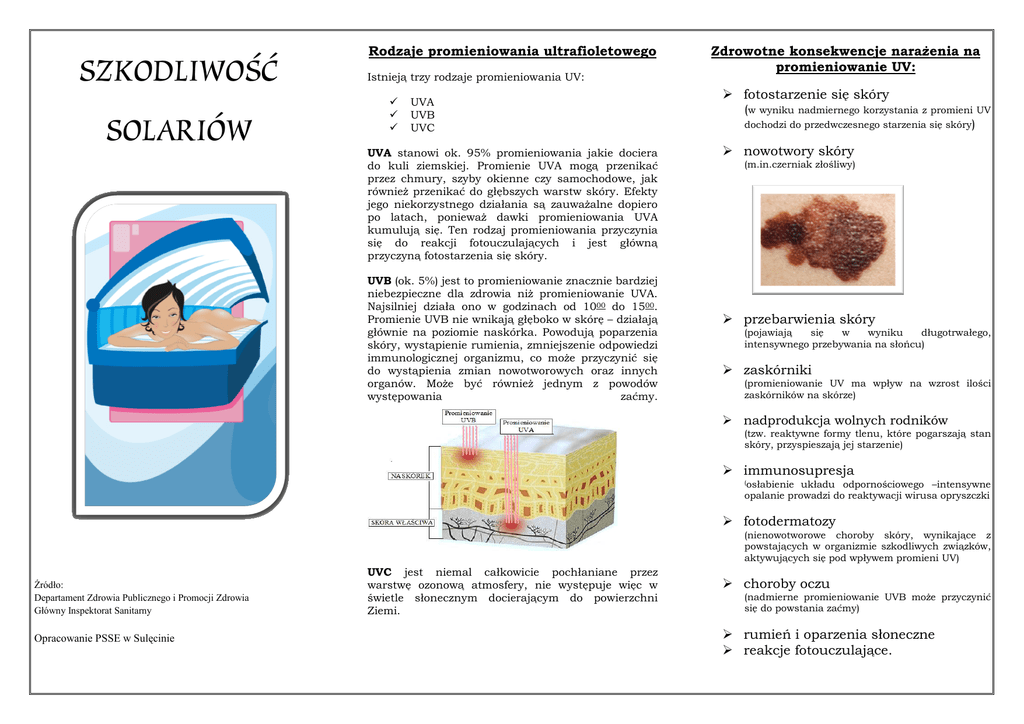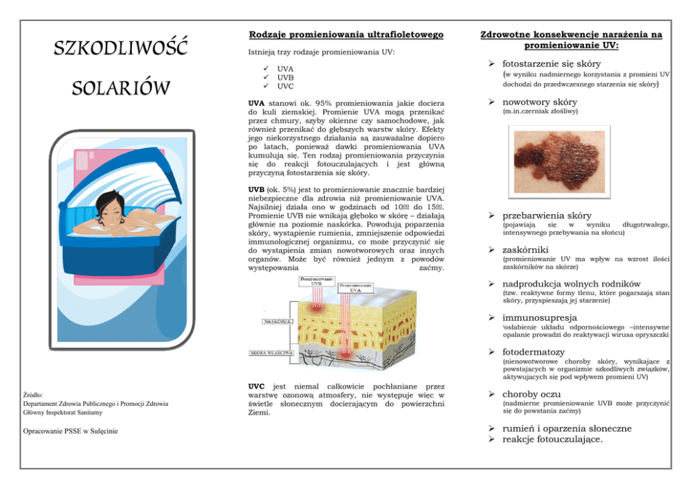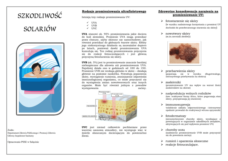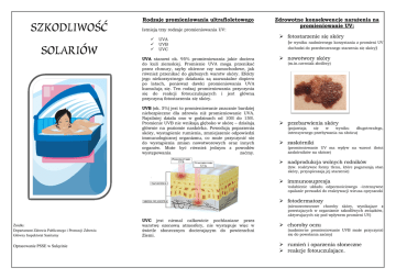SZKODLIWOŚĆ SOLARIÓW Rodzaje promieniowania ultrafioletowego Istnieją trzy rodzaje promieniowania UV: UVA UVB UVC UVA stanowi ok. 95% promieniowania jakie dociera do kuli ziemskiej. Promienie UVA mogą przenikać przez chmury, szyby okienne czy samochodowe, jak równieŜ przenikać do głębszych warstw skóry. Efekty jego niekorzystnego działania są zauwaŜalne dopiero po latach, poniewaŜ dawki promieniowania UVA kumulują się. Ten rodzaj promieniowania przyczynia się do reakcji fotouczulających i jest główną przyczyną fotostarzenia się skóry. UVB (ok. 5%) jest to promieniowanie znacznie bardziej niebezpieczne dla zdrowia niŜ promieniowanie UVA. Najsilniej działa ono w godzinach od 1000 do 1500. Promienie UVB nie wnikają głęboko w skórę – działają głównie na poziomie naskórka. Powodują poparzenia skóry, wystąpienie rumienia, zmniejszenie odpowiedzi immunologicznej organizmu, co moŜe przyczynić się do wystąpienia zmian nowotworowych oraz innych organów. MoŜe być równieŜ jednym z powodów występowania zaćmy. Zdrowotne konsekwencje naraŜenia na promieniowanie UV: fotostarzenie się skóry (w wyniku nadmiernego korzystania z promieni UV dochodzi do przedwczesnego starzenia się skóry) nowotwory skóry (m.in.czerniak złośliwy) przebarwienia skóry (pojawiają się w wyniku długotrwałego, intensywnego przebywania na słońcu) zaskórniki (promieniowanie UV ma wpływ na wzrost ilości zaskórników na skórze) nadprodukcja wolnych rodników (tzw. reaktywne formy tlenu, które pogarszają stan skóry, przyspieszają jej starzenie) immunosupresja (osłabienie układu odpornościowego –intensywne opalanie prowadzi do reaktywacji wirusa opryszczki fotodermatozy (nienowotworowe choroby skóry, wynikające z powstających w organizmie szkodliwych związków, aktywujących się pod wpływem promieni UV) Źródło: Departament Zdrowia Publicznego i Promocji Zdrowia Główny Inspektorat Sanitarny Opracowanie PSSE w Sulęcinie UVC jest niemal całkowicie pochłaniane przez warstwę ozonową atmosfery, nie występuje więc w świetle słonecznym docierającym do powierzchni Ziemi. choroby oczu (nadmierne promieniowanie UVB moŜe przyczynić się do powstania zaćmy) rumień i oparzenia słoneczne reakcje fotouczulające. Zalecane środki chroniące przed nadmiernym promieniowaniem UV (wg WHO) naleŜy ograniczyć czas przebywania w słońcu szczególnie koło południa, w godz. 10:00-14:00, naleŜy robić przerwy w opalaniu się, częściej przebywać w cieniu, naleŜy nosić ubrania ochronne, bawełniane, nie eksponować całego ciała, szczególnie chronić: oczy, twarz, szyję, naleŜy nosić okulary przeciwsłoneczne z panelami bocznymi, które stanowią 99-100% ochrony przed UVA i UVB dla oczu, naleŜy uŜywać kremów ochronnych o szerokim spektrum ochrony przeciwsłonecznej, filtry słoneczne nie powinny być jednak wykorzystywane do wydłuŜania czasu spędzonego na słońcu, naleŜy unikać korzystania ze sztucznego promieniowania UV w solariach. WHO zaleca wprowadzenie zakazu ich stosowania przez młodzieŜ w wieku szkolnym, naleŜy chronić niemowlęta i dzieci juŜ od najmłodszych lat i uczyć je wraz z wiekiem racjonalnego korzystania ze słońca. Zasady racjonalnego korzystania z solariów (wg WHO) Nie zaleca się korzystania z solariów osobom: z fenotypem I i II, z licznymi znamionami barwnikowymi na skórze, z duŜą ilością piegów, z oparzeniami słonecznymi w dzieciństwie. KORZYSTANIE Z SOLARIUM Zdecydowanie nie powinny opalać się w solarium osoby: poniŜej 18 roku Ŝycia, ze stanami przednowotworowymi lub nowotworami skóry, ze skórą uszkodzoną przez słońce, przyjmujące leki uwraŜliwiające na promieniowanie UV JEST GŁÓWNYM CZYNNIKIEM KANCEROGENNYM!!!