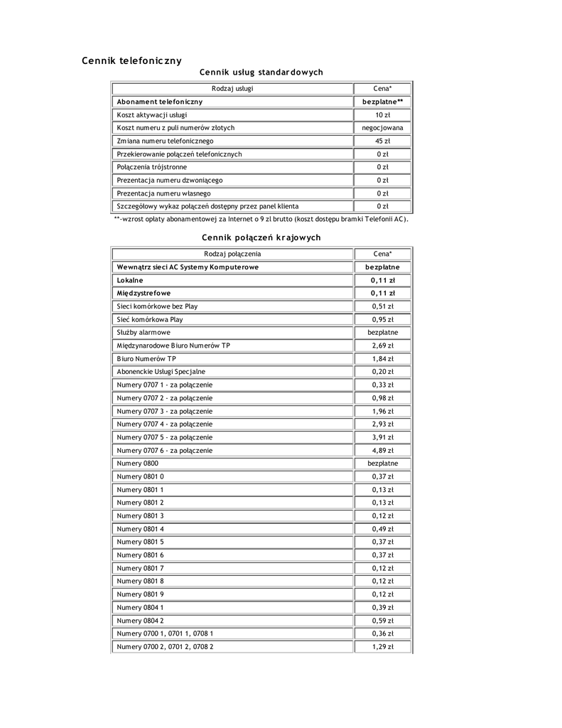 Cennik telefo nic zny Cennik usług standar do w ych Rodzaj usługi Abo nament telefoniczny Cena* bezplatne** Koszt aktywacji usługi 10 zł Koszt num eru z puli num erów złotych negocjowana Zm iana num eru telefonicznego 45 zł Przekierowanie połączeń telefonicznych 0 zł Połączenia trójstronne 0 zł Prezentacja num eru dzwoniącego 0 zł Prezentacja num eru własnego 0 zł Szczegółowy wykaz połączeń dostępny przez panel klienta 0 zł **-wzrost opłaty abonam entowej za Internet o 9 zl brutto (koszt dostępu bram ki Telefonii AC). Cennik po łączeń k r ajo w ych Rodzaj połączenia Wewnątrz sieci AC Systemy Ko mputero we Cena* bezpłatne Lo kalne 0,11 zł Międzystrefowe 0,11 zł Sieci kom órkowe bez Play 0,51 zł Sieć kom órkowa Play 0,95 zł Służby alarm owe Międzynarodowe B iuro Num erów TP bezpłatne 2,69 zł B iuro Num erów TP 1,84 zł Abonenckie Usługi Specjalne 0,20 zł Num ery 0707 1 - za połączenie 0,33 zł Num ery 0707 2 - za połączenie 0,98 zł Num ery 0707 3 - za połączenie 1,96 zł Num ery 0707 4 - za połączenie 2,93 zł Num ery 0707 5 - za połączenie 3,91 zł Num ery 0707 6 - za połączenie Num ery 0800 4,89 zł bezpłatne Num ery 0801 0 0,37 zł Num ery 0801 1 0,13 zł Num ery 0801 2 0,13 zł Num ery 0801 3 0,12 zł Num ery 0801 4 0,49 zł Num ery 0801 5 0,37 zł Num ery 0801 6 0,37 zł Num ery 0801 7 0,12 zł Num ery 0801 8 0,12 zł Num ery 0801 9 0,12 zł Num ery 0804 1 0,39 zł Num ery 0804 2 0,59 zł Num ery 0700 1, 0701 1, 0708 1 0,36 zł Num ery 0700 2, 0701 2, 0708 2 1,29 zł Num ery 0700 3, 0701 2, 0708 3 2,07 zł Num ery 0700 4, 0701 4, 0708 4 2,57 zł Num ery 0700 5, 0701 5, 0708 5 3,66 zł Num ery 0700 6, 0701 6, 0708 6 4,23 zł Num ery 0700 7, 0701 7, 0708 7 4,88 zł Num ery 0700 8, 0701 8, 0708 8 7,63 zł Num ery 0700 9, 0701 9, 0708 9 - za połączenie 9,91 zł Cennik po łączeń m iędzynar odo w ych Państwo Cena* A Afganistan 2,83 zł Alaska 0,14 zł Albania 1,05 zł Algieria 0,94 zł Andora 0,34 zł Andora - tel. kom . 1,60 zł Angola 1,74 zł Anguilla 1,74 zł Antarktyda 7,63 zł Antigua i B arbuda 0,82 zł Antigua i B arbuda audiotext 2,02 zł Antyle Holenderskie 0,94 zł Arabia Saudyjska 1,60 zł Argentyna 0,34 zł Argentyna - tel. kom . 1,01 zł Arm enia 1,15 zł Arm enia - tel. kom . 1,74 zł Aruba 1,15 zł Australia 0,17 zł Australia - tel. kom . 0,94 zł Austria 0,12 zł Austria - tel. kom . 1,40 zł Azerbejdżan 1,05 zł B B aham y 0,82 zł B ahrajn 0,82 zł B angladesz 0,47 zł B arbados 1,47 zł Belgia 0,12 zł B elgia - tel. kom . 2,16 zł B elize 1,88 zł B enin 0,47 zł B erm udy 0,82 zł B hutan 1,01 zł B iałoruś 1,15 zł B iałoruś - tel. kom . 1,34 zł B oliwia 0,94 zł B ośnia 0,94 zł B ośnia - tel. kom . 1,88 zł B otswana 1,47 zł B razylia 0,47 zł B razylia - tel. kom . 1,50 zł B runei Darussalam 1,47 zł B ułgaria 0,55 zł B ułgaria - tel. kom . 1,74 zł B urkina Faso 1,27 zł B urundi 1,74 zł C Centralna Republika Afryki 1,74 zł Chile 0,15 zł Chile - tel. kom . 0,94 zł Chile Prem ium 1,21 zł Chiny 0,17 zł Chorwacja 0,34 zł Chorwacja - tel. kom . 1,47 zł Cypr 0,20 zł Cypr - tel. kom . 0,47 zł Czad 2,16 zł Czarnogóra 0,82 zł Czarnogóra - tel. kom . 1,47 zł Czechy 0,17 zł Czechy - tel. kom . 1,01 zł D Dania 0,12 zł Dania - tel. kom . 1,47 zł Diego Garcia 10,50 zł Dom inika 2,16 zł Dżibuti 2,83 zł E Egipt 0,94 zł Ekwador 0,82 zł Ekwador - tel. kom . 1,15 zł Em sat 18,96 zł Erytrea 2,83 zł Estonia 0,16 zł Estonia - tel. kom . 1,74 zł Etiopia 2,83 zł F Falklandy 5,23 zł Fidżi 2,22 zł Fidżi audiotext 2,88 zł Filipiny 0,94 zł Finlandia 0,20 zł Finlandia - tel. kom . 1,27 zł Francja 0,12 zł Francja - tel. kom . 0,94 zł Francja Prem ium 0,17 zł G Gabon 1,15 zł Gam bia 1,01 zł Ghana 1,15 zł Gibraltar 0,20 zł Gibraltar - tel. kom . 1,88 zł Globalstar 14,41 zł Grecja 0,17 zł Grecja - tel. kom . 1,60 zł Grenada 1,88 zł Grenlandia 5,23 zł Gruzja 0,55 zł Gruzja - tel. kom . 0,94 zł Guam 0,55 zł Gujana 2,22 zł Gujana Francuska 2,69 zł Gujana Francuska - tel. kom . 1,74 zł Gujana Prem ium 2,61 zł Gwadelupa 3,59 zł Gwatem ala 1,47 zł Gwinea 1,74 zł Gwinea B issau 5,23 zł Gwinea Równikowa 2,16 zł H Haiti 1,60 zł Hawaje 0,19 zł Hiszpania 0,12 zł Hiszpania - tel. kom . 1,74 zł Hiszpania Prem ium 0,16 zł Ho landia 0,12 zł Holandia - tel. kom . 1,34 zł Honduras 2,22 zł Hong Kong 0,12 zł I Indie 0,94 zł Indonezja 1,01 zł Indonezja - tel. kom . 1,15 zł Inm arsat Atlantyk Wschodni A 20,85 zł Inm arsat Atlantyk Wschodni M 6,83 zł Inm arsat Atlantyk Wschodni MM 5,69 zł Inm arsat Atlantyk Zachodni A 20,85 zł Inm arsat Atlantyk Zachodni M 6,83 zł Inm arsat Atlantyk Zachodni MM 5,69 zł Inm arsat Indyjski A 20,85 zł Inm arsat Indyjski M 6,83 zł Inm arsat Indyjski MM 5,69 zł Inm arsat Pacyfik A 20,85 zł Inm arsat Pacyfik M 6,83 zł Inm arsat Pacyfik MM 5,69 zł INMARSAT SNAC MM 5,69 zł Irak 2,22 zł Iran 1,01 zł Iridium 16,53 zł Irlandia 0,15 zł Irlandia - tel. kom . 1,28 zł Islandia 0,19 zł Islandia - tel. kom . 1,50 zł Izrael 0,17 zł Izrael - tel. kom . 1,20 zł J Jam ajka 1,74 zł Japonia 0,20 zł Japonia - tel. kom . 2,16 zł Jem en 1,01 zł Jordania 1,27 zł K Kajm any 1,47 zł Kam bodża 2,22 zł Kam erun 0,94 zł Kanada 0,12 zł Katar 2,22 zł Kazachstan 1,93 zł Kazachstan - tel. kom . 2,16 zł Kenia 1,60 zł Kirgistan 2,16 zł Kiribati 5,23 zł Kolum bia 0,55 zł Kolum bia - tel. kom . 1,01 zł Kom ory 2,22 zł Kongo 1,88 zł Kongo Republika Dem okratyczna 2,22 zł Korea Południowa 0,19 zł Korea Południowa - tel. kom . 0,47 zł Korea Północna 5,23 zł Kostaryka 0,47 zł Kuba 6,28 zł Kuwejt 1,15 zł L Laos 2,16 zł Lesotho 1,47 zł Liban 1,01 zł Liban - tel. kom . 1,47 zł Liberia 1,74 zł Libia 1,34 zł Liechtenstein 0,34 zł Liechtenstein - tel. kom . 5,23 zł Litwa 0,47 zł Litwa - tel. kom . 1,05 zł Luksem burg 0,17 zł Luksem burg - tel. kom . 1,50 zł Ł Łotwa 0,82 zł Łotwa - tel. kom . 1,50 zł M M