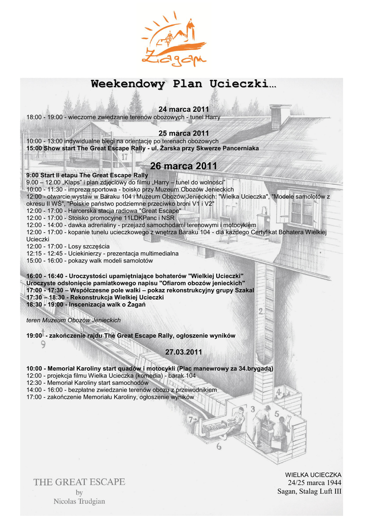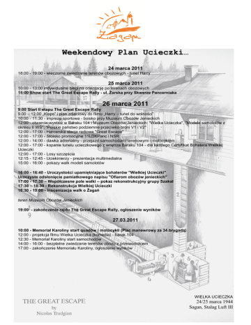 Weekendowy Plan Ucieczki… 24 marca 2011 18:00 - 19:00 - wieczorne zwiedzanie terenów obozowych - tunel Harry 25 marca 2011 10:00 - 13:00 indywidualne biegi na orientację po terenach obozowych 15:00 Show start The Great Escape Rally - ul. Żarska przy Skwerze Pancerniaka 26 marca 2011 9:00 Start II etapu The Great Escape Rally 9.00 – 12.00 „Klaps” i plan zdjęciowy do filmu „Harry – tunel do wolności” 10:00 - 11:30 - impreza sportowa - boisko przy Muzeum Obozów Jenieckich 12:00 - otwarcie wystaw w Baraku 104 i Muzeum Obozów Jenieckich: "Wielka Ucieczka", "Modele samolotów z okresu II WŚ", "Polskie państwo podziemne przeciwko broni V1 i V2" 12:00 - 17:00 - Harcerska stacja radiowa "Great Escape" 12:00 - 17:00 - Stoisko promocyjne 11LDKPanc i NSR 12:00 - 14:00 - dawka adrenaliny - przejazd samochodami terenowymi i motocyklem 12:00 - 17:00 - kopanie tunelu ucieczkowego z wnętrza Baraku 104 - dla każdego Certyfikat Bohatera Wielkiej Ucieczki 12:00 - 17:00 - Losy szczęścia 12:15 - 12:45 - Uciekinierzy - prezentacja multimedialna 15:00 - 16:00 - pokazy walk modeli samolotów 16:00 - 16:40 - Uroczystości upamiętniające bohaterów "Wielkiej Ucieczki" Uroczyste odsłonięcie pamiatkowego napisu "Ofiarom obozów jenieckich" 17:00 - 17:30 – Współczesne pole walki – pokaz rekonstrukcyjny grupy Szakal 17:30 – 18:30 - Rekonstrukcja Wielkiej Ucieczki 18:30 - 19:00 - Inscenizacja walk o Żagań teren Muzeum Obozów Jenieckich 19:00 - zakończenie rajdu The Great Escape Rally, ogłoszenie wyników 27.03.2011 10:00 - Memoriał Karoliny start quadów i motocykli (Plac manewrowy za 34.brygadą) 12:00 - projekcja filmu Wielka Ucieczka (komedia) - barak 104 12:30 - Memoriał Karoliny start samochodów 14:00 - 16:00 - bezpłatne zwiedzanie terenów obozu z przewodnikiem 17:00 - zakończenie Memoriału Karoliny, ogłoszenie wyników WIELKA UCIECZKA 24/25 marca 1944 Sagan, Stalag Luft III
