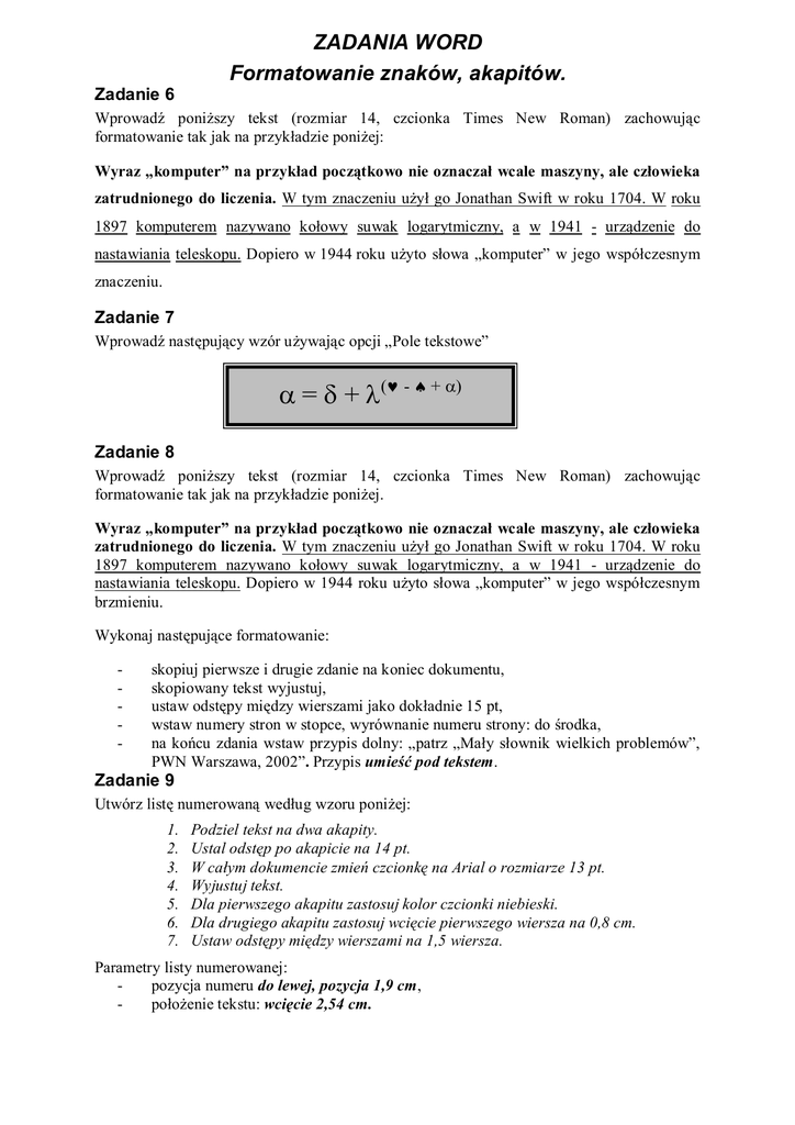 ZADANIA WORD Formatowanie znaków, akapitów. Zadanie 6 Wprowadź poniższy tekst (rozmiar 14, czcionka Times New Roman) zachowując formatowanie tak jak na przykładzie poniżej: Wyraz „komputer” na przykład początkowo nie oznaczał wcale maszyny, ale człowieka zatrudnionego do liczenia. W tym znaczeniu użył go Jonathan Swift w roku 1704. W roku 1897 komputerem nazywano kołowy suwak logarytmiczny, a w 1941 - urządzenie do nastawiania teleskopu. Dopiero w 1944 roku użyto słowa „komputer” w jego współczesnym znaczeniu. Zadanie 7 Wprowadź następujący wzór używając opcji „Pole tekstowe” α = δ + λ(♥ - ♠ + α) Zadanie 8 Wprowadź poniższy tekst (rozmiar 14, czcionka Times New Roman) zachowując formatowanie tak jak na przykładzie poniżej. Wyraz „komputer” na przykład początkowo nie oznaczał wcale maszyny, ale człowieka zatrudnionego do liczenia. W tym znaczeniu użył go Jonathan Swift w roku 1704. W roku 1897 komputerem nazywano kołowy suwak logarytmiczny, a w 1941 - urządzenie do nastawiania teleskopu. Dopiero w 1944 roku użyto słowa „komputer” w jego współczesnym brzmieniu. Wykonaj następujące formatowanie: - skopiuj pierwsze i drugie zdanie na koniec dokumentu, skopiowany tekst wyjustuj, ustaw odstępy między wierszami jako dokładnie 15 pt, wstaw numery stron w stopce, wyrównanie numeru strony: do środka, na końcu zdania wstaw przypis dolny: „patrz „Mały słownik wielkich problemów”, PWN Warszawa, 2002”. Przypis umieść pod tekstem. Zadanie 9 Utwórz listę numerowaną według wzoru poniżej: 1. 2. 3. 4. 5. 6. 7. Podziel tekst na dwa akapity. Ustal odstęp po akapicie na 14 pt. W całym dokumencie zmień czcionkę na Arial o rozmiarze 13 pt. Wyjustuj tekst. Dla pierwszego akapitu zastosuj kolor czcionki niebieski. Dla drugiego akapitu zastosuj wcięcie pierwszego wiersza na 0,8 cm. Ustaw odstępy między wierszami na 1,5 wiersza. Parametry listy numerowanej: pozycja numeru do lewej, pozycja 1,9 cm, położenie tekstu: wcięcie 2,54 cm.
