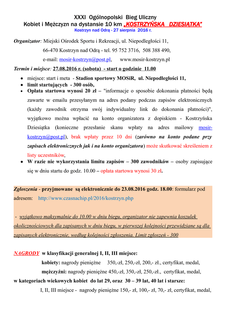 XXXI Ogólnopolski Bieg Uliczny Kobiet i Mężczyzn na dystansie 10 km „KOSTRZYŃSKA DZIESIĄTKA” Kostrzyn nad Odrą - 27 sierpnia 2016 r. Organizator: Miejski Ośrodek Sportu i Rekreacji, ul. Niepodległości 11, 66-470 Kostrzyn nad Odrą - tel. 95 752 3716, 508 388 490, e-mail: [email protected], www.mosir-kostrzyn.pl Termin i miejsce: 27.08.2016 r. (sobota) - start o godzinie 11.00 miejsce: start i meta - Stadion sportowy MOSiR, ul. Niepodległości 11, limit startujących - 300 osób, Opłata startowa wynosi 20 zł – "informacje o sposobie dokonania płatności będą zawarte w emailu przesyłanym na adres podany podczas zapisów elektronicznych (każdy zawodnik otrzyma swój indywidualny link do dokonania płatności)", wyjątkowo można wpłacić na konto organizatora z dopiskiem - Kostrzyńska Dziesiątka (konieczne przesłanie skanu wpłaty na adres mailowy mosir- [email protected]), brak wpłaty przez 10 dni (zarówno na konto podane przy zapisach elektronicznych jak i na konto organizatora) może skutkować skreśleniem z listy uczestników, W razie nie wykorzystania limitu zapisów – 300 zawodników – osoby zapisujące się w dniu startu do godz. 10.00 – opłata startowa wynosi 30 zł. Zgłoszenia - przyjmowane są elektronicznie do 23.08.2016 godz. 18.00: formularz pod adresem: http://www.czasnachip.pl/2016/kostrzyn.php - wyjątkowo maksymalnie do 10.00 w dniu biegu, organizator nie zapewnia koszulek okolicznościowych dla zapisanych w dniu biegu, w pierwszej kolejności przewidziane są dla zapisanych elektronicznie, według kolejności zgłoszenia. Limit zgłoszeń - 300 NAGRODY w klasyfikacji generalnej I, II, III miejsce: kobiety: nagrody pieniężne 350,-zł, 250,-zł, 200,- zł., certyfikat, medal, mężczyźni: nagrody pieniężne 450,-zł, 350,-zł, 250,-zł., certyfikat, medal, w kategoriach wiekowych kobiet do lat 29, oraz 30 – 39 lat, 40 lat i starsze: I, II, III miejsce - nagrody pieniężne 150,- zł, 100,- zł, 70,- zł, certyfikat, medal, w kategoriach wiekowych mężczyzn: do lat 29 lat, 30 - 39, 40 - 49, 50 - 59, 60 - 69, 70 - 79 lat oraz 80 lat i starsi: I, II, III miejsce - nagrody pieniężne 150,- zł, 100,- zł, 70,- zł, certyfikat, medal, Niepełnosprawni na wózkach: I m 150,- zł, II - 100, zł, III - 70,- zł, certyfikat, medal, Najlepsi Kostrzynianie K i M do lat 39, 40-59 oraz 60 lat i więcej (wymagane stałe zameldowanie w Kostrzynie nad Odrą): I m - 150,- zł, II - 100,- zł, III - 70,- zł, certyfikat, medal. Nagrodzeni w kategorii generalnej nie otrzymują nagród w kategoriach wiekowych. Uwagi końcowe: Uczestnicy biegu ubezpieczają się od nieszczęśliwych wypadków we własnym zakresie. Organizator nie zapewnia nieszczęśliwych wypadków, nie ponosi żadnej zdrowotne oraz za rzeczy zaginione. ubezpieczenia uczestników z tytułu odpowiedzialności za przeciwwskazania Wszyscy uczestnicy biegu nagrodzeni zostaną okolicznościowymi koszulkami dla zapisanych elektronicznie według kolejności zgłoszenia (będą przydzielane rozmiarem, max miesiąc przed startem później według pozostałych rozmiarów), wśród startujących zostanie rozlosowanych 50 nagród rzeczowych. Organizator zapewnia ciepły posiłek, szatnie i umywalnie dla potrzeb uczestników biegu będą czynne na terenie hali sportowej MOSiR przy ul. Niepodległości 11. Ważne: Zgłoszenia przyjmowane są elektronicznie do 23.08.2016 godz. 18.00: formularz pod adresem: http://www.czasnachip.pl/2016/kostrzyn.php wyjątkowo maksymalnie do 10.00 w dniu biegu, w przypadku zapisów w dniu zawodów organizator nie zapewnia koszulek okolicznościowych, w pierwszej kolejności przewidziane są dla zapisanych elektronicznie, według kolejności zgłoszenia – ilość ograniczona. Limit zgłoszeń - 300 ZAPRASZAMY DO UDZIAŁU W NASZYM BIEGU ! Dyrektor MOSiR Zygmunt Mendelski