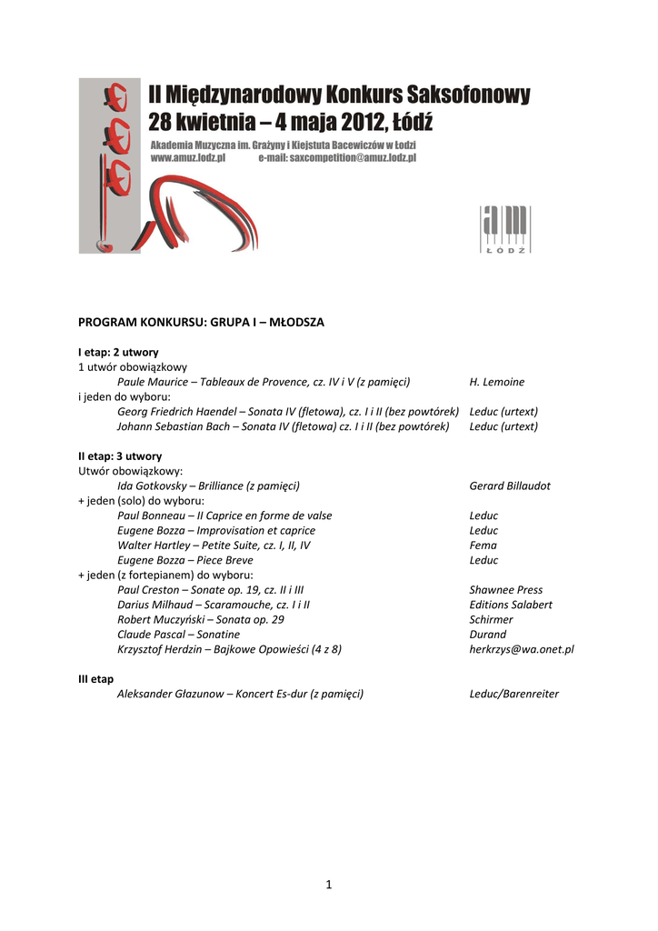 PROGRAM KONKURSU: GRUPA I – MŁODSZA I etap: 2 utwory 1 utwór obowiązkowy Paule Maurice – Tableaux de Provence, cz. IV i V (z pamięci) H. Lemoine i jeden do wyboru: Georg Friedrich Haendel – Sonata IV (fletowa), cz. I i II (bez powtórek) Leduc (urtext) Johann Sebastian Bach – Sonata IV (fletowa) cz. I i II (bez powtórek) Leduc (urtext) II etap: 3 utwory Utwór obowiązkowy: Ida Gotkovsky – Brilliance (z pamięci) + jeden (solo) do wyboru: Paul Bonneau – II Caprice en forme de valse Eugene Bozza – Improvisation et caprice Walter Hartley – Petite Suite, cz. I, II, IV Eugene Bozza – Piece Breve + jeden (z fortepianem) do wyboru: Paul Creston – Sonate op. 19, cz. II i III Darius Milhaud – Scaramouche, cz. I i II Robert Muczyński – Sonata op. 29 Claude Pascal – Sonatine Krzysztof Herdzin – Bajkowe Opowieści (4 z 8) Gerard Billaudot Leduc Leduc Fema Leduc Shawnee Press Editions Salabert Schirmer Durand [email protected] III etap Aleksander Głazunow – Koncert Es-dur (z pamięci) 1 Leduc/Barenreiter PROGRAM KONKURSU: GRUPA II – STARSZA I etap: 2 utwory (1 z pamięci) 1 utwór obowiązkowy: Piet Swerts – Klonos Ascolta + 1 do wyboru: Carl Philipp Emanuel Bach – Sonata a-moll na flet solo, cz. I i II (bez powtórek) urtext/VEB F. Hofmeister, Musikverlag, Leipzig Johann Sebastian Bach – Partita a-moll na flet solo cz.I i II (bez powtórek) urtext/Peters II etap: 3 utwory (1 z pamięci) 1 utwór obowiązkowy: Ida Gotkovsky – Variations Pathetique, cz. 6 + 1 (solo) do wyboru: Luciano Berio – Sequenza IXb Luciano Berio – Sequenza VIIb (sopran) Ryo Noda – Improwizacje (2 z 3) Christian Lauba – Etiuda (jedna do wyboru) Giacinto Scelsi – Tre pezzi Karlheinz Stockhausen – In Freundschaft Fuminori Tanada – Mysterious Morning III (sopran) + 1 (z fortepianem) do wyboru: Jean Absil – Sonate Roger Boutry – Divertimento Jacques Charpentier – Gavambodi II Philip Decruck – Sonate Edison Denisov – Sonate Alfred Desenclos – Prelude, Cadence et Finale Andrzej Dutkiewicz – Danse Triste Frank Martin – Ballade Boris Mersson – Fantasia Henri Sauget – Sonatine bucolique Florent Schmitt – Legende op. 66 Erwin Schulhoff – Hot Sonate Heitor Villa Lobos – Fantasia (soprano) Takashi Yoshimatsu – Fuzzy Bird Sonata Phil Woods – Sonata III etap: 2 utwory Utwór obowiązkowy: Roman Palester – Concertino + 1 do wyboru (z pamięci): Aleksander Głazunow – Concerto Jacques Ibert – Concertino da camera Lars-Erik Larsson – Koncert, cz. II i III Gerard Billaudot UE UE UE J. M. Fuzeau Salabert Stockhausen Verlag H. Lemoine H. Lemoine Leduc Leduc Gerard Billaudot Leduc Leduc PWM UE E. Albert J.Kunzelmann Leduc Durand Schott Peer Verlag Gerard Billaudot Kendor/advance PWM Leduc/Barenreiter Leduc Gehrmans 2
