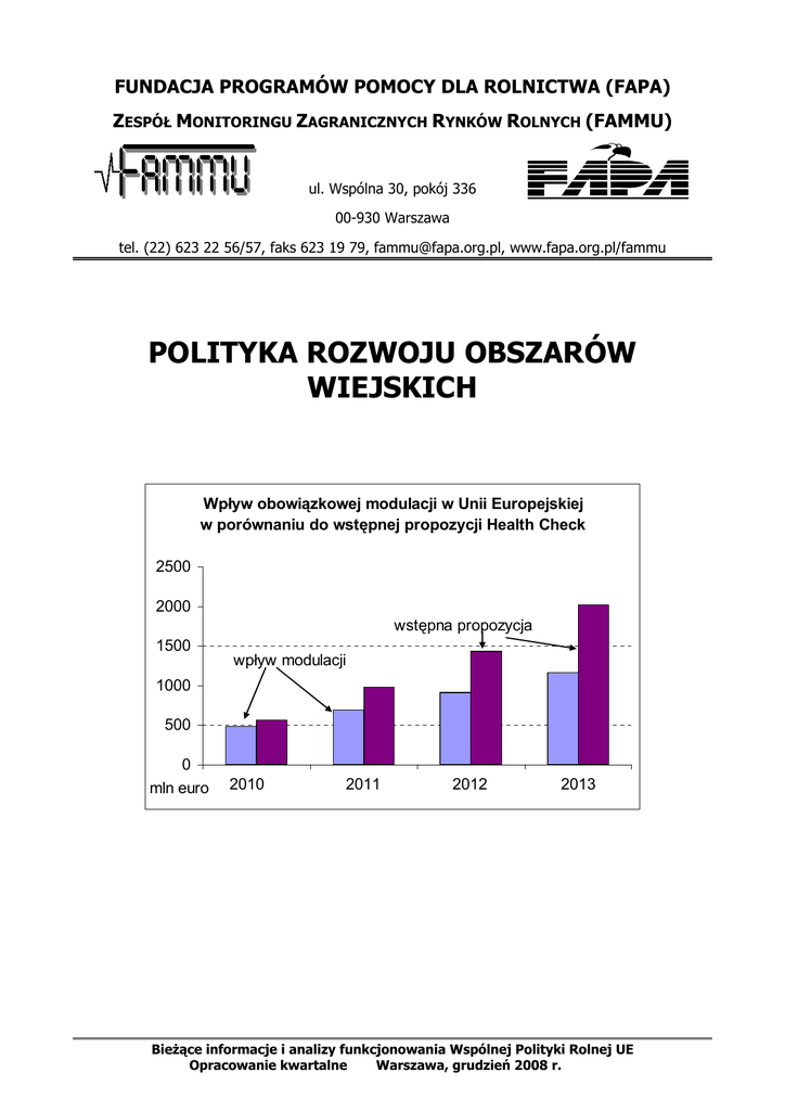 FUNDACJA PROGRAMÓW POMOCY DLA ROLNICTWA (FAPA) ZESPÓŁ MONITORINGU ZAGRANICZNYCH RYNKÓW ROLNYCH (FAMMU) ul. Wspólna 30, pokój 336 00-930 Warszawa tel. (22) 623 22 56/57, faks 623 19 79, [email protected], www.fapa.org.pl/fammu POLITYKA ROZWOJU OBSZARÓW WIEJSKICH Wpływ obowiązkowej modulacji w Unii Europejskiej w porównaniu do wstępnej propozycji Health Check 2500 2000 wstępna propozycja 1500 wpływ modulacji 1000 500 0 mln euro 2010 1-01 2011 2-01 2012 3-01 2013 4-01 Bieżące informacje i analizy funkcjonowania Wspólnej Polityki Rolnej UE Opracowanie kwartalne Warszawa, grudzień 2008 r. str. 1 POLITYKA ROZWOJU OBSZARÓW WIEJSKICH Opracowanie zostało przygotowane w Fundacji Programów Pomocy dla Rolnictwa (FAPA) przez Zespół Monitoringu Zagranicznych Rynków Rolnych (FAMMU) w ramach realizacji Umowy „Kompleksowe wsparcie Ministerstwa Rolnictwa i Rozwoju Wsi w zakresie polityki rolnej i rozwoju wsi, upowszechniania informacji z zakresu funkcjonowania Unii Europejskiej, współpracy z OECD”. © FAPA Autor opracowania: Marta Leoniak WSTĘP Rozwój obszarów wiejskich jest dziedziną, która ma priorytetowe znaczenie w poszerzonej Wspólnocie (27). Polityka rozwoju obszarów wiejskich w Unii Europejskiej stopniowo ewoluowała wraz ze zmianami przeprowadzanymi we Wspólnej Polityce Rolnej. W ciągu ostatnich kilku lat, w następstwie fundamentalnych reform WPR (w tym ostatniej - ustalonej na szczycie luksemburskim w czerwcu 2003 r.) większy nacisk położony został na wsparcie rolnictwa wielofunkcyjnego i rozwoju obszarów wiejskich w szerokim kontekście. Silniejsza polityka rozwoju obszarów wiejskich, jest według unijnej Komisarz ds. Rolnictwa Mariann Fischer Boel, kwestią najwyższej wagi dla przyszłości tych obszarów w Europie. Podstawy funkcjonowania nowej polityki rozwoju obszarów wiejskich zawarte zostały w zaakceptowanej przez Radę zasadniczej reformie drugiego filara Wspólnej Polityki Rolnej na podstawie propozycji Komisji z 14 lipca 2004 roku. Zmiany zostały przyjęte w formie rozporządzenia Rady nr 1698/2005 dotyczącego wsparcia rozwoju obszarów wiejskich z Europejskiego Funduszu na rzecz Rozwoju Obszarów Wiejskich po 2006 roku. Najnowsza reforma, przewidując jednolitą strukturę finansowania i programowania działań, stanowi niezwykle istotny etap w rozwoju i uproszczenie polityki rozwoju obszarów wiejskich. Pod koniec 2005 roku osiągnięte zostało również porozumienie między państwami członkowskimi odnośnie generalnych perspektyw finansowania Unii Europejskiej w latach 2007-2013, w tym również określenia środków budżetowych przeznaczonych na rozwój obszarów wiejskich w okresie najbliższych siedmiu lat. Rozwiązania prawne przyjęte we Wspólnocie, stanowiły podstawę dla nowej generacji programów rozwoju obszarów wiejskich w państwach członkowskich, które będą wdrażane w latach 20072013. Nowa polityka rozwoju obszarów wiejskich jest oparta na trzech głównych dziedzinach działania (przybierających formę osi programowych): poprawie konkurencyjności sektora rolnego, wsparciu zarządzaniu ziemią i poprawie ochrony środowiska oraz jakości życia i dywersyfikacji działalności gospodarczej. Nowym elementem polityki rozwoju obszarów wiejskich, zgodnie z osiągniętym porozumieniem w ramach przeglądu Health Check w listopadzie 2008 roku będzie progresywna modulacja oraz przeznaczenie uzyskanych dzięki niej środków na sprostanie nowym wyzwaniom1, którym musi stawić czoła Unia Europejska. Skala zmian będzie jednak zdecydowanie skromniejsza w porównaniu do początkowych propozycji i ambicji Komisji Europejskiej. 1 Wśród priorytetowych kwestii wyróżniono: zmiany klimatu, bioróżnorodność, odnawialne źródła energii oraz zarządzanie zasobami wód. Jednak wiele państw członkowskich wskazywało na fakt, że nowe wyzwania, zidentyfikowane przez Komisję, znalazły już swoje odzwierciedlenie w istniejących programach rozwoju obszarów wiejskich na lata 20072013. FAMMU/FAPA Bieżące informacje i analizy funkcjonowania Wspólnej Polityki Rolnej UE – XII 2008 r. str. 2 POLITYKA ROZWOJU OBSZARÓW WIEJSKICH Dyskusja nad przyszłością Wspólnej Polityki Rolnej, w tym II filaru WPR po 2013 r. Na podstawie porozumienia dotyczącego przeglądu funkcjonowania WPR w ramach Helath Check z listopada 2008 roku, przed 2014 rokiem w ramach obowiązkowej modulacji przesunięte zostaną środki na rozwój obszarów wiejskich w wysokości 3,241 mld euro. Jest to suma o ok. 1,75 mld euro niższa w porównaniu do zaproponowanej początkowo przez Komisję Europejską. Formalny tekst porozumienia został już przyjęty przez Specjalny Komitet ds. Rolnictwa (SCA) i oczekuje na tłumaczenie na wszystkie języki Unii Europejskiej. Health Check był z założenia próbą dostosowania WPR do nowych wyzwań – temu m.in. mają służyć przesunięte środki poprzez modulację z płatności bezpośrednich na rozwój obszarów wiejskich. W kompromisowym tekście, wieńczącym przegląd Health Check podkreślono, że zreformowana polityka pozwoli rolnikom w Unii Europejskiej lepiej odpowiadać na sygnały płynące z rynku, zapewniając uczciwą konkurencję i sprzyjając zrównoważonemu rolnictwu. Porozumienie kończące przegląd Health Check zawiera również zobowiązania do kontynuowania procesu reform po 2013 roku. Jedną z kwestii będzie odpowiednie rozłożenie akcentów między polityką rolną wspierającą dochody (płatności bezpośrednie), regulującą rynki oraz kierunkiem związanym z rozwojem obszarów wiejskich w Unii Europejskiej. Przyszłe cele Wspólnej Polityki Rolnej i jej ewentualnego kształtu po 2013 roku budzą poważne dyskusje wśród państw członkowskich w Unii Europejskiej. Wraz z końcowymi postanowieniami Health Check wpływa to na szerszą i intensywniejszą debatę na przyszłością tej polityki w dłuższym horyzoncie czasowym. Podczas francuskiego przewodnictwa (sprawowanego od c