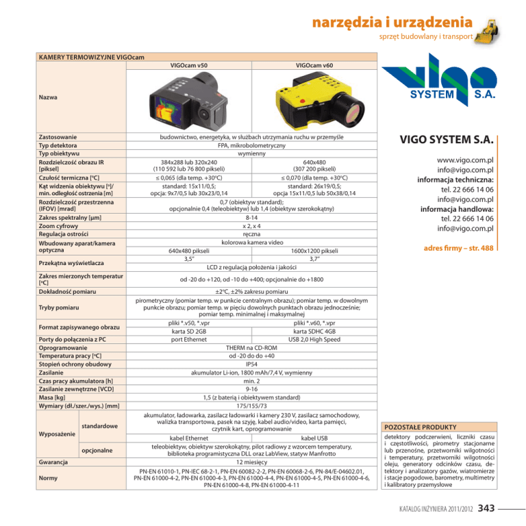 narzędzia i urządzenia sprzęt budowlany i transport KAMERY TERMOWIZYJNE VIGOcam VIGOcam v50 VIGOcam v60 Nazwa Zastosowanie Typ detektora Typ obiektywu Rozdzielczość obrazu IR [piksel] Czułość termiczna [oC] Kąt widzenia obiektywu [o]/ min. odległość ostrzenia [m] Rozdzielczość przestrzenna (IFOV) [mrad] Zakres spektralny [μm] Zoom cyfrowy Regulacja ostrości Wbudowany aparat/kamera optyczna Przekątna wyświetlacza Zakres mierzonych temperatur [oC] Dokładność pomiaru Tryby pomiaru Format zapisywanego obrazu Porty do połączenia z PC Oprogramowanie Temperatura pracy [oC] Stopień ochrony obudowy Zasilanie Czas pracy akumulatora [h] Zasilanie zewnętrzne [VCD] Masa [kg] Wymiary (dł./szer./wys.) [mm] standardowe Wyposażenie opcjonalne Gwarancja Normy budownictwo, energetyka, w służbach utrzymania ruchu w przemyśle FPA, mikrobolometryczny wymienny 384x288 lub 320x240 640x480 (110 592 lub 76 800 pikseli) (307 200 pikseli) o ≤ 0,065 (dla temp. +30 C) ≤ 0,070 (dla temp. +30oC) standard: 15x11/0,5; standard: 26x19/0,5; opcja: 9x7/0,5 lub 30x23/0,14 opcja 15x11/0,5 lub 50x38/0,14 0,7 (obiektyw standard); opcjonalnie 0,4 (teleobiektyw) lub 1,4 (obiektyw szerokokątny) 8-14 x 2, x 4 ręczna kolorowa kamera video 640x480 pikseli 1600x1200 pikseli 3,5” 3,7” LCD z regulacją położenia i jakości VIGO SYSTEM S.A. www.vigo.com.pl [email protected] informacja techniczna: tel. 22 666 14 06 [email protected] informacja handlowa: tel. 22 666 14 06 [email protected] adres firmy – str. 488 od -20 do +120, od -10 do +400; opcjonalnie do +1800 ±2oC, ±2% zakresu pomiaru pirometryczny (pomiar temp. w punkcie centralnym obrazu); pomiar temp. w dowolnym punkcie obrazu; pomiar temp. w pięciu dowolnych punktach obrazu jednocześnie; pomiar temp. minimalnej i maksymalnej pliki *.v50, *.vpr pliki *.v60, *.vpr karta SD 2GB karta SDHC 4GB port Ethernet USB 2,0 High Speed THERM na CD-ROM od -20 do do +40 IP54 akumulator Li-ion, 1800 mAh/7,4 V, wymienny min. 2 9-16 1,5 (z baterią i obiektywem standard) 175/155/73 akumulator, ładowarka, zasilacz ładowarki i kamery 230 V, zasilacz samochodowy, walizka transportowa, pasek na szyję, kabel audio/video, karta pamięci, czytnik kart, oprogramowanie kabel Ethernet kabel USB teleobiektyw, obiektyw szerokokątny, pilot radiowy z wzorcem temperatury, biblioteka programistyczna DLL oraz LabView, statyw Manfrotto 12 miesięcy PN-EN 61010-1, PN-IEC 68-2-1, PN-EN 60082-2-2, PN-EN 60068-2-6, PN-84/E-04602.01, PN-EN 61000-4-2, PN-EN 61000-4-3, PN-EN 61000-4-4, PN-EN 61000-4-5, PN-EN 61000-4-6, PN-EN 61000-4-8, PN-EN 61000-4-11 POZOSTAŁE PRODUKTY detektory podczerwieni, liczniki czasu i częstotliwości, pirometry stacjonarne lub przenośne, przetworniki wilgotności i temperatury, przetworniki wilgotności oleju, generatory odcinków czasu, detektory i analizatory gazów, wiatromierze i stacje pogodowe, barometry, multimetry i kalibratory przemysłowe KATALOG INŻYNIERA 2011/2012 343