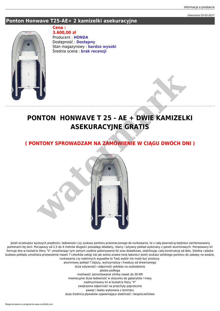 Informacje o produkcie Utworzono 03-03-2017 Ponton Honwave T25-AE+ 2 kamizelki asekuracyjne Cena : 3.600,00 zł er m ar k Producent : HONDA Dostępność : Dostępny Stan magazynowy : bardzo wysoki Średnia ocena : brak recenzji PONTON HONWAVE T 25 - AE + DWIE KAMIZELKI ASEKURACYJNE GRATIS w at ( PONTONY SPROWADZAM NA ZAMÓWIENIE W CIĄGU DWÓCH DNI ) Jeżeli oczekujesz wyższych prędkości, ładowności czy szukasz pontonu przeznaczonego do nurkowania, to z całą pewnością będziesz zainteresowany pontonami tej serii. Począwszy od 2,5 do 4 metrów długości posiadają składany, równy i sztywny pokład wykonany z paneli aluminiowych. Pompowany kil formuje dno w kształcie litery "V" umożliwiając tym samym szybkie pokonywanie fal oraz dodatkowo, stabilizując całą konstrukcję od dołu. Solidna i płaska budowa pokładu umożliwia przewożenie nawet 7 członków załogi lub jak wolisz prawie tonę ładunku! Jeżeli szukasz solidnego pontonu do zabawy na wodzie, nurkowania czy rodzinnych wypadów to Twój wybór nie może być prostszy. aluminiowy pokład ? lżejszy, wytrzymalszy i trwalszy od drewnianego duża sztywność i odporność pokładu na uszkodzenia płaska podłoga możliwość zamontowanie silnika nawet do 30 KM rewelacyjnie duża ładowność w stosunku do gabarytów i masy nadmuchiwany kil w kształcie litery "V" zwiększona odporność na przechyły poprzeczne pawęż i ławka wykonana z laminatu duża średnica pływaków zapewniająca stabilność i bezpieczeństwo Wygenerowano w programie www.oscGold.com CENA DO UZGODNIENIA TELEFONICZNEGO - 603 864 588 Parametry produktu Opis T 25 - AE Długość (m) 2.50 Szerokość (m) 1.56 Waga (kg) Załoga (osoby) 48 3 440 kg Ilość komór 3 + kil w at er m ar k Wyporność