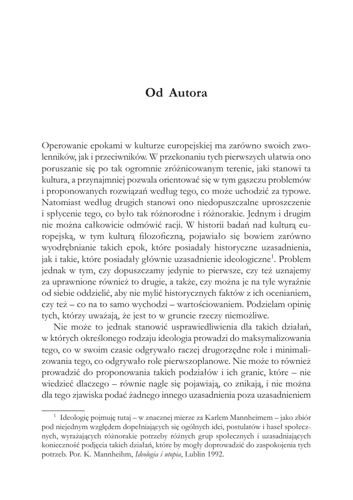 Od Autora 7 Od Autora Operowanie epokami w kulturze europejskiej ma zarówno swoich zwolenników, jak i przeciwników. W przekonaniu tych pierwszych ułatwia ono poruszanie się po tak ogromnie zróżnicowanym terenie, jaki stanowi ta kultura, a przynajmniej pozwala orientować się w tym gąszczu problemów i proponowanych rozwiązań według tego, co może uchodzić za typowe. Natomiast według drugich stanowi ono niedopuszczalne uproszczenie i spłycenie tego, co było tak różnorodne i różnorakie. Jednym i drugim nie można całkowicie odmówić racji. W historii badań nad kulturą europejską, w tym kulturą filozoficzną, pojawiało się bowiem zarówno wyodrębnianie takich epok, które posiadały historyczne uzasadnienia, jak i takie, które posiadały głównie uzasadnienie ideologiczne1. Problem jednak w tym, czy dopuszczamy jedynie to pierwsze, czy też uznajemy za uprawnione również to drugie, a także, czy można je na tyle wyraźnie od siebie oddzielić, aby nie mylić historycznych faktów z ich ocenianiem, czy też – co na to samo wychodzi – wartościowaniem. Podzielam opinię tych, którzy uważają, że jest to w gruncie rzeczy niemożliwe. Nie może to jednak stanowić usprawiedliwienia dla takich działań, w których określonego rodzaju ideologia prowadzi do maksymalizowania tego, co w swoim czasie odgrywało raczej drugorzędne role i minimalizowania tego, co odgrywało role pierwszoplanowe. Nie może to również prowadzić do proponowania takich podziałów i ich granic, które – nie wiedzieć dlaczego – równie nagle się pojawiają, co znikają, i nie można dla tego zjawiska podać żadnego innego uzasadnienia poza uzasadnieniem 1 Ideologię pojmuję tutaj – w znacznej mierze za Karlem Mannheimem – jako zbiór pod niejednym względem dopełniających się ogólnych idei, postulatów i haseł społecznych, wyrażających różnorakie potrzeby różnych grup społecznych i uzasadniających konieczność podjęcia takich działań, które by mogły doprowadzić do zaspokojenia tych potrzeb. Por. K. Mannheihm, Ideologia i utopia, Lublin 1992. 8 Od Autora ideologicznym. Nie może to w końcu stanowić uzasadnienia dla takiego myślenia o historii kultury, w którym poszczególne epoki układają się – jakby powiedział Georg F. W. Hegel czy Karol Marks – „z nieubłaganą koniecznością”, w taki „logiczny” ciąg zdarzeń, z których może wynikać tylko jedno: „nasi” zawsze mają racje i w historii liczą się w gruncie rzeczy tylko nasze racje; rzecz jasna, racje ideologiczne. Ten rodzaj myślenia Karl R. Popper nazwał historycyzmem, a jego zwolenników uznał za wrogów „społeczeństwa otwartego”2. Problem w tym, że takie myślenie o historii kultury (i nie tylko o jej historii) było udziałem nie tylko takich historyzujących filozofów, jak Hegel czy Marks, ale również tych, którzy – jak Platon czy Arystoteles – nie mieli ani specjalnego upodobania do refleksji historycznej, ani też nie zanotowali na tym polu bardziej znaczących sukcesów. Było ono także udziałem tych nader licznych historyków, którzy wprawdzie nie mieli filozoficznego przygotowania, ale zdobywali się na jakąś refleksję historiozoficzną, to jest taką, w której wskazywali na globalny sens historii. Pytanie: „Czy historia ma sens?” zostało postawione przez K. R. Poppera w podsumowaniu do Społeczeństwa otwartego. Odpowiadając na nie, jego autor twierdzi, że „historia nie ma sensu”, a nie ma go dlatego, że „»historia« w takim znaczeniu, w jakim ludzie przeważnie o niej mówią, po prostu nie istnieje. Mówiąc bowiem o »historii ludzkości«, zakładają, że fakty składają się na historię ludzkości. [...] zakres faktów jest nieskończenie bogaty i wymaga selekcji. Zależnie od zainteresowań możemy na przykład pisać o historii sztuki lub języka, albo o historii obyczajów kulinarnych, albo o historii tyfusowej. [...] Nie ma historii ludzkości, jest tylko nieokreślona liczba historii wszelkiego rodzaju aspektów życia ludzkiego. [...] Tak właśnie musi odpowiedzieć każdy, komu nie jest obcy humanitaryzm, w szczególności każdy chrześcijanin. Pełna historia ludzkości musiałaby być historią ludzi. Musiałaby być historią wszystkich ludzkich nadziei, walk i cierpień. Bo żaden człowiek nie jest ważniejszy od drugiego. Jasne jest, że takiej pełnej historii napisać niepodobna. Co kryje się za tym teistycznym historycyzmem? Razem z Heglem patrzy on na historię [...] jak na scenę, czy raczej coś w rodzaju bardzo długiej sztuki Szekspira: a widzowie biorą albo »wielkie historyczne osobistości«, K. R. Popper, Społeczeństwo otwarte i jego wrogowie, t. 2, Warszawa 2006. 2 Od Autora 9 albo abstrakcyjną ludzkość za bohaterów sztuki. A potem pytają: »Kto tę sztukę napisał?« I myślą, że odpowiadają po chrześcijańsku, kiedy mówią »Bóg«. Ale mylą się. [...] bo sztuka została napisana (i oni o tym wiedzą) nie przez Boga, lecz przez profesorów historii”3. Można oczywiście polemizować ze stanowiskiem K. R. Poppera w tej i w wielu innych kwestiach związanych z poszukiwaniem sensu historii lub w historii. Nie sposób mu jednak odmówić trafności we wskazaniu na długą historię tych poszukiwań oraz na głównych antagonistów w tej historycznej batalii o sens historii. Jednym z nich są ci, którzy z pozycji chrześcijańskich i dla potrzeb chrześcijańskiej wiary podejmowali próby znalezienia owego sensu i byli przekonani, że go znaleźli w swojej wierze w to, że za tymi wszystkimi większymi i mniejszymi wydarzeniami, które się zachodzą w dziejach, kryje się ręka Boga, który wszystko wie, wszystko widzi i wszystko może uczynić, a w swoich czynach kieruje się wolą zbawczą4. Wierzyli i wierzą w to zarówno zwyczajni chrześcijanie, jak i ci wielcy teolodzy pierwszych wieków chrześcijaństwa nazywani Ojcami Kościoła. Jednym z nich był Aurel