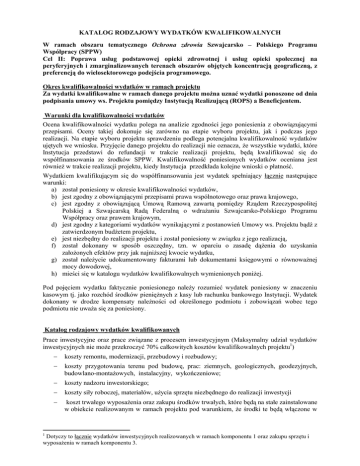 KATALOG RODZAJOWY WYDATKÓW KWALIFIKOWALNYCH W ramach obszaru tematycznego Ochrona zdrowia Szwajcarsko – Polskiego Programu Współpracy (SPPW) Cel II: Poprawa usług podstawowej opieki zdrowotnej i usług opieki społecznej na peryferyjnych i zmarginalizowanych terenach obszarów objętych koncentracją geograficzną, z preferencją do wielosektorowego podejścia programowego. Okres kwalifikowalności wydatków w ramach projektu Za wydatki kwalifikowalne w ramach danego projektu moŜna uznać wydatki ponoszone od dnia podpisania umowy ws. Projektu pomiędzy Instytucją Realizującą (ROPS) a Beneficjentem. Warunki dla kwalifikowalności wydatków Ocena kwalifikowalności wydatku polega na analizie zgodności jego poniesienia z obowiązującymi przepisami. Oceny takiej dokonuje się zarówno na etapie wyboru projektu, jak i podczas jego realizacji. Na etapie wyboru projektu sprawdzeniu podlega potencjalna kwalifikowalność wydatków ujętych we wniosku. Przyjęcie danego projektu do realizacji nie oznacza, Ŝe wszystkie wydatki, które Instytucja przedstawi do refundacji w trakcie realizacji projektu, będą kwalifikować się do współfinansowania ze środków SPPW. Kwalifikowalność poniesionych wydatków oceniana jest równieŜ w trakcie realizacji projektu, kiedy Instytucja przedkłada kolejne wnioski o płatność. Wydatkiem kwalifikującym się do współfinansowania jest wydatek spełniający łącznie następujące warunki: a) został poniesiony w okresie kwalifikowalności wydatków, b) jest zgodny z obowiązującymi przepisami prawa wspólnotowego oraz prawa krajowego, c) jest zgodny z obowiązującą Umową Ramową zawartą pomiędzy Rządem Rzeczypospolitej Polskiej a Szwajcarską Radą Federalną o wdraŜaniu Szwajcarsko-Polskiego Programu Współpracy oraz prawem krajowym, d) jest zgodny z kategoriami wydatków wynikającymi z postanowień Umowy ws. Projektu bądź z zatwierdzonym budŜetem projektu, e) jest niezbędny do realizacji projektu i został poniesiony w związku z jego realizacją, f) został dokonany w sposób oszczędny, tzn. w oparciu o zasadę dąŜenia do uzyskania załoŜonych efektów przy jak najniŜszej kwocie wydatku, g) został naleŜycie udokumentowany fakturami lub dokumentami księgowymi o równowaŜnej mocy dowodowej, h) mieści się w katalogu wydatków kwalifikowalnych wymienionych poniŜej. Pod pojęciem wydatku faktycznie poniesionego naleŜy rozumieć wydatek poniesiony w znaczeniu kasowym tj. jako rozchód środków pienięŜnych z kasy lub rachunku bankowego Instytucji. Wydatek dokonany w drodze kompensaty naleŜności od określonego podmiotu i zobowiązań wobec tego podmiotu nie uwaŜa się za poniesiony. Katalog rodzajowy wydatków kwalifikowanych Prace inwestycyjne oraz prace związane z procesem inwestycyjnym (Maksymalny udział wydatków inwestycyjnych nie moŜe przekroczyć 70% całkowitych kosztów kwalifikowalnych projektu1) 1 − koszty remontu, modernizacji, przebudowy i rozbudowy; − koszty przygotowania terenu pod budowę, prac: ziemnych, geologicznych, geodezyjnych, budowlano-montaŜowych, instalacyjny, wykończeniowe; − koszty nadzoru inwestorskiego; − koszty siły roboczej, materiałów, uŜycia sprzętu niezbędnego do realizacji inwestycji − koszt trwałego wyposaŜenia oraz zakupu środków trwałych, które będą na stałe zainstalowane w obiekcie realizowanym w ramach projektu pod warunkiem, Ŝe środki te będą włączone w Dotyczy to łącznie wydatków inwestycyjnych realizowanych w ramach komponentu 1 oraz zakupu sprzętu i wyposaŜenia w ramach komponentu 3. rejestr środków trwałych placówki-beneficjenta oraz wydatek ten będzie traktowany jako inwestycyjny zgodnie z zasadami rachunkowości; − koszt zakupu sprzętu i wyposaŜenia związanego z realizacją projektu, pod warunkiem, Ŝe wspomniane składniki majątku trwałego podlegają amortyzacji zgodnie z odpowiednimi przepisami; zakupiony sprzęt musi być niezbędny i wykorzystywany bezpośrednio do realizacji projektu; − koszty zakupu i uŜycia aktywów niematerialnych (np. patenty, licencje) niezbędnych i wykorzystywanych bezpośrednio dla celów realizacji projektu; − opłaty za uŜywanie środków trwałych i wyposaŜenia niezbędnych i wykorzystywanych bezpośrednio dla celów realizacji projektu w trakcie jego realizacji (najem, dzierŜawa); − sprzęt i wyposaŜenie informatyczne, w tym: koszty zakupu i wdroŜenia oprogramowania i technologii informatycznych (z wyłączeniem kosztów nabycia systemów zarządzania, monitorowania i ewaluacji), koszty zakupu licencji oraz sprzętu komputerowego bezpośrednio wykorzystywanego na potrzeby projektu. Wydatki niekwalifikowalne Zgodnie z artykułem 5.5 Umowy Ramowej za niekwalifikowalne uznaje się następujące wydatki : - wydatki poniesione przed podpisaniem Umowy ws. Projektu przez wszystkie strony, - odsetki narosłe od długu, - zakup nieruchomości, - podatek VAT, jeśli moŜe być odzyskany, Zgodnie z artykułem 7.2 Umowy Ramowej za niekwalifikowane uznaje się inne opłaty lub podatki, w szczególności podatki bezpośrednie i składki ubezpieczeniowe od wynagrodzeń, jeśli nie są one faktycznie i ostatecznie ponoszone przez Instytucję. Ponadto za niekwalifikowane uznaje się: - przygotowanie dokumentacji technicznej: pozwolenie na budowę, przygotowanie projektu, kosztorysu, itp., - mandaty, grzywny, opłaty karne, - kary finansowe, - straty kursowe związane z wymianą walut, - koszty postępowań sądowych, - koszty amortyzacji. Podwójne finansowanie Podwójne finansowanie oznacza niedozwolone zrefundowanie całkowite lub częściowe danego wydatku dwa razy ze środków publicznych - SPPW oraz wspólnotowych lub krajowych. Podwójnym finansowaniem jest w szczególności: a) zrefundowanie tego samego wydatku w ramach dwóch róŜnych współfinansowanych ze środków SPPW oraz wspólnotowych lub krajowych, projektów b) zrefundowanie kosztów podatku VAT ze środków SPPW, 