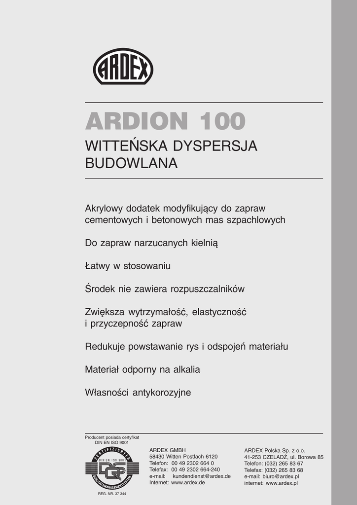 ARDION 100 WITTEÑSKA DYSPERSJA BUDOWLANA Akrylowy dodatek modyfikuj¹cy do zapraw cementowych i betonowych mas szpachlowych Do zapraw narzucanych kielni¹ £atwy w stosowaniu rodek nie zawiera rozpuszczalników Zwiêksza wytrzyma³oæ, elastycznoæ i przyczepnoæ zapraw Redukuje powstawanie rys i odspojeñ materia³u Materia³ odporny na alkalia W³asnoci antykorozyjne Producent posiada certyfikat DIN EN ISO 9001 ARDEX GMBH 58430 Witten Postfach 6120 Telefon: 00 49 2302 664 0 Telefax: 00 49 2302 664-240 e-mail: [email protected] Internet: www.ardex.de REG. NR. 37 344 ARDEX Polska Sp. z o.o. 41-253 CZELAD, ul. Borowa 85 Telefon: (032) 265 83 67 Telefax: (032) 265 83 68 e-mail: [email protected] internet: www.ardex.pl ARDION 100 WITTEÑSKA DYSPERSJA BUDOWLANA Zakres stosowania: Dodatek do zapraw wykonanych z: WITTEÑSKIEGO CEMENTU SZYBKOWI¥¯¥CEGO 32,5 R-SF Normalnych cementów SZYBKOWI¥¯¥CEJ ZAPRAWY WITTEÑSKIEJ M4 ARDUCRET B10 Szpachlówki do dok³adnych prac wykoñczeniowych na powierzchniach betonowych ARDUCRET B 12 Szpachlówki do betonu ARDUCRET B 14 Cementowej zaprawy do napraw elementów betonowych FASSIT 11 Fasadowej masy szpachlowej Dodatek do szlamów cementowych. Poprawia wytrzyma³oæ na zginanie i rozci¹ganie, przyczepnoæ do pod³o¿a, zwiêksza elastycznoæ zapraw i betonów. Poprawia plastycznoæ i urabialnoæ zaprawy bez zwiêkszania zawartoci wody zarobowej. Umo¿liwia trwa³e naprawy betonów, tynków i jastrychów, prefabrykatów betonowych, (ubytki, wype³nianie pustek, rogów i krawêdzi). Pozwala na stosowanie cieñszych warstw zapraw sczepnych, zwiêksza odpornoæ na cieranie, elastycznoæ i poprawia przyczepnoæ zapraw i warstw tynku równie¿ na g³adkim pod³o¿u. Podnosi zdolnoæ wi¹zania zaprawy do uk³adania p³ytek ceramicznych i p³yt z kamienia naturalnego. Do stosowania wewn¹trz i na zewn¹trz. * Do napraw powierzchni betonowych Sprawozdanie z badania nr 5014/0140 z 11.6.1990 Urzêdu Badañ Materia³ów Budowlanych "iBMB" w Brunszwiku. Przy u¿yciu WITTEÑSKIEJ DYSPERSJI BUDOWLANEJ ARDION 100 mo¿na po 28 dniach uzyskaæ wytrzyma³oæ na odrywanie na g³adkim betonie wiêksz¹ od 2,5 N/mm2. Opis materia³u: Modyfikowana dyspersja akrylowa. Przygotowanie i stosowanie materia³u: U¿ywaæ czystych naczyñ. WITTEÑSK¥ DYSPERSJÊ BUDOWLAN¥ ARDION 100 nale¿y rozcieñczyæ wod¹ zgodnie z poni¿sz¹ tabel¹ i u¿ywaæ jako p³ynu zarobowego do przygotowywanej zaprawy, szlamów cementowych i betonowych mas szpachlowych. Przy zaprawach sczepnych nale¿y uwa¿aæ aby by³y one dobrze na³o¿one szczotk¹ na pod³o¿e. Zaprawy na warstwê sczepn¹ nak³ada siê metod¹ "mokre na mokre". Stosowaæ wewn¹trz i na zewn¹trz w temperaturach powy¿ej 50 C. Opakowanie: Magazynowanie: Wiadra po 5 kg i 20 kg netto W suchych pomieszczeniach przez 12 miesiêcy w oryginalnie zamkniêtym opakowaniu. Chroniæ przed mrozem i bezporednim wiat³em s³onecznym. Pañstwowy Zak³ad Higieny: ATEST Nr 31/B-2016/96 Gwarantujemy wysok¹ jakoæ naszych wyrobów. Nasze zalecenia dotycz¹ce stosowania opieraj¹ siê na badaniach i praktycznym dowiadczeniu, mog¹ jednak byæ tylko ogólnymi wskazówkami na temat zastosowania, poniewa¿ nie mamy ¿adnego wp³ywu na warunki panuj¹ce na budowie i przebieg wykonywanych prac.