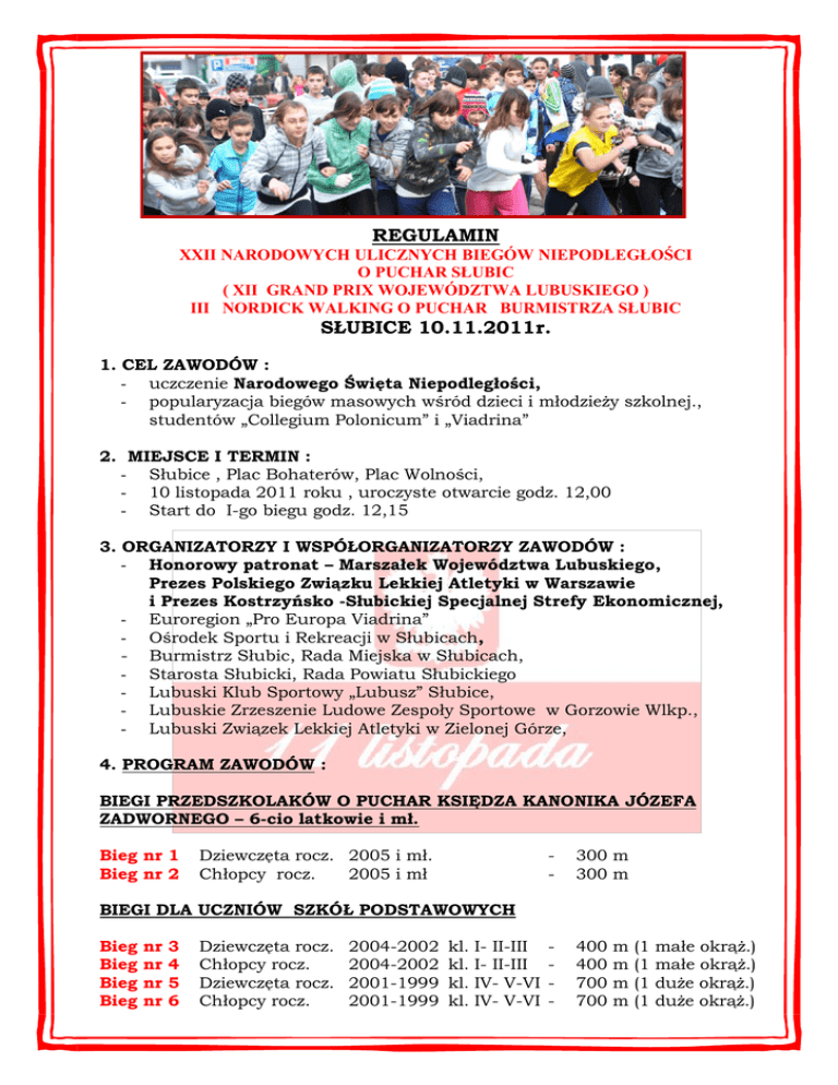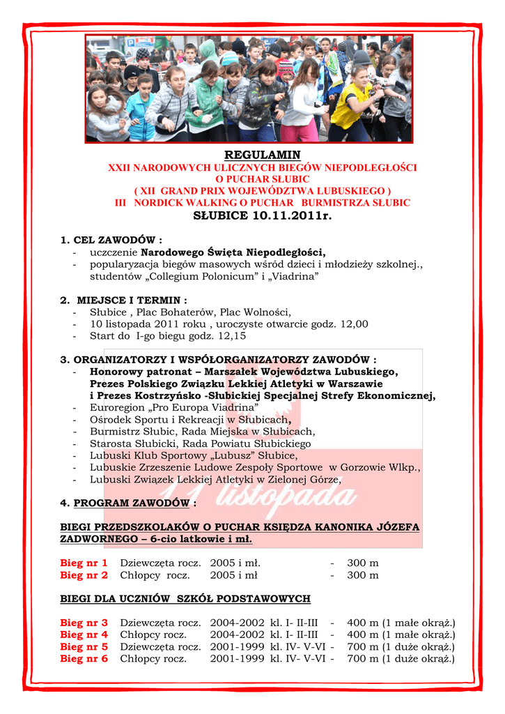 REGULAMIN XXII NARODOWYCH ULICZNYCH BIEGÓW NIEPODLEGŁOŚCI O PUCHAR SŁUBIC ( XII GRAND PRIX WOJEWÓDZTWA LUBUSKIEGO ) III NORDICK WALKING O PUCHAR BURMISTRZA SŁUBIC SŁUBICE 10.11.2011r. 1. CEL ZAWODÓW : - uczczenie Narodowego Święta Niepodległości, - popularyzacja biegów masowych wśród dzieci i młodzieży szkolnej., studentów „Collegium Polonicum” i „Viadrina” 2. MIEJSCE I TERMIN : - Słubice , Plac Bohaterów, Plac Wolności, - 10 listopada 2011 roku , uroczyste otwarcie godz. 12,00 - Start do I-go biegu godz. 12,15 3. ORGANIZATORZY I WSPÓŁORGANIZATORZY ZAWODÓW : - Honorowy patronat – Marszałek Województwa Lubuskiego, Prezes Polskiego Związku Lekkiej Atletyki w Warszawie i Prezes Kostrzyńsko -Słubickiej Specjalnej Strefy Ekonomicznej, - Euroregion „Pro Europa Viadrina” - Ośrodek Sportu i Rekreacji w Słubicach, - Burmistrz Słubic, Rada Miejska w Słubicach, - Starosta Słubicki, Rada Powiatu Słubickiego - Lubuski Klub Sportowy „Lubusz” Słubice, - Lubuskie Zrzeszenie Ludowe Zespoły Sportowe w Gorzowie Wlkp., - Lubuski Związek Lekkiej Atletyki w Zielonej Górze, 4. PROGRAM ZAWODÓW : BIEGI PRZEDSZKOLAKÓW O PUCHAR KSIĘDZA KANONIKA JÓZEFA ZADWORNEGO – 6-cio latkowie i mł. Bieg nr 1 Bieg nr 2 Dziewczęta rocz. 2005 i mł. Chłopcy rocz. 2005 i mł - 300 m 300 m - 400 400 700 700 BIEGI DLA UCZNIÓW SZKÓŁ PODSTAWOWYCH Bieg Bieg Bieg Bieg nr nr nr nr 3 4 5 6 Dziewczęta rocz. Chłopcy rocz. Dziewczęta rocz. Chłopcy rocz. 2004-2002 2004-2002 2001-1999 2001-1999 kl. kl. kl. kl. I- II-III I- II-III IV- V-VI IV- V-VI m m m m (1 (1 (1 (1 małe okrąż.) małe okrąż.) duże okrąż.) duże okrąż.) BIEGI DLA UCZNIÓW SZKÓŁ GIMNAZJALNYCH Bieg nr 7 Dziewczęta rocz. 98-97-96 kl. I-II-III Bieg nr 8 Chłopcy rocz. 98-97-96 kl. I-II-III - 700 m (1 duże okrąż.) - 1400 m (2 duże okrąż.) BIEGI DLA UCZNIÓW SZKÓŁ LICEALNYCH Bieg nr 9 Dziewczęta rocz. 93-94-95 kl. I-II-III Bieg nr 10 Chłopcy rocz. 93-94-95 kl. I-II-III - 1400 m (2 duże okrąż.) - 1400 m (2 duże okrąż.) Bieg nr 11 III. MARSZ NORDYCKI O PUCHAR BURMISTRZA SŁUBIC ( „Słubiczanie razem w marszu po zdrowie“ ) - 3000 m (4 duże okrąż.) BIEGI GŁÓWNE Bieg nr 12 Kobiet Bieg nr 13 Mężczyzn - 3000 m (4 duże okrąż.) - 5000m(6 dużych okrąż.) RAZEM : 13 BIEGÓW 5. ZASADY I WARUNKI UCZESTNICTWA - w zawodach prawo startu mają zawodniczki i zawodnicy w poszczególnych kategoriach wiekowych zgodnie z programem zawodów, - zawodniczka/zawodnik ma prawo startu tylko w jednym biegu, - dzieci z przedszkoli , szkół podstawowych i gimnazjów mają prawo startu za zgodą rodziców / opiekunów ( odpowiedzialni opiekunowie ). 6. TERMIN I MIEJSCE ZGŁOSZENIA : - imiennego zgłoszenia w biegach głównych należy dokonać w dniu zawodów tj. 10.11.2011r. w sekretariacie zawodów ( MSS w godz. 10,0012,00) 7. SYSTEM I SPOSÓB PRZEPROWADZENIA ZAWODÓW : - zawody zostaną rozegrane zgodnie z przepisami PZLA oraz ustaleniami niniejszego regulaminu. 8. NAGRODY : - zwycięzcy biegów przedszkolaków otrzymają pamiątkowe puchary (m-ca IIII), dyplomy i nagrody rzeczowe (m-ca I-VI) - zwycięzcy biegów od 2 do 10 otrzymają pamiątkowe dyplomy, puchary (mca I-III) - zwycięzcy biegów głównych otrzymają pamiątkowe dyplomy, puchary(za mca I-VI) Uwaga: organizator w miarę możliwości zabezpieczy nagrody ( rzeczowe lub pieniężne pozyskane od sponsorów). 9. KOSZTY UDZIAŁU W ZAWODACH : - koszta organizacyjne pokrywa organizator, - koszta osobowe pokrywają zgłaszające organizacje/osoby 10. UBEZPIECZENIE ZAWODÓW : - organizator ubezpiecza zawody od następstw nieszczęśliwych wypadków ( ubezpieczenie NW). 11. SPRAWY RÓŻNE : - biuro zawodów : Słubice ul. Piłsudskiego 17 – Miejska Sala Sportowa czynne w dniu 10.11.2011r. w godz. 10,00-12,00, gdzie nastąpi weryfikacja zawodników oraz pobieranie numerów startowych do biegów głównych i Marszu Nordyckiego, - organizator może zabezpieczyć dla zainteresowanych noclegi i wyżywienie na koszt zamawiającego. Koszt noclegu oraz wyżywienia ( nocleg, kolacja 09.11.2011r. śniadanie, obiad- 10.11.2011r.) wynosi 75 zł /osobę, Zgłoszenia należy dokonać do dnia 09.11.2011 r. u organizatora, tj. Ośrodek Sportu i Rekreacji w Słubicach, Fax (095)7584778. lub e-mail : [email protected] 12. SPRAWOZDAWCZOŚĆ : - oficjalny komunikat zawodów umieszczony zostanie na stronie internetowej OSiR Słubice : www.osir.slubice.pl ORGANIZATOR