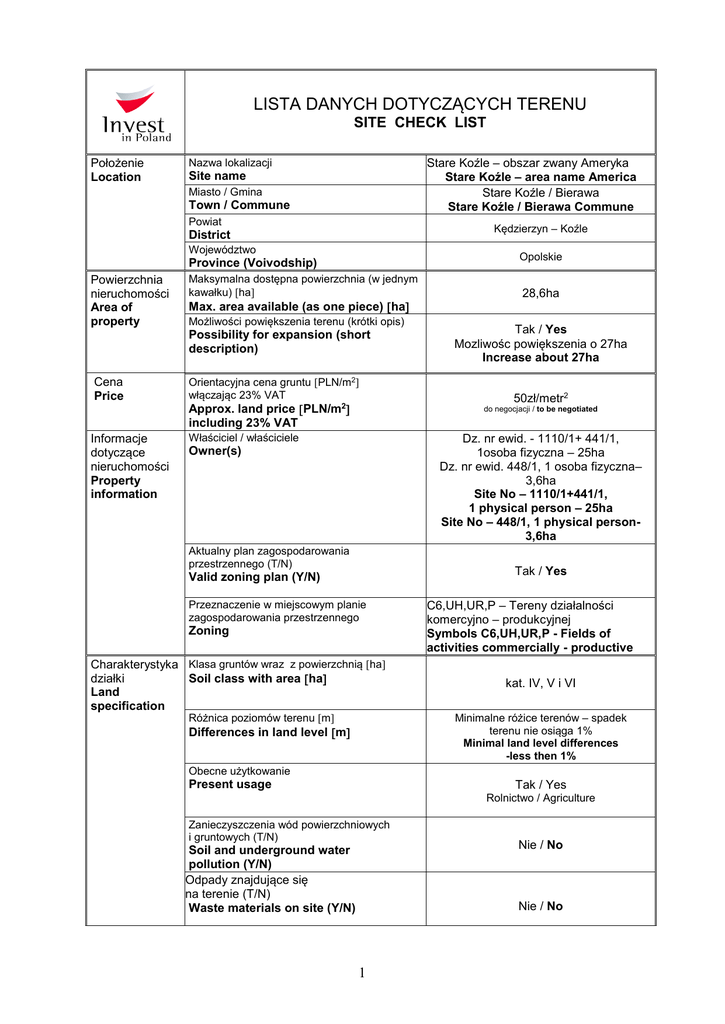 LISTA DANYCH DOTYCZĄCYCH TERENU SITE CHECK LIST Położenie Location Stare Koźle – obszar zwany Ameryka Stare Koźle – area name America Stare Koźle / Bierawa Stare Koźle / Bierawa Commune Nazwa lokalizacji Site name Miasto / Gmina Town / Commune Powiat Kędzierzyn – Koźle District Województwo Opolskie Province (Voivodship) Powierzchnia nieruchomości Area of property Maksymalna dostępna powierzchnia (w jednym kawałku) ha Max. area available (as one piece) ha Możliwości powiększenia terenu (krótki opis) Possibility for expansion (short description) Cena Price Informacje dotyczące nieruchomości Property information Orientacyjna cena gruntu PLN/m2 włączając 23% VAT Approx. land price PLN/m2 including 23% VAT 28,6ha Tak / Yes Mozliwośc powiększenia o 27ha Increase about 27ha 50zł/metr2 do negocjacji / to be negotiated Właściciel / właściciele Dz. nr ewid. - 1110/1+ 441/1, 1osoba fizyczna – 25ha Dz. nr ewid. 448/1, 1 osoba fizyczna– 3,6ha Site No – 1110/1+441/1, 1 physical person – 25ha Site No – 448/1, 1 physical person3,6ha Owner(s) Aktualny plan zagospodarowania przestrzennego (T/N) Tak / Yes Valid zoning plan (Y/N) Przeznaczenie w miejscowym planie zagospodarowania przestrzennego Zoning Charakterystyka Klasa gruntów wraz z powierzchnią ha działki Soil class with area ha Land specification Różnica poziomów terenu m Differences in land level m C6,UH,UR,P – Tereny działalności komercyjno – produkcyjnej Symbols C6,UH,UR,P - Fields of activities commercially - productive kat. IV, V i VI Minimalne różice terenów – spadek terenu nie osiąga 1% Minimal land level differences -less then 1% Obecne użytkowanie Present usage Tak / Yes Rolnictwo / Agriculture Zanieczyszczenia wód powierzchniowych i gruntowych (T/N) Soil and underground water pollution (Y/N) Odpady znajdujące się na terenie (T/N) Waste materials on site (Y/N) Nie / No Nie / No 1 Poziom wód gruntowych m Underground water level m Ok. 1 m pod poziomem terenu Approx. 1 meters belowe the site level Ryzyko wystąpienia zalań lub obsunięć terenu (T/N) Risk of flooding or land slide (Y/N) Nie / No Przeszkody podziemne (T/N) Underground obstacles (Y/N) Nie / No Przeszkody występujące na powierzchni terenu (T/N) Ground and overhead obstacles (Y/N) Nie / No Istniejące ograniczenia ekologiczne (T/N) Ecological restrictions (Y/N) Nie / No Budynki i zabudowania na terenie (T/N) Buildings / other constructions on site (Y/N) Ograniczenia budowlane Building restrictions Nie / No Procent dopuszczalnej zabudowy Building coverage % Bez ograniczeń Without limitations Ograniczenia wysokości budynków m Building height limit m Bez ograniczeń Without limitations Strefa buforowa m Buffer zone m 10m Inne, jeśli występują Others if any - Droga dojazdowa do terenu (rodzaj drogi Połączenia i jej szerokość) transportowe Transport links Access road to the plot (type and width of access road) Autostrada / droga krajowa km Nearest motorway / national road km Droga utwardzona 11kN Hardened way 11 kN w odległości / within 25km Kolej km Railway line km 1 km – Stare Koźle Bocznica kolejowa km Railway siding km 1 km – Stare Koźle Najbliższe lotnisko międzynarodowe km Nearest international airport km Pyrzowice - 75 km Najbliższe miasto wojewódzkie km Nearest province capital km Istniejąca infrastruktura Opole - 60 km Elektryczność na terenie (T/N) Electricity (Y/N) Tak / Yes 2 Existing infrastructure Odległość przyłącza od granicy terenu Connection point (distance from boundary) m Napięcie Niskie 0,4 kV , Średnie 15 kV Low 0,4kV, Average 15 kV Voltage kV Dostępna moc Availble capa city [MW] Brak danych Gaz na terenie (T/N) Opracowano projekt Project process Gas (Y/N) Odległość przyłącza od granicy działki Connection point (distance from boundary) m Wartość kaloryczna Calorific value MJ/Nm3 Średnica rury Pipe diameter mm Dostępna objętość Woda na terenie (T/N) Brak danych No data Brak danych No data Tak Yes Water supply (Y/N) Odległość przyłącza od granicy terenu Connection point (distance from boundary) m Odległość 3 km – 6,4 Mpa Connection 3 km – 6,4 Mpa Brak danych No data Available capacity Nm3/h 50m Dostępna objętość Available capacity m3/24h 10m Bez ograniczeń Without limitations Kanalizacja na terenie (T/N) Sewage discharge (Y/N) Tak / Yes Odległość przyłącza od granicy terenu Connection point (distance from boundary) m Dostępna objętość 10m Available capacity m3/24h Bez ograniczeń Without limitations Ograniczenie zrzutu ścieków Limitation of discharge Bez ograniczeń Without limitations Odprowadzenie wód deszczowych na terenie (T/N) Rain water discharge (Y/N) Oczyszczalnia ścieków na terenie bądź w bezpośrednim sąsiedztwie Treatment plant (Y/N) Teren zmeliorowany Existing water drainage on site Nie / No Telefony (T/N) Telephone (Y/N) Tak / Yes Odległość przyłącza od granicy terenu Connection point (distance from boundary) m Liczba dostępnych linii analogowych Number of available analog lines Liczba dostępnych linii ISDN Number of available analog ISDN Uwagi Comments 3 50m Bez ograniczeń Without limitations Bez ograniczeń Without limitations Osoba przygotowująca ofertę Offer prepared by Osoby do kontaktu Contact person Artur Pawlaczyk, podinspektor, +48 77 4872266, [email protected] Krzysztof Ficoń, Wójt Gminy Bierawa +48 77 4872 266, [email protected] 4 5