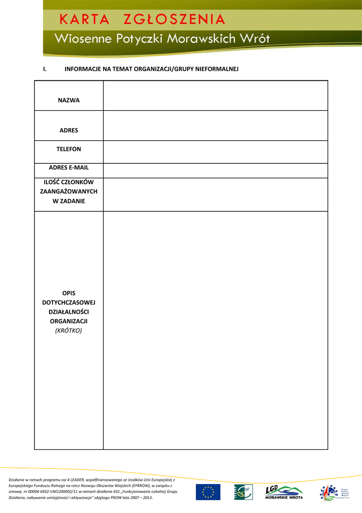 I. INFORMACJE NA TEMAT ORGANIZACJI/GRUPY NIEFORMALNEJ NAZWA ADRES TELEFON ADRES E-MAIL ILOŚĆ CZŁONKÓW ZAANGAŻOWANYCH W ZADANIE OPIS DOTYCHCZASOWEJ DZIAŁALNOŚCI ORGANIZACJI (KRÓTKO) Działanie w ramach programu osi 4 LEADER, współfinansowanego ze środków Unii Europejskiej z Europejskiego Funduszu Rolnego na rzecz Rozwoju Obszarów Wiejskich (EFRROW), w związku z umową nr 00004-6932-UM1200002/11 w ramach działania 431 „Funkcjonowanie Lokalnej Grupy Działania, nabywanie umiejętności i aktywizacja” objętego PROW lata 2007 – 2013. DOTYCHCZAS ZREALIZOWANE INICJATYWY (WYMIENIĆ MAKSYMALNIE TRZY) II. DANE OSOBY UPRAWNIONEJ DO KONTAKTU IMIĘ I NAZWISKO TELEFON ADRES E-MAIL III. INFORMACJE O PROPONOWANEJ INICJATYWIE PROPONOWANA NAZWA PROPONOWANE MIEJSCE I TERMIN REALIZACJI Działanie w ramach programu osi 4 LEADER, współfinansowanego ze środków Unii Europejskiej z Europejskiego Funduszu Rolnego na rzecz Rozwoju Obszarów Wiejskich (EFRROW), w związku z umową nr 00004-6932-UM1200002/11 w ramach działania 431 „Funkcjonowanie Lokalnej Grupy Działania, nabywanie umiejętności i aktywizacja” objętego PROW lata 2007 – 2013. ZAKŁADANY SPOSÓB PROMOCJI WYDARZENIA, DOTARCIA DO MIESZKAŃCÓW OPIS WYDARZENIA/ ZADANIA DO REALIZACJI (ZWIĘŹLE) Działanie w ramach programu osi 4 LEADER, współfinansowanego ze środków Unii Europejskiej z Europejskiego Funduszu Rolnego na rzecz Rozwoju Obszarów Wiejskich (EFRROW), w związku z umową nr 00004-6932-UM1200002/11 w ramach działania 431 „Funkcjonowanie Lokalnej Grupy Działania, nabywanie umiejętności i aktywizacja” objętego PROW lata 2007 – 2013. IV. KOSZTORYS (POWINIEN BYĆ ROZPISANY W PUNKTACH I OBEJMOWAĆ WSZYSTKIE ZAKŁADANE KOSZTY) UWAGA! NALEŻY PODAĆ KWOTY BRUTTO. JEŻELI ZOSTANĄ WOLNE POLA, NALEŻY JE WYKRESKOWAĆ Przykładowo: Wynajem namiotu 1. 2. Działanie w ramach programu osi 4 LEADER, współfinansowanego ze środków Unii Europejskiej z Europejskiego Funduszu Rolnego na rzecz Rozwoju Obszarów Wiejskich (EFRROW), w związku z umową nr 00004-6932-UM1200002/11 w ramach działania 431 „Funkcjonowanie Lokalnej Grupy Działania, nabywanie umiejętności i aktywizacja” objętego PROW lata 2007 – 2013. 500,00 zł brutto 3. 4. 5. 6. 7. 8. 9. 10. 11. Całość przewidywanych kosztów realizacji: .……………………………………………………………. miejscowość i data Działanie w ramach programu osi 4 LEADER, współfinansowanego ze środków Unii Europejskiej z Europejskiego Funduszu Rolnego na rzecz Rozwoju Obszarów Wiejskich (EFRROW), w związku z umową nr 00004-6932-UM1200002/11 w ramach działania 431 „Funkcjonowanie Lokalnej Grupy Działania, nabywanie umiejętności i aktywizacja” objętego PROW lata 2007 – 2013. …………………………………. ……………………………………………………………….. podpis osoby uprawnionej