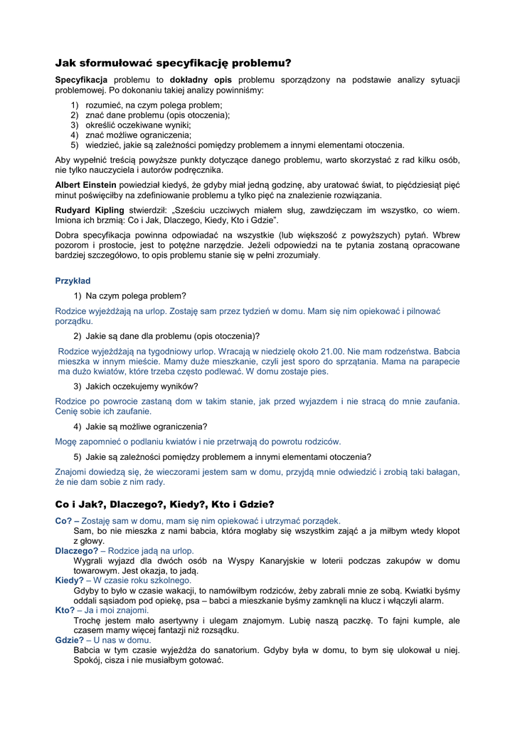Jak sformułować specyfikację problemu? Specyfikacja problemu to dokładny opis problemu sporządzony na podstawie analizy sytuacji problemowej. Po dokonaniu takiej analizy powinniśmy: 1) 2) 3) 4) 5) rozumieć, na czym polega problem; znać dane problemu (opis otoczenia); określić oczekiwane wyniki; znać możliwe ograniczenia; wiedzieć, jakie są zależności pomiędzy problemem a innymi elementami otoczenia. Aby wypełnić treścią powyższe punkty dotyczące danego problemu, warto skorzystać z rad kilku osób, nie tylko nauczyciela i autorów podręcznika. Albert Einstein powiedział kiedyś, że gdyby miał jedną godzinę, aby uratować świat, to pięćdziesiąt pięć minut poświęciłby na zdefiniowanie problemu a tylko pięć na znalezienie rozwiązania. Rudyard Kipling stwierdził: „Sześciu uczciwych miałem sług, zawdzięczam im wszystko, co wiem. Imiona ich brzmią: Co i Jak, Dlaczego, Kiedy, Kto i Gdzie”. Dobra specyfikacja powinna odpowiadać na wszystkie (lub większość z powyższych) pytań. Wbrew pozorom i prostocie, jest to potężne narzędzie. Jeżeli odpowiedzi na te pytania zostaną opracowane bardziej szczegółowo, to opis problemu stanie się w pełni zrozumiały. Przykład 1) Na czym polega problem? Rodzice wyjeżdżają na urlop. Zostaję sam przez tydzień w domu. Mam się nim opiekować i pilnować porządku. 2) Jakie są dane dla problemu (opis otoczenia)? Rodzice wyjeżdżają na tygodniowy urlop. Wracają w niedzielę około 21.00. Nie mam rodzeństwa. Babcia mieszka w innym mieście. Mamy duże mieszkanie, czyli jest sporo do sprzątania. Mama na parapecie ma dużo kwiatów, które trzeba często podlewać. W domu zostaje pies. 3) Jakich oczekujemy wyników? Rodzice po powrocie zastaną dom w takim stanie, jak przed wyjazdem i nie stracą do mnie zaufania. Cenię sobie ich zaufanie. 4) Jakie są możliwe ograniczenia? Mogę zapomnieć o podlaniu kwiatów i nie przetrwają do powrotu rodziców. 5) Jakie są zależności pomiędzy problemem a innymi elementami otoczenia? Znajomi dowiedzą się, że wieczorami jestem sam w domu, przyjdą mnie odwiedzić i zrobią taki bałagan, że nie dam sobie z nim rady. Co i Jak?, Dlaczego?, Kiedy?, Kto i Gdzie? Co? – Zostaję sam w domu, mam się nim opiekować i utrzymać porządek. Sam, bo nie mieszka z nami babcia, która mogłaby się wszystkim zająć a ja miłbym wtedy kłopot z głowy. Dlaczego? – Rodzice jadą na urlop. Wygrali wyjazd dla dwóch osób na Wyspy Kanaryjskie w loterii podczas zakupów w domu towarowym. Jest okazja, to jadą. Kiedy? – W czasie roku szkolnego. Gdyby to było w czasie wakacji, to namówiłbym rodziców, żeby zabrali mnie ze sobą. Kwiatki byśmy oddali sąsiadom pod opiekę, psa – babci a mieszkanie byśmy zamknęli na klucz i włączyli alarm. Kto? – Ja i moi znajomi. Trochę jestem mało asertywny i ulegam znajomym. Lubię naszą paczkę. To fajni kumple, ale czasem mamy więcej fantazji niż rozsądku. Gdzie? – U nas w domu. Babcia w tym czasie wyjeżdża do sanatorium. Gdyby była w domu, to bym się ulokował u niej. Spokój, cisza i nie musiałbym gotować.