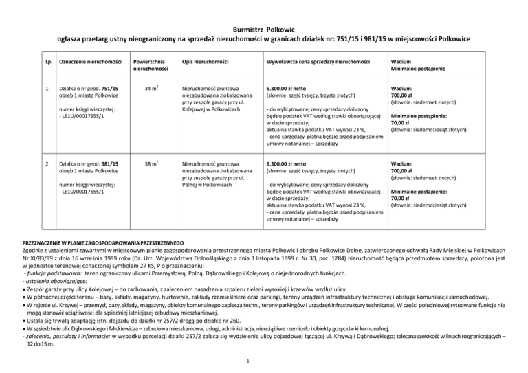Burmistrz Polkowic ogłasza przetarg ustny nieograniczony na sprzedaż nieruchomości w granicach działek nr: 751/15 i 981/15 w miejscowości Polkowice Lp. Oznaczenie nieruchomości Powierzchnia nieruchomości 1. Działka o nr geod. 751/15 obręb 1 miasta Polkowice 34 m 2 numer księgi wieczystej: - LE1U/00017555/1 2. Działka o nr geod. 981/15 obręb 1 miasta Polkowice numer księgi wieczystej: - LE1U/00017555/1 2 38 m Opis nieruchomości Wywoławcza cena sprzedaży nieruchomości Wadium Minimalne postąpienie Nieruchomość gruntowa niezabudowana zlokalizowana przy zespole garaży przy ul. Kolejowej w Polkowicach 6.300,00 zł netto (słownie: sześć tysięcy, trzysta złotych) Wadium: 700,00 zł (słownie: siedemset złotych) Nieruchomość gruntowa niezabudowana zlokalizowana przy zespole garaży przy ul. Polnej w Polkowicach - do wylicytowanej ceny sprzedaży doliczony będzie podatek VAT według stawki obowiązującej w dacie sprzedaży, aktualna stawka podatku VAT wynosi 23 %, - cena sprzedaży płatna będzie przed podpisaniem umowy notarialnej – sprzedaży 6.300,00 zł netto (słownie: sześć tysięcy, trzysta złotych) - do wylicytowanej ceny sprzedaży doliczony będzie podatek VAT według stawki obowiązującej w dacie sprzedaży, aktualna stawka podatku VAT wynosi 23 %, - cena sprzedaży płatna będzie przed podpisaniem umowy notarialnej – sprzedaży Minimalne postąpienie: 70,00 zł (słownie: siedemdziesiąt złotych) Wadium: 700,00 zł (słownie: siedemset złotych) Minimalne postąpienie: 70,00 zł (słownie: siedemdziesiąt złotych) PRZEZNACZENIE W PLANIE ZAGOSPODAROWANIA PRZESTRZENNEGO Zgodnie z ustaleniami zawartymi w miejscowym planie zagospodarowania przestrzennego miasta Polkowic i obrębu Polkowice Dolne, zatwierdzonego uchwałą Rady Miejskiej w Polkowicach Nr XI/83/99 z dnia 16 września 1999 roku (Dz. Urz. Województwa Dolnośląskiego z dnia 3 listopada 1999 r. Nr 30, poz. 1284) nieruchomość będąca przedmiotem sprzedaży, położona jest w jednostce terenowej oznaczonej symbolem 27 KS, P o przeznaczeniu: - funkcja podstawowa: teren ograniczony ulicami Przemysłową, Polną, Dąbrowskiego i Kolejową o niejednorodnych funkcjach. - ustalenia obowiązujące: Zespół garaży przy ulicy Kolejowej – do zachowania, z zaleceniem nasadzenia szpaleru zieleni wysokiej i krzewów wzdłuż ulicy. W północnej części terenu – bazy, składy, magazyny, hurtownie, zakłady rzemieślnicze oraz parkingi, tereny urządzeń infrastruktury technicznej i obsługa komunikacji samochodowej. W rejonie ul. Krzywej – przemysł, bazy, składy, magazyny, obiekty komunalnego zaplecza techn., tereny parkingów i urządzeń infrastruktury technicznej. W części południowej sytuowane funkcje nie mogą stanowić uciążliwości dla sąsiedniej istniejącej zabudowy mieszkaniowej. Ustala się trwałą adaptację istn. dojazdu do działki nr 257/2 drogą po działce nr 260. W sąsiedztwie ulic Dąbrowskiego i Mickiewicza – zabudowa mieszkaniowa, usługi, administracja, nieuciążliwe rzemiosło i obiekty gospodarki komunalnej. - zalecenia, postulaty i informacje: w wypadku parcelacji działki 257/2 zaleca się wydzielenie ulicy dojazdowej łączącej ul. Krzywą i Dąbrowskiego; zalecana szerokość w liniach rozgraniczających – 12 do 15 m. 1 SPOSÓB ZAGOSPODAROWANIA NIERUCHOMOŚCI Nieruchomość przeznaczona pod zabudowę garażem. Uwagi: 1. Realizacja budowy garażu w granicach działki nr 751/15 możliwa jest po uzyskaniu prawa do dysponowania terenem przyległym w granicach działki nr 697 oraz uzyskaniu zgody na zbliżenie się do garażu sąsiedniego. 2. Realizacja budowy garażu w granicach działki nr 981/15 możliwa jest po uzyskaniu prawa do dysponowania terenem przyległym w granicach działki nr 896 oraz uzyskaniu zgody na zbliżenie się do garażu sąsiedniego. 3. W przypadku działki nr 981/15 Nabywca nieruchomości zobowiązany będzie we własnym zakresie i na własny koszt do przebudowy drogi wewnętrznej po opracowaniu stosowanej dokumentacji technicznej wraz z uzgodnieniami przeprowadzonymi m.in. z Urzędem Gminy Polkowice - Wydziałem Inwestycji, Remontów i Utrzymania. 4. Wszelkie uzgodnienia z właścicielami infrastruktury i dróg nabywca nieruchomości wykona we własnym zakresie i na własny koszt. Niezbędną infrastrukturę potrzebną do funkcjonowania obiektu oraz ewentualną przebudowę istniejącego uzbrojenia terenu Nabywca wykona we własnym zakresie i na własny koszt w porozumieniu z właścicielami sieci. 5. W obrębie działki nr 981/15 rosną drzewa i krzewy. W związku z realizacją obiektu usunięcie zieleni może nastąpić zgodnie z obowiązującymi przepisami prawa. WADIUM W przetargu mogą uczestniczyć osoby, które wpłacą wskazane wadium płatne w walucie polskiej na rachunek bankowy Urzędu Gminy Polkowice w PKO BP S.A. I/O Polkowice nr 47 1020 3017 0000 2002 0166 6288, w terminie do dnia 15 marca 2017 r. Dowód wpłaty wadium uczestnik przetargu zobowiązany będzie do okazania w dniu przetargu. Wpłacone wadium zostanie: - zaliczone na poczet ceny nabycia nieruchomości, jeżeli osoba wpłacająca wadium wygra przetarg, - zwrócone, jeżeli osoba wpłacająca nie wygra przetargu - zwrot wadium na pisemnie wskazane konto bankowe, - ulegnie przepadkowi, jeżeli osoba wpłacająca wadium wygra przetarg i nie przystąpi bez usprawiedliwienia w wyznaczonym terminie i miejscu do zawarcia umowy notarialnej. TERMIN I MIEJSCE PRZETARGU Przetarg odbędzie się w siedzibie organizatora przetargu w Urzędzie Gminy Polkowice, ul. Rynek 17 –18 sala konferencyjna dnia 22 marca 2017 r. o godz. 11.00. Przetarg może się odbyć bez względu na liczbę uczestników przetargów jeżeli przynajmniej jeden z uczestników przetargu zaoferuje co najmniej jedno postąpienie powyżej ceny wywoławczej. TERMIN I WARUNKI ZAWARCIA UMOWY SPRZEDAŻY Umowa notarialna sprzedaży nieruchomości nastąpi w przypadku spełnienia wszystkich niżej wym