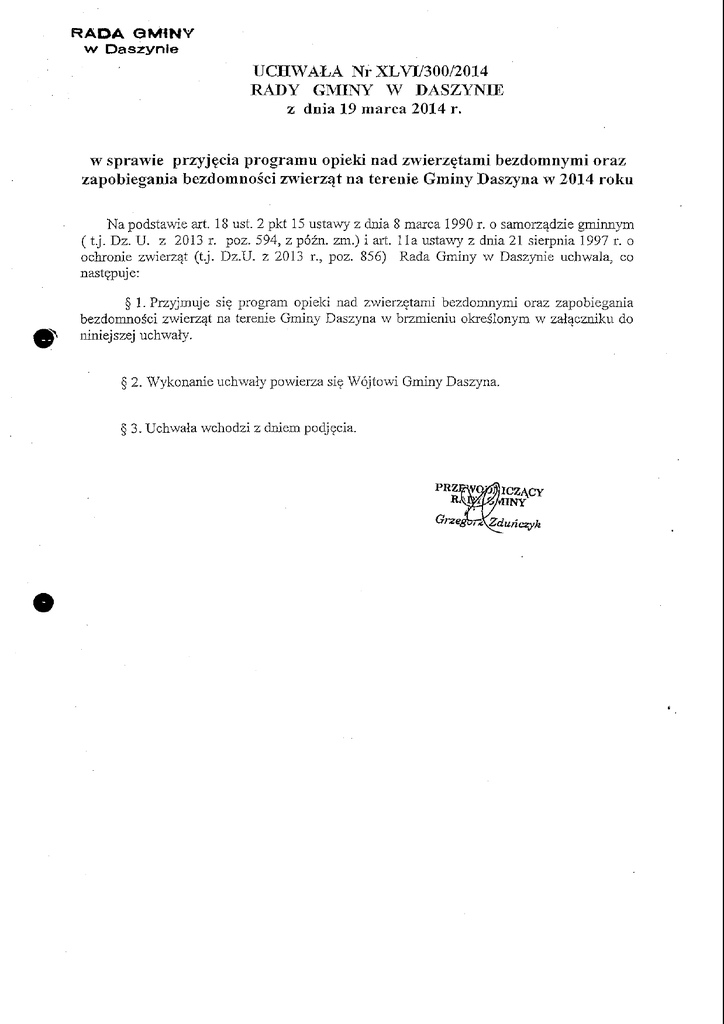 RADA GMINY w Daszynle UCHWALA Nr XLVT7300/2014 RADY GMINY W DASZYNIE z dnia 19 marca 2014 r. w sprawie przyjfcia programu opieki nad zwierzetami bezdomnymi oraz zapobiegania bezdomnosci zwierzat na terenie Gminy Daszyna w 2014 roku Napodstawie art. 18 ust. 2 pkt 15 ustawy z dnia 8 marca 1990 r. o samorzadzie gminnym ( t.j. Dz. U. z 2013 r. poz. 594, z pozn. zm.) i art. l l a ustawy z dnia 21 sierpnia 1997 r. o ochronie zwierzat (t.j. Dz.U. z 2013 r., poz. 856) Rada Grniny w Daszynie uchwala, co nastejpuje: § l.Przyjmuje si? program opieki nad zwierzetami bezdomnymi oraz zapobiegania bezdomnosci zwierzat na terenie Gminy Daszyna w brzmieniu okreslonym w zalaczniku do niniejszej uchwaly. § 2. Wykonanie uchwaly powierza si$ Wqjtowi Gminy Daszyna. § 3. Uchwala wchodzi z dniem podjecia. Zalacznik nr 1 do Uchwaly Nr XLVI/300/2014 Rady Gminy \ Daszynie zdnia 19 marca2014 roku w sprawie przyjecia programu opieki nad rwierzetami bezdomnymi oraz zapobiegania bezdomnosci zwierzat na terenie Gminy Daszyna w2014 r. PROGRAM opieki nad zwierzetami bezdomnymi oraz zapobiegania bezdomnosci zwierzat na terenie Gminy Daszyna w 2014 r., zwany dalej ,,Programem" WPROWADZENIE r w ,,Zwierze, jako istota zyjqca, zdolna do odczuwania cierpienia, nie jest rzeczq. Cztowiek jest mu winien poszanowanie, ochronq. i opieke. " (art. 1 ustawy z dnia 21 sierpnia 1997r. o ochronie zwierzat). .. . . Podstawa_ prawna_ podjecia przez Rad^ Gminy w Daszynie uchwaty w sprawie ,,Programu opieki nad zwierzgtami bezdomnymi oraz zapobiegania bezdomnosci zwierzqt na terenie Gminy Daszyna w 2014r. ", zwanego dalej Programem jest art. 1 la ustawy z dnia 21 sterpnia 1997r. o ochronie zwierzat. Program ma zastosowanie do wszystkich zwierzat domowych, w szczegolnosci psow i kotow, w tym kotow wolno zyjacych oraz zwierzat gospodarskich. Wiekszosc dziataii okreslonych w Programie dotyczy psow i kotow, poniewat skala bezdomnosci tych zwierzat jest najwieksza w calym kraju, jak rowniez na terenie gminy Daszyna. Bezdomnosc zwierzat jest zjawiskiem s'potecznym, ktorego glownymi przyczynami sa_: 1) niekontrolowane rozmnazanie, 2) porzucanie zwierzat przez wlascicieli, 3) ucieczki zwierzat | 4) iatwosc pozyskiwania z\vierz4t, 5) panujace mody na dane rasy zwierzat, 6) brak edukacji i wiedzy spoieczenstwa w zakresie metod zapobiegania bezdomnosci, ze szczegolnym uwzglednieniem stei-ylizacji i kastracji. Zapewnienie opieki bezdomnym zwierzetom oraz ich wylapywanie nalezy do zadan w-lasnych gminy. Jednak co do zasady obowiazek utrzymania zwierzat spoczywa na ich opiekunach. Kto utrzymuje zwierze domowe, ma obowiazek zapewnic mu pomieszczenie chroniace je przed zimnem, upalami t opadami atmosferycznymi, z dostepem do swiatla dziennego, umozliwiaj^ce swobodn^. zmlane pozycji ciaia, odpowiedni^. karme i staiy dostep do wody. Rozdziat 1 POSTANOWIENIA OGOLNE Ilekroc w uchwale jest mowa o: • Urz^dzie, nalezy przez to rozumiec Urzad Gminy Daszyna • Wojcie, nalezy przez to rozumiec Wqjta Gminy Daszyna • RGG, nalezy przez to rozumiec stanowisko pracy ds. rolnictwa, gospodarki gruntami i zabytkow w Urzedzie Gminy Daszyna • Schronisku, nalezy przez to rozumiec Schronisko dla Bezdomnych Zwierzat Domo\vych ,,Przyjaciel" z siedzib^ w Kotliskach 13, 99-300 Kutno REGON: 610296592; NIP: 775-12358-88, zktorym Gmina Daszyna zawarla w dniu 02.01.2014r. umowe na2014 rok, • Firmie Usiugowej, nalezy przez to rozumiec Firm? Us-tugowa ,,Herkules" z siedziba Stowik ul. Gdanska 107, 95-100 Zgierz, REGON: 472617692-00020; NIP: 775-137-02-73, reprezentowana_ przez Pana Zbigniewa Szczechowicza, od-tawiajaca bezdomne zwierzeta, zktor^ Gmina Daszyna zawarla w dniu 02.01.2014r. umowe na2014 rok. • Kotach wolnozyjqcych, nalezy przez to rozumiec koty zyjace lub urodzone na wolnosci (zyjace w otoczeniu czlowieka w stanie dzikim) Koordynatorem Programu jest Wojt Gminy Daszyna, a realizatorami programu sij: • Wqjt Gminy Daszyna za posrednictwem stanowiska pracy ds. rolnictwa, gospodarki gruntami i zabytkow w Urzedzie Gminy Daszyna, • Schronisko dla Bezdomnych Zwierzat Domowych, • Firma Uslugowa wytapujaca oraz przewozaca zwierzeta do schroniska, • Organizacje pozarzadowe zajmujace sie ochrona zwierzat Rozdzial 2 CELIREALIZACJA PROGRAMU Celem Programu jest 1. Zapobieganie bezdomnosci zwierzat oraz opieka nad zwierzetami bezdomnymi z terenu Gminy Daszyna. 2. Program, o Ictorym mowa obejmuje: a) zapewnienie bezdomnym zwierzetom miejsca w schronisku dla zwierzat b) opiek? nad wolno zyjacymi kotami, w tym ich dokarmianie • c) odlawianle bezdomnych zwierzat d) sterylizacj^ lub kastracje zwierzat vv schroniskach dla zwierzat e) poszukiwanie wlascicieli dla bezdomnych zwierzat 2 f) usypianie slepych miotow g) zapewnienie cafodobowej opieki weterynaryjnej w przypadkach zdarzeri drogowych z udziafem zwierzat h) wskazywanie gospodarstwa rolnego w celu zapewnienia miejsca dia zwierzat gospodarskicb; i) edukacja mleszkancow Ad a) Zapewnienie opieki bezdomnym zwierz^tom z terenu Gminy Daszyna realizujq: 1. RGG, poprzez zawieranie umow na prowadzenie schroniska 2. Schronisko, poprzez: • zapewnienie wiasciwych pomieszczen dla zwierzat, ktore tarn beda przebywad i wfasciwych warunkow ich bytowania; • zapewnienie zwierzetom karmy i wody wedhig obowiazujacych norm; • zapewnienie niezbednej opieki weterynaryjnej w zakresie profilaktyki oraz obowiazkowych szczepien; • utrzymania zwierzat do momenta sprzedania, adopcji, smierci, przekazania, zwrotu lab uspienia w przypadkach okreslonych odrebnymi przepisami. Ad b) Opiek§ nad wolno zyjacymi kotami, w tym ich dokarmianie realizuje: • RGG, poprzez podejmowanie interwencji w sprawach kotow wolno zyjacych przy udziale organizacji pozarzadowych orazosob prywatnych. Ad c) Odlawianie bezdomnych zwierzqt realizuje: • RGG, poprzez zawieranie umow na \vyiapywanie i przewozenie do Schroniska bezdomnych zwierzat. • Firma Uslugowa, z ktora wspofpracuje Gmina Daszyna} prowadzaca i dostarczanie do Schroniska bezdomnych zwierzat. Ad d