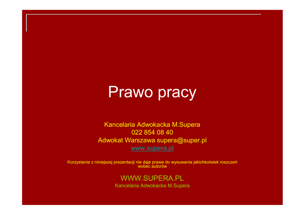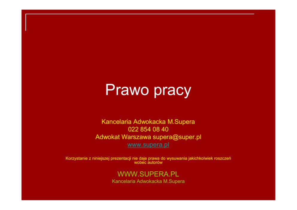 Prawo pracy Kancelaria Adwokacka M.Supera 022 854 08 40 Adwokat Warszawa [email protected] www.supera.pl Korzystanie z niniejszej prezentacji nie daje prawa do wysuwania jakichkolwiek roszczeń wobec autorów WWW.SUPERA.PL Kancelaria Adwokacka M.Supera Definicja prawa pracy Prawo pracy to zbiór norm regulujących stosunki związane z pracą człowieka, w tym prawa i obowiązki pracowników i pracodawców. WWW.SUPERA.PL Kancelaria Adwokacka M.Supera Źródła prawa pracy Przepisy powszechnie obowiązujące: Konstytucja, ustawy, w tym Kodeks pracy, rozporządzenia. Przepisy wewnątrzzakładowe: układy zbiorowe pracy, regulaminy pracy. WWW.SUPERA.PL Kancelaria Adwokacka M.Supera Definicja pracodawcy KP Art. 3 Pracodawcą jest jednostka organizacyjna, choćby nie posiadała osobowości prawnej, a takŜe osoba fizyczna, jeŜeli zatrudniają one pracowników WWW.SUPERA.PL Kancelaria Adwokacka M.Supera KP Art.31 § 1 Za pracodawcę będącego jednostką organizacyjną czynności w sprawach z zakresu prawa pracy dokonuje osoba lub organ zarządzający tą jednostką albo inna wyznaczona do tego osoba. § 2 Przepis § 1 stosuje się odpowiednio do pracodawcy będącego osobą fizyczną, jeŜeli nie dokonuje on osobiście czynności, o których mowa w tym przepisie. WWW.SUPERA.PL Kancelaria Adwokacka M.Supera Zasada uprzywilejowania pracowników Zgodnie z zasadą uprzywilejowania pracowników postanowienia umów o pracę, układów zbiorowych pracy oraz regulaminów pracy nie mogą być mniej korzystne dla pracownika niŜ powszechnie obowiązujące przepisy prawa pracy. WWW.SUPERA.PL Kancelaria Adwokacka M.Supera Stosunek pracy Stosunek pracy to stosunek prawny łączący pracownika i pracodawcę. Pracownik zobowiązuje się do osobistego wykonywania pracy określonego rodzaju w wyznaczonym miejscu i czasie na rzecz pracodawcy i pod jego kierownictwem, a pracodawca zobowiązuje się do zatrudnienia pracownika i wypłaty wynagrodzenia. WWW.SUPERA.PL Kancelaria Adwokacka M.Supera Źródła stosunku pracy Stosunek pracy powstaje na podstawie: umowy o pracę, powołania, wyboru, mianowania. WWW.SUPERA.PL Kancelaria Adwokacka M.Supera Stosunek pracy, a stosunek cywilnoprawny Stosunek cywilnoprawny odróŜnia od stosunku pracy: brak podporządkowania, praca nie musi być wykonana osobiście i pod kierownictwem zleceniodawcy, ryzyko za nienaleŜyte wykonanie pracy ponosi zleceniobiorca wynagrodzenie nie jest koniecznym elementem umowy. WWW.SUPERA.PL Kancelaria Adwokacka M.Supera Zakaz zastępowania umów o pracę umowami cywilnoprawnymi Nawiązanie stosunku pracy następuje bez względu na nazwę zawartej umowy. Niedopuszczalne jest zawieranie umów cywilnoprawnych na warunkach odpowiadających stosunkowi pracy. Zawarcie takiej umowy stanowi wykroczenie przeciwko prawom pracownika i podlega karze grzywny. WWW.SUPERA.PL Kancelaria Adwokacka M.Supera Ustalenie istnienia stosunku pracy Pracownik lub inspektor pracy moŜe domagać się ustalenia istnienia stosunku pracy przez sąd, jeŜeli umowa wbrew swej nazwie ma cechy stosunku pracy. WWW.SUPERA.PL Kancelaria Adwokacka M.Supera Rodzaje umów o pracę Umowa na czas nieokreślony Umowa na czas określony Umowa na czas wykonania określonej pracy Umowa na okres próbny WWW.SUPERA.PL Kancelaria Adwokacka M.Supera Przekształcenie umowy na czas określony w umowę na czas nieokreślony Zawarcie trzeciej kolejnej umowy na czas określony u tego samego pracodawcy powoduje, Ŝe ulega ona przekształceniu z mocy prawa w umowę na czas nieokreślony. Przekształcenie nastąpi, jeŜeli przerwa między kolejnymi umowami o pracę nie przekroczyła jednego miesiąca. Przekształcenie nie dotyczy umów na czas wykonania określonej pracy, umów na okres próbny. WWW.SUPERA.PL Kancelaria Adwokacka M.Supera Rozwiązanie umowy o pracę Rozwiązanie umowy o pracę moŜe nastąpić: na mocy porozumienia pracownika i pracodawcy za wypowiedzeniem przez jedną ze stron bez wypowiedzenia przez jedną ze stron z upływem czasu, na jaki była zawarta z dniem ukończenia pracy WWW.SUPERA.PL Kancelaria Adwokacka M.Supera Okresy wypowiedzenia Przy umowie zawartej na czas nieokreślony okres wypowiedzenia wynosi: 2 tygodnie, jeŜeli pracownik był zatrudniony krócej niŜ 6 miesięcy 1 miesiąc, jeŜeli pracownik był zatrudniony co najmniej 6 miesięcy 3 miesiące, jeŜeli pracownik był zatrudniony co najmniej 3 lata. WWW.SUPERA.PL Kancelaria Adwokacka M.Supera Rozwiązanie umowy o pracę bez wypowiedzenia Pracodawca moŜe rozwiązać umowę o pracę bez wypowiedzenia z winy pracownika w razie: cięŜkiego naruszenia obowiązków pracowniczych popełnienia przestępstwa utraty uprawnień potrzebnych do wykonywania pracy WWW.SUPERA.PL Kancelaria Adwokacka M.Supera Ochrona związana z rodzicielstwem Pracodawca nie moŜe wypowiedzieć ani rozwiązać umowy o pracę w okresie ciąŜy, a takŜe w okresie urlopu macierzyńskiego pracownicy, chyba Ŝe zachodzą przyczyny uzasadniające rozwiązanie umowy bez wypowiedzenia z jej winy i reprezentująca pracownicę zakładowa organizacja związkowa wyraziła zgodę na rozwiązanie umowy. Nie dotyczy to pracownicy w okresie próbnym nie przekraczającym jednego miesiąca. WWW.SUPERA.PL Kancelaria Adwokacka M.Supera Ochrona związana z rodzicielstwem Umowa o pracę zawarta na czas określony lub na czas wykonania określonej pracy albo na okres próbny przekraczający jeden miesiąc, która uległaby rozwiązaniu po upływie trzeciego miesiąca ciąŜy, ulega przedłuŜeniu do dnia porodu. WWW.SUPERA.PL Kancelaria Adwokacka M.Supera Uprawnienia pracownika w razie nieuzasadnionego lub niezgodnego z prawem wypowiedzenia umowy o pracę roszczenie o uznanie wypowiedzenia za bezskuteczne roszczenie o przywrócenie do pracy roszczenie o wynagrodzenie za czas pozostawania bez pracy roszczenie o odszkodowanie WWW.SUPERA.PL Kancelaria Adwokacka M.Supera Czas pracy Podstawowy czas pracy wynosi 8 godzin na dobę i przeciętnie 40 godzin w tygodniu w prz