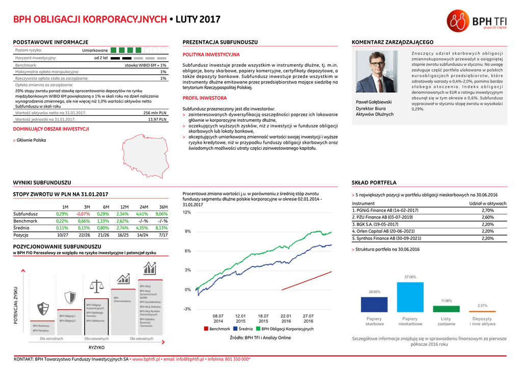 BPH OBLIGACJI KORPORACYJNYCH • LUTY 2017 PODSTAWOWE INFORMACJE Poziom ryzyka: PREZENTACJA SUBFUNDUSZU Umiarkowane Horyzont inwestycyjny: POLITYKA INWESTYCYJNA od 2 lat Benchmark: KOMENTARZ ZARZĄDZAJĄCEGO stawka WIBID 6M + 1% Maksymalna opłata manipulacyjna: 1% Rzeczywista opłata stała za zarządzanie: 1% Opłata zmienna za zarządzanie: 20% stopy zwrotu ponad stawkę oprocentowania depozytów na rynku międzybankowym WIBID 6M powiększoną o 1% w skali roku na dzień naliczania wynagrodzenia zmiennego, ale nie więcej niż 1,0% wartości aktywów netto Subfunduszu w skali roku Wartość aktywów netto na 31.01.2017: 256 mln PLN Wartość jednostki na 31.01.2017: 13,97 PLN DOMINUJĄCY OBSZAR INWESTYCJI > Głównie Polska Subfundusz inwestuje przede wszystkim w instrumenty dłużne, tj. m.in. obligacje, bony skarbowe, papiery komercyjne, certyfikaty depozytowe, a także depozyty bankowe. Subfundusz inwestuje przede wszystkim w instrumenty dłużne emitowane przez przedsiębiorstwa mające siedzibę na terytorium Rzeczypospolitej Polskiej. PROFIL INWESTORA Subfundusz przeznaczony jest dla inwestorów: > zainteresowanych dywersyfikacją oszczędności poprzez ich lokowanie głównie w korporacyjne instrumenty dłużne, > oczekujących wyższych zysków, niż z inwestycji w fundusze obligacji skarbowych lub lokaty bankowe, > akceptujących umiarkowaną zmienność wartości swojej inwestycji i wyższe ryzyko kredytowe, niż w przypadku funduszy obligacji skarbowych oraz świadomych możliwości utraty części zainwestowanego kapitału. WYNIKI SUBFUNDUSZU SKŁAD PORTFELA STOPY ZWROTU W PLN NA 31.01.2017 1M 0,29% 0,22% 0,11% 10/27 Subfundusz Benchmark Średnia Pozycja Paweł Gołębiewski Dyrektor Biura Aktywów Dłużnych Znaczący udział skarbowych obligacji zmiennokuponowych przeważył o osiągniętej stopnie zwrotu subfunduszu w styczniu. Na uwagę zasługuje część portfela ulokowana w polskich euroobligacjach przedsiębiorstw, które odnotowały wzrosty o 0,4%-2,0%, pomimo bardzo słabego otoczenia. Indeks obligacji denominowanych w EUR o ratingu inwestycyjnym obsunął się w tym okresie o 0,6%. Subfundusz wypracował w styczniu stopę zwrotu w wysokości 0,29%. 3M -0,07% 0,66% 0,13% 22/26 6M 0,29% 1,33% 0,80% 21/26 12M 2,34% 2,62% 2,74% 16/25 24M 4,41% -/-% 4,35% 14/24 36M 9,06% -/-% 8,13% 7/17 POZYCJONOWANIE SUBFUNDUSZU w BPH FIO Parasolowy ze względu na ryzyko inwestycyjne i potencjał zysku Procentowa zmiana wartości j.u. w porównaniu z średnią stóp zwrotu funduszy segmentu dłużne polskie korporacyjne w okresie 02.01.2014 31.01.2017 12% 9% > 5 największych pozycji w portfelu obligacji nieskarbowych na 30.06.2016 Instrument 1. PGNiG Finance AB (14-02-2017) 2. PZU Finance AB (03-07-2019) 3. BGK S.A. (19-05-2017) 4. Orlen Capital AB (20-06-2021) 5. Synthos Finance AB (30-09-2021) Udział w aktywach 2,70% 2,60% 2,20% 2,20% 2,20% > Struktura portfela na 30.06.2016 6% 3% 57.06% POTENCJAŁ ZYSKU BPH Akcji BPH Zrównoważony BPH Akcji Dynamicznych Spółek BPH Akcji Globalny BPH Obligacji 1 BPH Stabilnego Wzrostu BPH Akcji Rynków Wschodzących BPH Obligacji 2 BPH Selektywny BPH Globalny Żywności i Surowców BPH Pieniężny Dla ostrożnych Dla rozważnych 28.65% 11.98% BPH Dywidendowy BPH Obligacji Korporacyjnych BPH Skarbowy 0% Dla odważnych 2.31% -3% 08.07 2014 Benchmark 12.01 2015 Średnia 18.07 2015 22.01 2016 KONTAKT: BPH Towarzystwo Funduszy Inwestycyjnych SA • www.bphtfi.pl • email: [email protected] • Infolinia: 801 350 000* Papiery skarbowe Papiery nieskarbowe Listy zastawne Depozyty i inne aktywa BPH Obligacji Korporacyjnych Źródło: BPH TFI i Analizy Online RYZYKO 27.07 2016 Szczegółowe informacje znajdują się w sprawozdaniu finansowym za pierwsze półrocze 2016 roku BPH OBLIGACJI KORPORACYJNYCH • LUTY 2017 DODATKOWE INFORMACJE Zarządzający: Marcin Winnicki, Jarosław Lis, Michał Sikorski, Monika Zduńska, Paweł Gołębiewski Waluta subfunduszu: Częstotliwość wyceny: NARZĘDZIA DLA INWESTORA SERWIS SMS/E-MAIL INWESTUJ ONLINE - POZNAJ BPHTFI24 Jak być na bieżąco z informacjami dotyczącymi moich inwestycji? Zawsze aktualne informacje na SMS lub e-mail. W celu otrzymywania aktualnych informacji związanych z funduszami BPH TFI, w tym: wycenę jednostek uczestnictwa lub certyfikatów inwestycyjnych, aktualności, ogłoszenia prawne, zapraszamy do rejestracji w Serwisie SMS/E-mail dostępnym na: www.bphtfi.pl/serwis-smse-mail. Przykładowa wiadomość może wyglądać jak na rysunku poniżej. PLN codzienna Wartość początkowa jednostki: 13,17 PLN Data utworzenia subfunduszu: 11.01.2000 NA CO ZWRACAĆ UWAGĘ Rozważając inwestycje w Fundusze warto zwrócić uwagę lub zapytać doradcę o: > horyzont inwestycyjny, > poziom ryzyka - wynikający ze stosowanej polityki inwestycyjnej, określający możliwą zmienność inwestycji w przyszłości, > wskaźnik zysku do ryzyka - określający historyczną zmienność inwestycji (prezentowany w Kluczowych Informacjach dla Inwestorów), > poziom opłat. KONTAKT Nowy Serwis Transakcyjno-Informacyjny pozwala w łatwy i szybki sposób zarządzać Twoimi inwestycjami bez wychodzenia z domu. Wejdź na www.bphtfi24.pl NOTOWANIA I ANALIZY > sprawdź aktualne i historyczne wyniki poszczególnych Subfunduszy lub portfela Subfunduszy, > sprawdź na wykresie lub przy użyciu tabeli stóp zwrotu wyniki Subfunduszy, porównaj je zbenchmarkami i indeksami BPH Towarzystwo Funduszy Inwestycyjnych SA www.bphtfi.pl email: [email protected] Infolinia: 801 350 000* Wejdź na www.bphtfi.pl/analizy RANKING 12M/36M – ranking krótkoterminowy i długoterminowy, bazuje na wynikach działalności Subfunduszu na przestrzeni ostatnich 12 miesięcy i 36 miesięcy. ŚREDNIA: średnia stóp zwrotu funduszy grupy porównawczej wg Analizy Online POZYCJA: pozycja funduszu w grupie porównawczej wg Analizy Online ZASTRZEŻENIA * koszt połączenia wg taryfy operatora Niniejsze opracowanie zostało przygotowane przez BPH TFI S