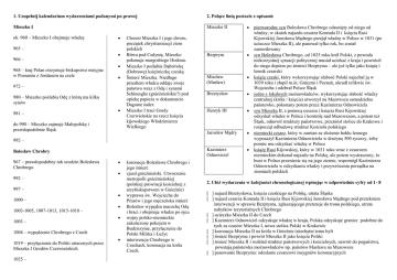 1. Uzupełnij kalendarium wydarzeniami podanymi po prawej 2. Połącz linią postacie z opisami: Mieszko I Mieszko II Bezprym Miecław (Masław) Brzetysław Henryk III Jarosław Mądry Kazimierz Odnowiciel ok. 960 – Mieszko I obejmuje władzę 965 – 966 – 968 – kraj Polan otrzymuje biskupstwo misyjne w Poznaniu z Jordanem na czele 972 – 980 – Mieszko poślubia Odę z którą ma kilku synów 981 – do 990 – Mieszko zajmuje Małopolskę i prawdopodobnie Śląsk Chrzest Mieszka I i jego dworu, początek chrystianizacji ziem polskich Bitwa pod Cedynią. Mieszko pokonuje margrabiego Hodona. Mieszko I poślubia Dąbrówkę (Dobrawę) księżniczkę czeską Śmierć Mieszka. Niedługo przedtem władca oddaje swoje państwo wraz z Odą i synami Schinesghe (gnieźnieńskie?) pod opiekę papieża w dokumencie Dagome iudex Mieszko I traci Grody Czerwieńskie na rzecz księcia kijowskiego Włodzimierza Wielkiego 992 – Bolesław Chrobry 967 – prawdopodobny rok urodzin Bolesława Chrobrego 992 – 997 – 1000 – 1003-1005, 1007-1013, 1015-1018 – 1003 – 1004 – wypędzenie Chrobrego z Czech 1019 – przyłączenie do Polski utraconych przez Mieszka I Grodów Czerwieńskich 1025 – koronacja Bolesława Chrobrego i jego śmierć zjazd gnieźnieński. Utworzenie metropolii gnieźnieńskiej (polskiej prowincji kościelnej z arcybiskupstwem w Gnieźnie) wyprawa św. Wojciecha do Prusów i jego męczeńska śmierć Bolesław wypędza macochę Odę i braci i obejmuje władze po ojcu wojny polsko-niemieckie zakończone pokojem w Budziszynie, przyłączenie do Polski Milska i Łużyc interwencja Chrobrego w Czechach, koronacja na króla Czech. pierworodny syn Bolesława Chrobrego odsunięty od niego od władzy; w skutek najazdu cesarza Konrada II i księcia Rusi Kijowskiej Jarosława Mądrego przejął władzę w Polsce w 1031 (po ucieczce Mieszka II), ale panował tylko rok, bo został zamordowany syn Bolesława Chrobrego, od 1025 roku król Polski, z powodu niekorzystnej sytuacji politycznej musiał uciekać z kraju i powrócił do niego dopiero po śmierci Bezpryma – ale już tylko jako książę i lennik cesarski książę czeski, który wykorzystując słabość Polski najechał ją w 1039 roku i złupił m.in. Gniezno i Poznań, ukradł relikwie św. Wojciecha i odebrał Polsce Śląsk jeden z lokalnych możnowładców, wykorzystując słabość władzy centralnej (króla / księcia) utworzył na Mazowszu samodzielne państewko, pokonany potem przez Kazimierza Odnowiciela syn Mieszka II, z pomocą cesarza i księcia Rusi Kijowskiej odzyskał władze w Polsce i kontrolę nad Mazowszem, a potem też Śląsk, odnowił struktury państwowe, przeniósł stolice do Krakowa i rozpoczął odbudowę struktur Kościoła polskiego niemiecki cesarz, który w zamian za złożenie hołdu lennego wyposażył Kazimierza Odnowiciela w drużynę 500 rycerzy, żeby pomóc mu odzyskać władzę w Polsce książę Rusi Kijowskiej, który w 1031 roku wraz z cesarzem niemieckim dokonał najazdu na Polskę, ale potem wystraszony, że bunt w Polsce przeniesie się na jego ziemie, wspomógł Kazimierza Odnowiciela w odzyskaniu władzy i przywróceniu porządku na ziemiach polskich 2. Ułóż wydarzenia w kolejności chronologicznej wpisując w odpowiednie cyfry od 1- 8 [ ] najazd Brzetysława, księcia czeskiego na Polskę, utrata Śląska [ ] najazd cesarza Konrada II i księcia Rusi Kijowskiej Jarosława Mądrego pod pretekstem interwencji w sprawie Bezpryma, zgłaszającego pretensje do tronu polskiego, utrata nabytków terytorialnych Chrobrego [ ] ucieczka Mieszka II do Czech [ ] Kazimierz Odnowiciel odzyskuje władzę w kraju, Polska odzyskuje granice podobne do tych za czasów Mieszka I, nowa stolica Polski w Krakowie [ ] koronacja Mieszka II na króla w Gnieźnie (niechętni temu byli [ ] śmierć Bezpryma i powrót Mieszka II jako księcia Polski [ ] śmierć Mieszka II i rozkład struktur państwowych i kościelnych, nawrót do pogaństwa, powstają państewka możnowładców np. państwo Masława na Mazowszu [ ] panowanie Bezpryma: odesłanie cesarzowi insygniów koronacyjnych