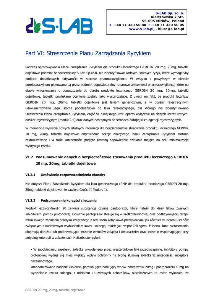 S-LAB Sp. zo. o. Kiełczowska 2 Str. 55-095 Mirków, Poland T. +48 71 330 50 80 F.+48 71 330 50 05 www.s-lab.pl, , [email protected] Part VI: Streszczenie Planu Zarządzania Ryzykiem Podczas opracowywania Planu Zarządzania Ryzykiem dla produktu leczniczego GERDIN 20 mg, 20mg, tabletki dojelitowe podmiot odpowiedzialny S-LAB Sp.zo.o. nie zidentyfikował żadnych istotnych ryzyk, które wymagałyby podjęcia dodatkowych aktywności w zakresie pharmacovigilance. W związku z powyższym w okresie porejestracyjnym planowane są przez podmiot odpowiedzialny rutynowe aktywności pharmacovigilance, które na etapie wnioskowania o dopuszczenie do obrotu produktu leczniczego GERDIN 20 mg, 20mg, tabletki dojelitowe, tabletki powlekane ocenione zostały jako wystarczające. Z uwagi na fakt, że produkt leczniczy GERDIN 20 mg, 20mg, tabletki dojelitowe jest lekiem generycznym, a w dossier rejestracyjnym udokumentowano jego istotne podobieństwo do leku referencyjnego, dla którego nie zidentyfikowano Streszczenia Planu Zarządzania Ryzykiem, część VI niniejszego RMP oparto wyłącznie na danych literaturowych, dossier rejestracyjnym [moduł 2.5] oraz danych dostępnych na stronach europejskich agencji rejestracyjnych. W momencie wykrycia nowych istotnych informacji dla bezpieczeństwa stosowania produktu leczniczego GERDIN 20 mg, 20mg, tabletki dojelitowe odpowiednie sekcje niniejszego Planu Zarządzania Ryzykiem zostaną zaktualizowane i w razie konieczności podjęte zostaną odpowiednie działania mające na celu minimalizację wykrytego ryzyka. VI.2 Podsumowanie danych o bezpieczeństwie stosowania produktu leczniczego GERDIN 20 mg, 20mg, tabletki dojelitowe VI.2.1 Omówienie rozpowszechnienia choroby Nie dotyczy Planu Zarządzania Ryzykiem dla leku generycznego (RMP dla produktu leczniczego GERDIN 20 mg, 20mg, tabletki dojelitowe nie zawiera Części II Modułu I). VI.2.2 Podsumowanie korzyści z leczenia Produkt leczniczyGerdin 20 zawiera substancję czynną pantoprazol, który należy do klasy leków zwanych inhibitorami pompy protonowej. Doustnie pantoprazol stosuje się w krótkoterminowej oraz podtrzymującej terapii refluksowego zapalenia przełyku związanego z refluksem żołądkowo-przełykowym, jak również w leczeniu stanów związanych z nadmiernym wydzielaniem kwasu solnego, takich jak zespół Zollingera -Ellisona. Inne zastosowania obejmują doraźne lub podtrzymujące leczenie wrzodów żołądka i dwunastnicy oraz leczenie wspomagające przy antybiotykoterapii w zakażeniach Helicobacter pylori. • W zapobieganiu zapaleniu żołądka wywołanego przez niesteroidowe leki przeciwzapalne, inhibitory pompy protonowej wydają się mieć większy wpływ ochronny na błonę śluzową żołądkaniż antagoniści receptora histaminowego. •Randomizowane badanie kliniczne, porównujące hamujący wpływ omeprazolu 20mg i pantoprazolu 40mg na wydzielanie kwasu solnego, z udziałem 16 zdrowych ochotników, niezakażonych H. pylori wykazało, że GERDIN 20 mg, 20mg, tabletki dojelitowe S-LAB Sp. zo. o. Kiełczowska 2 Str. 55-095 Mirków, Poland T. +48 71 330 50 80 F.+48 71 330 50 05 www.s-lab.pl, , [email protected] omeprazol i pantoprazol ma podobną skuteczność łagodzenia objawów po 4 tygodniach leczenia refluksowego zapalenia przełyku. •W randomizowanym badaniu klinicznym z udziałem 585 pacjentów z nadżerkową postacią choroby refluksowej, leczonych pantoprazolem lub esomeprazolem w dawce 40mg raz na dobę wykazano, że pantoprazol w dawce 40mg był co najmniej tak samo skuteczny jak esomeprazol 40mg w łagodzeniu objawów choroby. •36 – miesięczne badania bezpieczeństwa i skuteczności, z udziałem 24 pacjentów wykazały, że podtrzymująca terapia pantoprazolemw okresie do 3 lat, w dawkach 40-120mg na dobę była skuteczna i bezpieczna u pacjentów z zespołem Zollingera-Ellisona i innymi schorzeniami przebiegającymi z nadmiernym wydzielaniem kwasu solnego. •Doświadczenia obejmujące stosowanie pantoprazolu w okresie ciąży są ograniczone, jednakże badanie porównawcze obejmujące 410 ciąż narażonych na omeprazol, lanzoprazol lub pantoprazol sugeruje, że stosowanie inhibitorów pompy protonowej nie stanowi istotnego ryzyka działania teratogennego u ludzi. Ocena ponad 100 badań klinicznych wykazała, że pantoprazol ma dobry profil bezpieczeństwa, jest skuteczny tak jak inne inhibitory pompy protonowej oraz wykazuje niski poziom interakcji. Wykazano również, że pantoprazol jest skuteczny i bezpieczny w stosowaniu u osób starszych i osób z niewydolnością nerek lub umiarkowaną niewydolnością wątroby. VI.2.3 Nieznane informacje dotyczące korzyści z leczenia Dzieci i młodzież: Ze względu na brak doświadczeń pantoprazolu nie należy stosować u dzieci i młodzieży. VI.2.4 • Podsumowanie kwestii bezpieczeństwa Istotne zidentyfikowane ryzyka Brak zidentyfikowanych istotnych zagrożeń. • Istotne potencjalne ryzyka Brak zidentyfikowanych potencjalnych zagrożeń. • Brakujące informacje Nie zidentyfikowano. VI.2.5 Podsumowanie środków minimalizacji ryzyka Produkt leczniczy GERDIN 20 mg, 20mg, tabletki dojelitowe zawiera Charakterystykę Produktu Leczniczego (ChPL), która zapewnia lekarzom, farmaceutom i innym fachowym pracownikom służby zdrowia szczegółowe informacje dotyczące stosowania leku, przedstawia ryzyka oraz zalecenia dotyczące ich minimalizacji. Skrócona wersja tej informacji jest przedstawiona językiem potocznym w formie ulotki dla pacjenta dołączonej do opakowania. Odpowiednie opracowanie, utrzymanie w stanie aktualnym niniejszych dokumentów oraz udostępnianie ich pacjentom z każdym opakowaniem leku, jak również fachowym pracownikom służby zdrowia, stanowi rutynowe narzędzie minimalizacji ryzyka. GERDIN 20 mg, 20mg, tabletki dojelitowe S-LAB Sp. zo. o. Kiełczowska 2 Str. 55-095 Mirków, Poland T. +48 71 330 50 80 F.+48 71 330 50 05 www.s-lab.pl, , [email protected] Dla produktu leczniczego GERDIN 2
