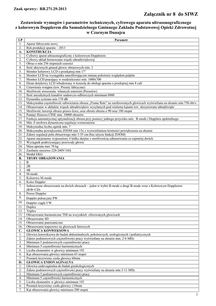 Znak sprawy: RB.271.29-2013 Załącznik nr 8 do SIWZ Zestawienie wymogów i parametrów technicznych, cyfrowego aparatu ultrasonograficznego z kolorowym Dopplerem dla Samodzielnego Gminnego Zakładu Podstawowej Opieki Zdrowotnej w Czarnym Dunajcu LP 1. 2. A. 1. 2. 3. 4. 5. 6. 7. 8. 9. 10. 11. 12. 13. 14. 15. 16. 17. 18. 19. 20. 21. 22. 23. 24. 25. 26. B. 1. 2. 3. 4. 5. 6. 7. 8. 9. 10. 11. 12. 13. 14. 15. 16. C. 1. 2. 3. 4. 5. 6. 7. D. 1. 2. 3. 4. 5. 6. 7. Parametr Aparat fabrycznie nowy Rok produkcji aparatu – 2013 KONSTRUKCJA Cyfrowy aparat ultrasonograficzny z kolorowym Dopplerem Cyfrowy układ formowania wiązki ultradźwiękowej Obraz o min 256 stopniach szarości Ilość aktywnych gniazd głowic obrazowych min. 3 Monitor kolorowy LCD o przekątnej min 17” Monitor LCD na wysięgniku umożliwiającym zmianę położenia względem pulpitu Monitor LCD pracujący w rozdzielczości min. 1000x700 Ekran dotykowy LCD wbudowany w konsolę do obsługi aparatu o przekątnej min 8 cali Ustawienia wstępne (tzw. Presety fabryczne) Możliwość stworzenia własnych ustawień (Presetów) Ilość niezależnych kanałów nadawczo-odbiorczych minimum 8000 Dynamika systemu min 170 dB Maksymalna częstotliwość odświeżania obrazu „Frame Rate” na zaoferowanych głowicach wyświetlana na ekranie min.750 obr/s Obrazowanie w układzie wiązek ultradźwięków wysyłanych pod wieloma kątami tzw. skrzyżowane ultradźwięki Możliwość inwersji obrazu prawo-lewo, oraz obrotu obrazu o 90 oraz 180 stopni Pamięć filmowa CINE min. 10000 obrazów Funkcja automatycznej optymalizacji obrazu przy pomocy jednego przycisku min. B-mode i Dopplera spektralnego Min. 8 strefowa dynamiczna regulacja wzmocnienia Maksymalna liczba ognisk min. 7 Maksymalne powiększenia ZOOM min 15x z wyświetlaniem krotności powiększenia na ekranie Zakres regulacji pola obrazowego min 3-35 cm (bez użycia funkcji ZOOM) Aparat stacjonarny wyposażony 4 kółka skrętne z możliwością zahamowania co najmniej dwóch Wysięgnik podtrzymujący przewody głowic Masa aparatu max 70 kg Zasilanie sieciowe 220-240V/10A Moduł EKG TRYBY OBRAZOWANIA B 2B 4B M-mode Kolorowy M-mode Kolor Doppler Jednoczesne obrazowanie na dwóch obrazach – jeden w trybie B-mode a drugi B-mode wraz z Kolorowym Dopplerem (B/B+CD) Power Doppler Doppler pulsacyjny PW Doppler ciągły CW Duplex Triplex Obrazowanie harmoniczne THI na wszystkich oferowanych głowicach Obrazowanie 4D Obrazowanie panoramiczne Obrazowanie trapezowe na głowicach liniowych GŁOWICA KONWEKSOWA Głowica konweksowa do badań abdominalnych, położniczych, urologicznych i pediatrycznych Zakres podstawowych częstotliwości pracy wyświetlany na ekranie min. 2-6 MHz Minimum 5 podstawowych częstotliwości pracy Minimum 5 częstotliwości harmonicznych Liczba elementów w głowicy minimum 192 Kąt obrazowania głowicy minimum 65 stopni Promień krzywizny czoła głowicy 60mm GŁOWICA ENDOVAGINALNA Głowica endovaginalna do badań ginekologicznych Zakres podstawowych częstotliwości pracy wyświetlany na ekranie min 3-11 MHz Minimum 5 podstawowych częstotliwości pracy Minimum 5 częstotliwości harmonicznych Liczba elementów w głowicy minimum 192 Promień krzywizny czoła głowicy ≤10mm Kąt obrazowania głowicy minimum 200 stopni 1 Znak sprawy: RB.271.29-2013 E. 1. 2. 3. 4. 5. 6. 7. 8. 9. F. 1. 2. 3. 4. 5. 6. 7. 8. 9. G. 1. 2. 3. 4. 5. 6. 7. 8. 9. 10. 11. H. 1. 2. 3. I. 1. 2. 3. 4. K. 1. Pomiary Pomiar odległości minimum 12 par znaczników wyświetlanych jednocześnie na ekranie Pomiar pola powierzchni Pomiar objętości min dwiema metodami Pomiary położnicze min.: GS, CRL, BPD, AC, HC, FL, NT Pomiar masy płodu Możliwość wybory metody pomiaru masy płodu Pomiary ginekologiczne: min. jajniki, macica, pęcherzyk Możliwość programowania klawiszy pomiarowych Pomiar kątów metodą Grafa Pomiary Dopplerowskie Prędkość przepływu: minimalna, maksymalna, średnia Indeksy: PI i RI Pomiary gradientów Współczynnika skurczowo-rozkurczowego S/D Tętna Procent zwężenia Funkcja automatycznej analizy widma Dopplerowskiego w czasie rzeczywistym z wyznaczaniem parametrów przepływu Funkcja automatycznej analizy widma Dopplerowskiego na zatrzymanym spektrum z wyznaczaniem parametrów przepływu Funkcja półautomatycznej analizy widma Dopplerowskiego (użytkownik wyznacza granice odcinka spektrum, który zostaje poddany automatycznej analizie) ARCHIWIZACJA Wideoprinter czarno-biały Wbudowany w aparat system archiwizacji obrazów na dysku twardym min 300 GB Wbudowana nagrywarka płyt DVD Archiwizacja badań – obrazy i sekwencje video Archiwizacja raportów z badań Zapis raportów z badań w formacie PDF Możliwość bezpośredniego wydruku obrazów z aparatu na drukarce komputerowej Wyjście cyfrowe USB lub Ethernet umożliwiające transmisję danych do PC Przenoszenie danych na nośnikach danych typu Pendrive Wyjście VGA umożliwiające podłączenie do ultrasonografu dodatkowego monitora Moduł DICOM 3.0 moduły minimum: Store, Worklist, Print MOŻLIWOŚCI ROZBUDOWY Możliwość rozbudowy o głowicę kardiologiczną dla dorosłych o min. zakresie częstotliwości 2-4 MHz Możliwość rozbudowy o głowicę konweksową wolumetryczną do badań 4D Możliwość rozbudowy o głowicę liniową do badań płytko położonych narządów, przepływów naczyniowych o min. Zakresie częstotliwości 5-15 MHz WARUNKI SERWISU Instrukcja obsługi aparatu w języku polskim Certyfikat CE Czas reakcji serwisu w ciągu 24h Aparat zastępczy w przypadku naprawy dłuższej niż 48h GWARANCJA Czas gwarancji: 24 m-ce 2