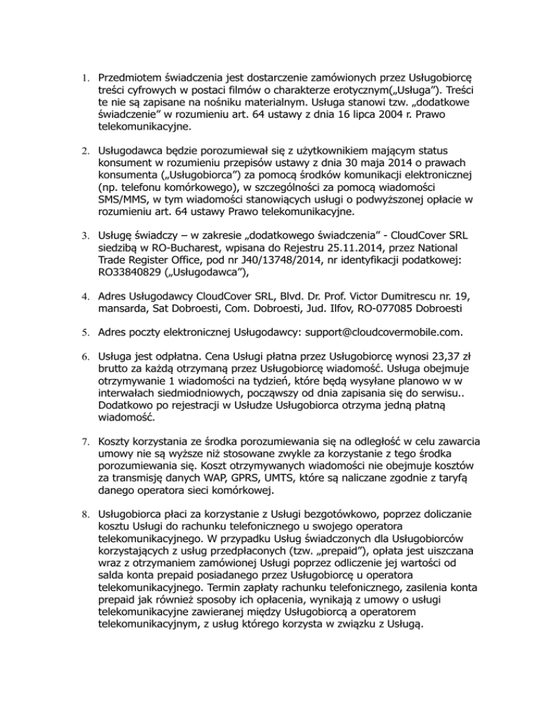 1. Przedmiotem świadczenia jest dostarczenie zamówionych przez Usługobiorcę treści cyfrowych w postaci filmów o charakterze erotycznym(„Usługa”). Treści te nie są zapisane na nośniku materialnym. Usługa stanowi tzw. „dodatkowe świadczenie” w rozumieniu art. 64 ustawy z dnia 16 lipca 2004 r. Prawo telekomunikacyjne. 2. Usługodawca będzie porozumiewał się z użytkownikiem mającym status konsument w rozumieniu przepisów ustawy z dnia 30 maja 2014 o prawach konsumenta („Usługobiorca”) za pomocą środków komunikacji elektronicznej (np. telefonu komórkowego), w szczególności za pomocą wiadomości SMS/MMS, w tym wiadomości stanowiących usługi o podwyższonej opłacie w rozumieniu art. 64 ustawy Prawo telekomunikacyjne. 3. Usługę świadczy – w zakresie „dodatkowego świadczenia” - CloudCover SRL siedzibą w RO-Bucharest, wpisana do Rejestru 25.11.2014, przez National Trade Register Office, pod nr J40/13748/2014, nr identyfikacji podatkowej: RO33840829 („Usługodawca”), 4. Adres Usługodawcy CloudCover SRL, Blvd. Dr. Prof. Victor Dumitrescu nr. 19, mansarda, Sat Dobroesti, Com. Dobroesti, Jud. Ilfov, RO-077085 Dobroesti 5. Adres poczty elektronicznej Usługodawcy: [email protected]. 6. Usługa jest odpłatna. Cena Usługi płatna przez Usługobiorcę wynosi 23,37 zł brutto za każdą otrzymaną przez Usługobiorcę wiadomość. Usługa obejmuje otrzymywanie 1 wiadomości na tydzień, które będą wysyłane planowo w w interwałach siedmiodniowych, począwszy od dnia zapisania się do serwisu.. Dodatkowo po rejestracji w Usłudze Usługobiorca otrzyma jedną płatną wiadomość. 7. Koszty korzystania ze środka porozumiewania się na odległość w celu zawarcia umowy nie są wyższe niż stosowane zwykle za korzystanie z tego środka porozumiewania się. Koszt otrzymywanych wiadomości nie obejmuje kosztów za transmisję danych WAP, GPRS, UMTS, które są naliczane zgodnie z taryfą danego operatora sieci komórkowej. 8. Usługobiorca płaci za korzystanie z Usługi bezgotówkowo, poprzez doliczanie kosztu Usługi do rachunku telefonicznego u swojego operatora telekomunikacyjnego. W przypadku Usług świadczonych dla Usługobiorców korzystających z usług przedpłaconych (tzw. „prepaid”), opłata jest uiszczana wraz z otrzymaniem zamówionej Usługi poprzez odliczenie jej wartości od salda konta prepaid posiadanego przez Usługobiorcę u operatora telekomunikacyjnego. Termin zapłaty rachunku telefonicznego, zasilenia konta prepaid jak również sposoby ich opłacenia, wynikają z umowy o usługi telekomunikacyjne zawieranej między Usługobiorcą a operatorem telekomunikacyjnym, z usług którego korzysta w związku z Usługą. 9. Usługa jest świadczona poprzez wysyłanie Usługobiorcy, na podany przez niego numer telefonu komórkowego, zamówionych przez niego treści cyfrowych. Treści te będą wysyłane planowo raz w tygodniu. Terminy te mogą ulec zmianie z przyczyn niezależnych od Usługodawcy np. w razie zaistnienia problemów technicznych po stronie operatora telekomunikacyjnego, z usług którego korzysta Usługobiorca. Z uwagi na brak możliwości zwrotu treści cyfrowych, realizacja Usługi rozpocznie się niezwłocznie po zawarciu umowy pod warunkiem udzielenia przez Usługobiorcę zgody na rozpoczęcie spełniania świadczenia przed upływem terminu do odstąpienia od umowy. W braku takiej zgody realizacja Usługi rozpocznie się niezwłocznie po upływie terminu do odstąpienia od umowy o ile Usługobiorca w międzyczasie od niej nie odstąpił. Wyrażenie zgody, o której mowa powyżej oznacza utratę prawa do odstąpienia od umowy przez Usługobiorcę. 10. Reklamacje można kierować drogą: wiadomości poczty elektronicznej na adres [email protected], pocztową na adres CloudCover SRL, Blvd. Dr. Prof. Victor Dumitrescu nr. 19, mansarda, Sat Dobroesti, Com. Dobroesti, Jud. Ilfov, RO-077085 Dobroesti (list z dopiskiem „Reklamacja”) lub telefonicznie na nr telefonu 012 3966141. Reklamacje są rozpatrywane (a w przypadku zgłaszania ich telefonicznie również przyjmowane) w dni robocze, od poniedziałku do piątku w godz. 10.00-15.00. Termin rozpatrzenia reklamacji wynosi 4 dni roboczych od dnia jej wpływu do Usługodawcy. Termin ten może ulec zmianie jeżeli do rozpatrzenia reklamacji konieczne okaże się uzyskanie informacji od operatorów telekomunikacyjnych lub podmiotów współpracujących z Usługodawcą przy świadczeniu Usługi albo też dodatkowych informacji od Usługobiorcy. Usługodawca może domagać się od wnoszącego reklamację podania dodatkowych informacji o ile są one niezbędne do rozpatrzenia tej reklamacji. W takim przypadku czasu oczekiwania na podanie takich dodatkowych informacji nie uwzględnia się w czasie rozpatrywania reklamacji. O wyniku rozpatrzenia reklamacji Usługobiorca zostanie poinformowany pisemnie, drogą wiadomości poczty elektronicznej lub telefonicznie. Negatywne rozpatrzenie reklamacji wymaga uzasadnienia. 11. Usługobiorcy przysługuje prawo odstąpienia od umowy bez podawania jakiejkolwiek przyczyny w terminie 14 dni od dnia jej zawarcia. Odstąpienie od umowy polega na złożeniu przez Usługobiorcę na adres: CloudCover SRL, Blvd. Dr. Prof. Victor Dumitrescu nr. 19, mansarda, Sat Dobroesti, Com. Dobroesti, Jud. Ilfov, RO-077085 Dobroesti jednoznacznego oświadczenia o odstąpieniu od umowy. Można przy tym skorzystać z wzoru takiego oświadczenia stanowiącego załącznik nr 2 do ustawy z dnia 30 maja 2014 r. o prawach konsumenta. Skorzystanie z tego wzoru nie jest jednak obowiązkowe. Aby zachować termin do odstąpienia od umowy wystarczy wysłać oświadczenie o takim odstąpieniu przed upływem terminu do tego odstąpienia. W przypadku odstąpienia od niniejszej umowy Usługodawca zwraca Usługobiorcy wszystkie otrzymane od Usługobiorcy płatności, niezwłocznie, a w każdym przypadku nie później niż 14 dni od dnia, w którym Usługodawca został po