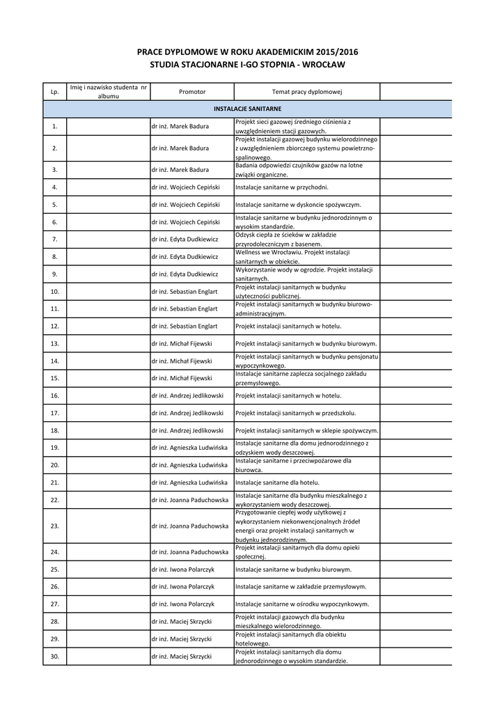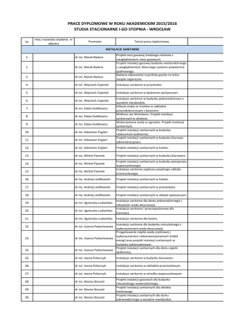PRACE DYPLOMOWE W ROKU AKADEMICKIM 2015/2016 STUDIA STACJONARNE I-GO STOPNIA - WROCŁAW Lp. Imię i nazwisko studenta nr albumu Promotor Temat pracy dyplomowej INSTALACJE SANITARNE Projekt sieci gazowej średniego ciśnienia z uwzględnieniem stacji gazowych. Projekt instalacji gazowej budynku wielorodzinnego z uwzględnieniem zbiorczego systemu powietrznospalinowego. Badania odpowiedzi czujników gazów na lotne związki organiczne. 1. dr inż. Marek Badura 2. dr inż. Marek Badura 3. dr inż. Marek Badura 4. dr inż. Wojciech Cepiński Instalacje sanitarne w przychodni. 5. dr inż. Wojciech Cepiński Instalacje sanitarne w dyskoncie spożywczym. 6. dr inż. Wojciech Cepiński 7. dr inż. Edyta Dudkiewicz 8. dr inż. Edyta Dudkiewicz 9. dr inż. Edyta Dudkiewicz 10. dr inż. Sebastian Englart 11. dr inż. Sebastian Englart 12. dr inż. Sebastian Englart Projekt instalacji sanitarnych w hotelu. 13. dr inż. Michał Fijewski Projekt instalacji sanitarnych w budynku biurowym. 14. dr inż. Michał Fijewski 15. dr inż. Michał Fijewski 16. dr inż. Andrzej Jedlikowski Projekt instalacji sanitarnych w hotelu. 17. dr inż. Andrzej Jedlikowski Projekt instalacji sanitarnych w przedszkolu. 18. dr inż. Andrzej Jedlikowski Projekt instalacji sanitarnych w sklepie spożywczym. 19. dr inż. Agnieszka Ludwińska 20. dr inż. Agnieszka Ludwińska 21. dr inż. Agnieszka Ludwińska 22. dr inż. Joanna Paduchowska 23. dr inż. Joanna Paduchowska 24. dr inż. Joanna Paduchowska 25. dr inż. Iwona Polarczyk Instalacje sanitarne w budynku biurowym. 26. dr inż. Iwona Polarczyk Instalacje sanitarne w zakładzie przemysłowym. 27. dr inż. Iwona Polarczyk Instalacje sanitarne w ośrodku wypoczynkowym. 28. dr inż. Maciej Skrzycki 29. dr inż. Maciej Skrzycki 30. dr inż. Maciej Skrzycki Instalacje sanitarne w budynku jednorodzinnym o wysokim standardzie. Odzysk ciepła ze ścieków w zakładzie przyrodoleczniczym z basenem. Wellness we Wrocławiu. Projekt instalacji sanitarnych w obiekcie. Wykorzystanie wody w ogrodzie. Projekt instalacji sanitarnych. Projekt instalacji sanitarnych w budynku użyteczności publicznej. Projekt instalacji sanitarnych w budynku biurowoadministracyjnym. Projekt instalacji sanitarnych w budynku pensjonatu wypoczynkowego. Instalacje sanitarne zaplecza socjalnego zakładu przemysłowego. Instalacje sanitarne dla domu jednorodzinnego z odzyskiem wody deszczowej. Instalacje sanitarne i przeciwpożarowe dla biurowca. Instalacje sanitarne dla hotelu. Instalacje sanitarne dla budynku mieszkalnego z wykorzystaniem wody deszczowej. Przygotowanie ciepłej wody użytkowej z wykorzystaniem niekonwencjonalnych źródeł energii oraz projekt instalacji sanitarnych w budynku jednorodzinnym. Projekt instalacji sanitarnych dla domu opieki społecznej. Projekt instalacji gazowych dla budynku mieszkalnego wielorodzinnego. Projekt instalacji sanitarnych dla obiektu hotelowego. Projekt instalacji sanitarnych dla domu jednorodzinnego o wysokim standardzie. 31. dr inż. Alina Żabnieńska-Góra Instalacje sanitarne w hotelu. 32. dr inż. Alina Żabnieńska-Góra Instalacje sanitarne w budynku biurowym. 33. dr inż. Alina Żabnieńska-Góra Instalacje sanitarne w szkole. OGRZEWNICTWO I CIEPŁOWNICTWO 34. dr inż. Grzegorz Bartnicki Pompa ciepła w domu jednorodzinnym. 35. dr inż. Grzegorz Bartnicki 36. prof. dr hab. inż. Jan Danielewicz 37. prof. dr hab. inż. Jan Danielewicz 38. dr inż. Natalia Fidorów 39. dr inż. Natalia Fidorów 40. dr inż. Natalia Fidorów 41. dr inż. Piotr Jadwiszczak Ogrzewanie ścienne w budynku jednorodzinnym. 42. dr inż. Piotr Jadwiszczak Ogrzewanie murawy boiska piłkarskiego. 43. dr inż. Piotr Jadwiszczak Ogrzewanie podłogowe w domu jednorodzinnym. 44. dr inż. Piotr Kęskiewicz 45. dr inż. Piotr Kęskiewicz 46. dr inż. Piotr Kęskiewicz 47. dr inż. Marcin Klimczak 48. dr inż. Marcin Klimczak 49. dr inż. Marcin Klimczak 50. dr inż. Piotr Kowalski 51. dr inż. Piotr Kowalski 52. dr inż. Piotr Kowalski System grzewczy wspomagany energią słoneczną. 53. dr inż. Marta Laska System grzewczy dla budynku modernizowanego. 54. dr inż. Marta Laska System grzewczy dla nowo budowanego obiektu. 55. dr inż. Marta Laska Badania komfortu cieplnego w salach wykładowych. 56. dr inż. Maciej Miniewicz 57. dr inż. Maciej Miniewicz 58. dr inż. Bogdan Nowak 59. dr inż. Bogdan Nowak 60. dr hab. inż. Ara Sayegh 61. dr hab. inż. Ara Sayegh 62. dr inż. Paweł Szałański Ogrzewanie budynku pompą ciepła. 63. dr inż. Paweł Szałański Ogrzewanie budynku niskotemperaturowym źródłem ciepła. Kotłownia gazowa jako źródło ciepła dla budynków wielorodzinnych. Ogrzewania budynku pompą ciepła typu powietrzewoda i grunt-woda. Oszacowanie kosztów eksploatacji. Instalacja grzewcza budynku jednorodzinnego z zastosowaniem kolektorów słonecznych. Źródło ciepła dla budynku dwulokalowego oparte o pompę ciepła. Analiza energetyczno-ekonomiczna powietrznej i gruntowej grzewczej pompy ciepła. Ogrzewanie niskotemperaturowe w budynku wielorodzinnym. Metody uwzględniania mostków cieplnych w budynkach. Wpływ współczynnika kształtu budynku na projektowe obciążenie cieplne. Wybór parametrów pracy systemu centralnego ogrzewania budynku. Projekt instalacji centralnego ogrzewania dla wielorodzinnego budynku niskoenergetycznego we Wrocławiu. System zasilania w ciepło modernizowanej kamienicy usytuowanej we Wrocławiu. Projekt modernizacji instalacji centralnego ogrzewania dla budynku wielorodzinnego usytuowanego w Wrocławiu. Ogrzewanie niskoenergetycznego domu jednorodzinnego. System grzewczy i wentylacyjny dla niskoenergetycznego budynku jednorodzinnego. Ogrzewanie niskotemperaturowe budynku mieszkalnego. Ogrzewanie budynku mieszkalnego za pomocą pompy ciepła. Instalacja centralnego ogrzewania dla domu jednorodzinnego w Oławie. Instalacja centralnego ogrzewania dla budynku wielorodzinnego w Legnicy. Wykorzystanie odnawialnych źródeł energii połączonych do