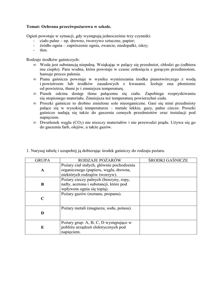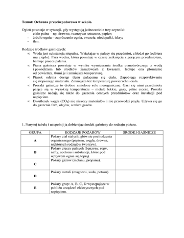 Temat: Ochrona przeciwpoŜarowa w szkole. Ogień powstaje w sytuacji, gdy występują jednocześnie trzy czynniki: - ciało palne – np. drewno, tworzywo sztuczne, papier; - źródło ognia – zaprószenie ognia, zwarcie, niedopałki, iskry; - tlen. Rodzaje środków gaśniczych: • Woda jest substancją niepalną. Wsiąkając w palący się przedmiot, chłodzi go (odbiera mu ciepło). Para wodna, która powstaje w czasie zetknięcia z gorącym przedmiotem, hamuje proces palenia. • Piana gaśnicza powstaje w wyniku wymieszania środka pianotwórczego z wodą i powietrzem lub środków zasadowych z kwasami. Izoluje ona płomienie od powietrza, tłumi je i zmniejsza temperaturę. • Piasek odcina dostęp tlenu palącemu się ciału. Zapobiega rozpryskiwaniu się stopionego materiału. Zmniejsza teŜ temperaturę powierzchni ciała. • Proszki gaśnicze to drobno zmielone sole nieorganiczne. Gasi się nimi przedmioty palące się w wysokiej temperaturze – metale lekkie, gazy, palne ciecze. Proszki gaśnicze nadają się takŜe do gaszenia cennych przedmiotów oraz instalacji pod napięciem. • Dwutlenek węgla (CO2) nie niszczy materiałów i nie przewodzi prądu. UŜywa się go do gaszenia farb, olejów, a takŜe gazów. 1. Narysuj tabelę i uzupełnij ją dobierając środek gaśniczy do rodzaju poŜaru. GRUPA A B RODZAJE POśARÓW PoŜary ciał stałych, głównie pochodzenia organicznego (papieru, węgla, drewna, niektórych rodzajów tworzyw). PoŜary cieczy palnych (benzyny, ropy, nafty, acetonu i substancji, które pod wpływem ognia się topią). PoŜary gazów (metanu, propanu). C PoŜary metali (magnezu, sodu, potasu). D E PoŜary grup: A, B, C, D występujące w pobliŜu urządzeń elektrycznych pod napięciem. ŚRODKI GAŚNICZE 2. Korzystając z róŜnych źródeł wiedzy, dopisz obok kaŜdego przerysowanego do zeszytu oznaczenia odpowiednią nazwę. 3. Drogi ewakuacyjne są oznaczone specjalnymi znakami. Na podstawie przygotowanej strony intranetowej „ZNAKI EWAKUACYJNE” uzupełnij poniŜszą tabelę. ZNAK OPIS ZNAK OPIS