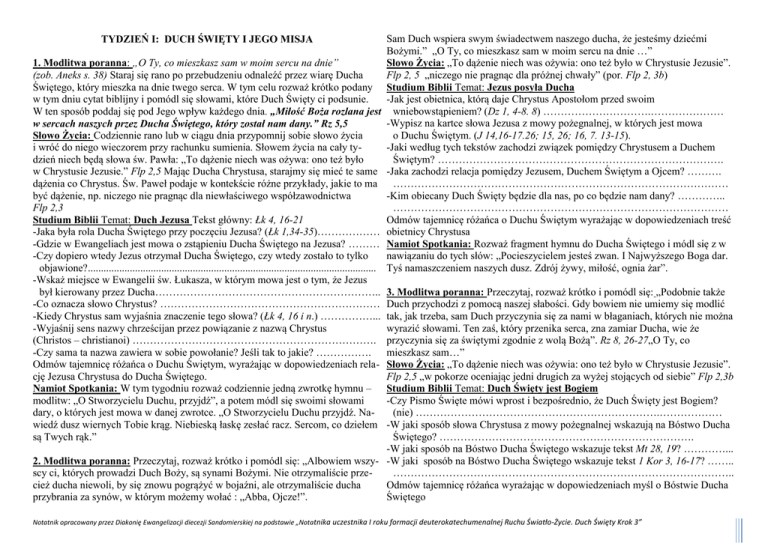 TYDZIEŃ I: DUCH ŚWIĘTY I JEGO MISJA 1. Modlitwa poranna: „O Ty, co mieszkasz sam w moim sercu na dnie” (zob. Aneks s. 38) Staraj się rano po przebudzeniu odnaleźć przez wiarę Ducha Świętego, który mieszka na dnie twego serca. W tym celu rozważ krótko podany w tym dniu cytat biblijny i pomódl się słowami, które Duch Święty ci podsunie. W ten sposób poddaj się pod Jego wpływ każdego dnia. „Miłość Boża rozlana jest w sercach naszych przez Ducha Świętego, który został nam dany.” Rz 5,5 Słowo Życia: Codziennie rano lub w ciągu dnia przypomnij sobie słowo życia i wróć do niego wieczorem przy rachunku sumienia. Słowem życia na cały tydzień niech będą słowa św. Pawła: „To dążenie niech was ożywa: ono też było w Chrystusie Jezusie.” Flp 2,5 Mając Ducha Chrystusa, starajmy się mieć te same dążenia co Chrystus. Św. Paweł podaje w kontekście różne przykłady, jakie to ma być dążenie, np. niczego nie pragnąc dla niewłaściwego współzawodnictwa Flp 2,3 Studium Biblii Temat: Duch Jezusa Tekst główny: Łk 4, 16-21 -Jaka była rola Ducha Świętego przy poczęciu Jezusa? (Łk 1,34-35)……………… -Gdzie w Ewangeliach jest mowa o zstąpieniu Ducha Świętego na Jezusa? ……… -Czy dopiero wtedy Jezus otrzymał Ducha Świętego, czy wtedy zostało to tylko objawione?.............................................................................................................. -Wskaż miejsce w Ewangelii św. Łukasza, w którym mowa jest o tym, że Jezus był kierowany przez Ducha……………………………………………………….. -Co oznacza słowo Chrystus? ……………………………………………………… -Kiedy Chrystus sam wyjaśnia znaczenie tego słowa? (Łk 4, 16 i n.) ……………... -Wyjaśnij sens nazwy chrześcijan przez powiązanie z nazwą Chrystus (Christos – christianoi) ……………………………………………………………. -Czy sama ta nazwa zawiera w sobie powołanie? Jeśli tak to jakie? ……………. Odmów tajemnicę różańca o Duchu Świętym, wyrażając w dopowiedzeniach relację Jezusa Chrystusa do Ducha Świętego. Namiot Spotkania: W tym tygodniu rozważ codziennie jedną zwrotkę hymnu – modlitw: „O Stworzycielu Duchu, przyjdź”, a potem módl się swoimi słowami dary, o których jest mowa w danej zwrotce. „O Stworzycielu Duchu przyjdź. Nawiedź dusz wiernych Tobie krąg. Niebieską łaskę zesłać racz. Sercom, co dziełem są Twych rąk.” Sam Duch wspiera swym świadectwem naszego ducha, że jesteśmy dziećmi Bożymi.” „O Ty, co mieszkasz sam w moim sercu na dnie …” Słowo Życia: „To dążenie niech was ożywia: ono też było w Chrystusie Jezusie”. Flp 2, 5 „niczego nie pragnąc dla próżnej chwały” (por. Flp 2, 3b) Studium Biblii Temat: Jezus posyła Ducha -Jak jest obietnica, którą daje Chrystus Apostołom przed swoim wniebowstąpieniem? (Dz 1, 4-8. 8) ………………………….………………… -Wypisz na kartce słowa Jezusa z mowy pożegnalnej, w których jest mowa o Duchu Świętym. (J 14,16-17.26; 15, 26; 16, 7. 13-15). -Jaki według tych tekstów zachodzi związek pomiędzy Chrystusem a Duchem Świętym? ………………………………………………………………………. -Jaka zachodzi relacja pomiędzy Jezusem, Duchem Świętym a Ojcem? ………. …………………………………………………………………………………… -Kim obiecany Duch Święty będzie dla nas, po co będzie nam dany? ………….. …………………………………………………………………………………… Odmów tajemnicę różańca o Duchu Świętym wyrażając w dopowiedzeniach treść obietnicy Chrystusa Namiot Spotkania: Rozważ fragment hymnu do Ducha Świętego i módl się z w nawiązaniu do tych słów: „Pocieszycielem jesteś zwan. I Najwyższego Boga dar. Tyś namaszczeniem naszych dusz. Zdrój żywy, miłość, ognia żar”. 3. Modlitwa poranna: Przeczytaj, rozważ krótko i pomódl się: „Podobnie także Duch przychodzi z pomocą naszej słabości. Gdy bowiem nie umiemy się modlić tak, jak trzeba, sam Duch przyczynia się za nami w błaganiach, których nie można wyrazić słowami. Ten zaś, który przenika serca, zna zamiar Ducha, wie że przyczynia się za świętymi zgodnie z wolą Bożą”. Rz 8, 26-27„O Ty, co mieszkasz sam…” Słowo Życia: „To dążenie niech was ożywia: ono też było w Chrystusie Jezusie”. Flp 2,5 „w pokorze oceniając jedni drugich za wyżej stojących od siebie” Flp 2,3b Studium Biblii Temat: Duch Święty jest Bogiem -Czy Pismo Święte mówi wprost i bezpośrednio, że Duch Święty jest Bogiem? (nie) …………………………………………………………….……………… -W jaki sposób słowa Chrystusa z mowy pożegnalnej wskazują na Bóstwo Ducha Świętego? ………………………………………………………………. -W jaki sposób na Bóstwo Ducha Świętego wskazuje tekst Mt 28, 19? …………... 2. Modlitwa poranna: Przeczytaj, rozważ krótko i pomódl się: „Albowiem wszy- -W jaki sposób na Bóstwo Ducha Świętego wskazuje tekst 1 Kor 3, 16-17? …….. scy ci, których prowadzi Duch Boży, są synami Bożymi. Nie otrzymaliście prze…………………………………………………………………………………….. cież ducha niewoli, by się znowu pogrążyć w bojaźni, ale otrzymaliście ducha Odmów tajemnicę różańca wyrażając w dopowiedzeniach myśl o Bóstwie Ducha przybrania za synów, w którym możemy wołać : „Abba, Ojcze!”. Świętego Notatnik opracowany przez Diakonię Ewangelizacji diecezji Sandomierskiej na podstawie „Notatnika uczestnika I roku formacji deuterokatechumenalnej Ruchu Światło-Życie. Duch Święty Krok 3” Namiot Spotkania: Rozważ poniższy fragment hymnu do Ducha Świętego i mó