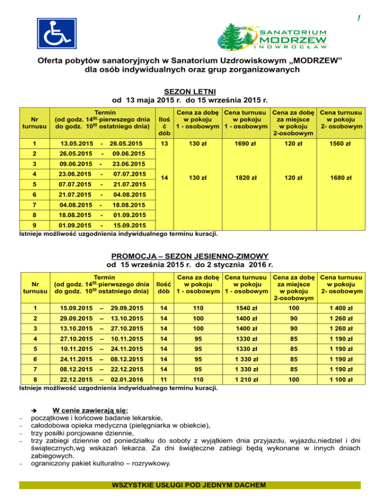 ! Oferta pobytów sanatoryjnych w Sanatorium Uzdrowiskowym „MODRZEW” dla osób indywidualnych oraz grup zorganizowanych SEZON LETNI od 13 maja 2015 r. do 15 września 2015 r. Nr turnusu Termin (od godz. 1400 pierwszego dnia do godz. 1000 ostatniego dnia) 1 13.05.2015 - 26.05.2015 2 26.05.2015 - 09.06.2015 3 09.06.2015 - 23.06.2015 4 23.06.2015 - 07.07.2015 5 07.07.2015 - 21.07.2015 6 21.07.2015 - 04.08.2015 7 04.08.2015 - 18.08.2015 8 18.08.2015 - 01.09.2015 Cena za dobę Cena turnusu Cena za dobę Cena turnusu Iloś w pokoju w pokoju za miejsce w pokoju ć 1 - osobowym 1 - osobowym w pokoju 2- osobowym dób 2-osobowym 13 130 zł 1690 zł 120 zł 1560 zł 14 130 zł 1820 zł 120 zł 1680 zł 9 01.09.2015 15.09.2015 Istnieje możliwość uzgodnienia indywidualnego terminu kuracji. PROMOCJA – SEZON JESIENNO-ZIMOWY od 15 września 2015 r. do 2 stycznia 2016 r. Nr turnusu Termin (od godz. 1400 pierwszego dnia do godz. 1000 ostatniego dnia) Cena za dobę Cena turnusu Cena za dobę Cena turnusu Ilość w pokoju w pokoju za miejsce w pokoju dób 1 - osobowym 1 - osobowym w pokoju 2- osobowym 2-osobowym 1 15.09.2015 – 29.09.2015 14 110 1540 zł 100 1 400 zł 2 29.09.2015 – 13.10.2015 14 100 1400 zł 90 1 260 zł 3 13.10.2015 – 27.10.2015 14 100 1400 zł 90 1 260 zł 4 27.10.2015 – 10.11.2015 14 95 1330 zł 85 1 190 zł 5 10.11.2015 – 24.11.2015 14 95 1330 zł 85 1 190 zł 6 24.11.2015 – 08.12.2015 14 95 1 330 zł 85 1 190 zł 7 08.12.2015 – 22.12.2015 14 95 1 330 zł 85 1 190 zł 1 210 zł 100 1 100 zł 8 22.12.2015 – 02.01.2016 11 110 Istnieje możliwość uzgodnienia indywidualnego terminu kuracji. W cenie zawierają się: początkowe i końcowe badanie lekarskie, całodobowa opieka medyczna (pielęgniarka w obiekcie), trzy posiłki porcjowane dziennie, trzy zabiegi dziennie od poniedziałku do soboty z wyjątkiem dnia przyjazdu, wyjazdu,niedziel i dni świątecznych,wg wskazań lekarza. Za dni świąteczne zabiegi będą wykonane w innych dniach zabiegowych. ograniczony pakiet kulturalno – rozrywkowy. − − − − − WSZYSTKIE USŁUGI POD JEDNYM DACHEM BEZ POTRZEBY WYCHODZENIA NA ZEWNĄTRZ! W okresie SEZONU LETNIEGO istnieje możliwość uzyskania 10% rabatu, który przysługuje kuracjuszom korzystającym po raz drugi i kolejny z pełnej kuracji trwającej co najmniej 14 osobodni w okresie poprzednich SEZONÓW LETNICH. W okresie PROMOCJI – SEZONU JESIENNO-ZIMOWEGO żadne zniżki i rabaty nie przysługują. WARUNKI REZERWACJI: Rezerwacja i warunki płatności: Zawarcie umowy o świadczenie usług na pobyt sanatoryjny pełnopłatny następuje po dokonaniu rezerwacji i jej potwierdzeniu poprzez terminową wpłatę zaliczki w wysokości 300 złotych od osoby w terminie 14 dni od dnia dokonania rezerwacji. Wpłaty zaliczki należy dokonać przelewem bankowym na konto: Bank Polska Kasa Opieki S.A. 55 1240 6003 1111 0010 4664 1125, przekazem pocztowym lub bezpośrednio w kasie Sanatorium. Pozostałą kwotę należy uiścić najpóźniej w dniu przyjazdu w recepcji. Brak wpłaty upoważnia Sanatorium do odmowy przyjęcia kuracjusza. Warunki rezygnacji: Kuracjusz może odwołać rezerwację, składając oświadczenie w formie pisemnej. W przypadku rezygnacji zgłoszonej na więcej niż 30 dni przed planowanym rozpoczęciem pobytu Sanatorium zwraca całą zaliczkę, na mniej niż 30 dni przed rozpoczęciem pobytu, wpłacona zaliczka ulega pomniejszeniu o 50%, a w przypadku rezygnacji na mniej niż 14 dni wpłacona zaliczka zostaje zatrzymana przez Sanatorium. W przypadku rezygnacji w trakcie pobytu kuracjuszowi nie przysługuje zwrot za niewykorzystane świadczenia. Wyjątek stanowi zdarzenie losowe (np.: zgon członka rodziny, wypadek kuracjusza udokumentowany pisemnie). Ogólne zasady: - pobyt rozpoczyna się o godz. 1400 w dniu przyjazdu i kończy o godz. 1000 w dniu wyjazdu - ewentualny dodatkowy, płatny nocleg przed planowanym przyjazdem lub po jego zakończeniu należy uzgodnić z recepcją - każde badanie lekarskie, ponad dwa przewidziane w pakiecie jest dodatkowo płatne - wizyty i badania specjalistyczne nie są objęte pakietem - nie przyjmujemy zwierząt domowych - należy wziąć z domu własne ręczniki , nie najnowsze (na zabiegi) bo niektóre zabiegi są brudzące (borowina, parafina, solanka) Dodatkowe atrakcje i możliwości: - ograniczony program kulturalno – rekreacyjny, wieczorki taneczne - bezpłatny dostęp do internetu - kaplica rzymsko - katolicka, biblioteka, kawiarnia, sklep spożywczy i przemysłowy - bezpłatny, niestrzeżony, oświetlony i nieogrodzony parking dla samochodów oraz możliwość wykupienia miejsca garażowego - możliwość wykupienia dodatkowego noclegu - możliwość wykupienia dodatkowych zabiegów - możliwość dokonania płatności kartą - możliwość przywiezienia ze sobą kijków do nordic walking, roweru , wózka inwalidzkiego lub chodzika jeżeli są potrzebne. UWAGA: KURACJUSZE POWINNI Z SOBĄ PRZYWIEŹĆ ZAŚWIADCZENIE LEKARSKIE O BRAKU PRZECIWWSKAZAŃ DO LECZENIA UZDROWISKOWEGO W UZDROWISKU INOWROCŁAW ORAZ LEKI NA CAŁY OKRES POBYTU, PONIEWAŻ RECEPTY NA STALE PRZYJMOWANE LEKI NIE BĘDĄ PRZEPISYWANE. WYJĄTEK STANOWIĄ NAGŁE NIEPRZEWIDZIANE ZACHOROWANIA. REZERWACJA MIEJSC: SANATORIUM UZDROWISKOWE „MODRZEW” ul. Wierzbińskiego 50 a 88-100 Inowrocław tel. 52 357 30 84 do 86 e-mail: [email protected] e-mail: [email protected]