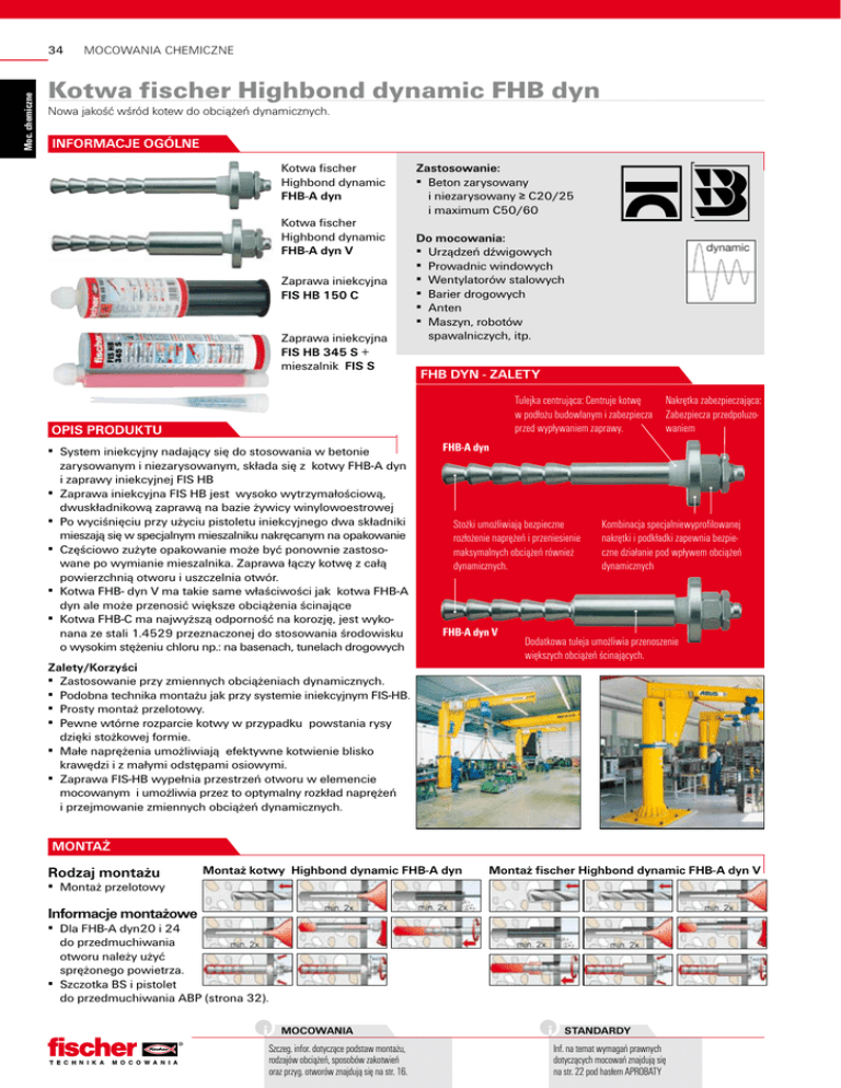 Moc. chemiczne 34 MOCOWANIA CHEMICZNE Kotwa fischer Highbond dynamic FHB dyn Nowa jakość wśród kotew do obciążeń dynamicznych. Informacje ogólne Kotwa fischer Highbond dynamic FHB-A dyn Kotwa fischer Highbond dynamic FHB-A dyn V Zaprawa iniekcyjna FIS HB 150 C Zaprawa iniekcyjna FIS HB 345 S + mieszalnik FIS S Zastosowanie: ▪ Beton zarysowany i niezarysowany ≥ C20/25 i maximum C50/60 Do mocowania: ▪ Urządzeń dźwigowych ▪ Prowadnic windowych ▪ Wentylatorów stalowych ▪ Barier drogowych ▪ Anten ▪ Maszyn, robotów spawalniczych, itp. FHB DYN - ZALETY Tulejka centrująca: Centruje kotwę w podłożu budowlanym i zabezpiecza przed wypływaniem zaprawy. Opis produktu ▪ System iniekcyjny nadający się do stosowania w betonie zarysowanym i niezarysowanym, składa się z kotwy FHB-A dyn i zaprawy iniekcyjnej FIS HB ▪ Zaprawa iniekcyjna FIS HB jest wysoko wytrzymałościową, dwuskładnikową zaprawą na bazie żywicy winylowoestrowej ▪ Po wyciśnięciu przy użyciu pistoletu iniekcyjnego dwa składniki mieszają się w specjalnym mieszalniku nakręcanym na opakowanie ▪ Częściowo zużyte opakowanie może być ponownie zastoso wane po wymianie mieszalnika. Zaprawa łączy kotwę z całą powierzchnią otworu i uszczelnia otwór. ▪ Kotwa FHB- dyn V ma takie same właściwości jak kotwa FHB-A dyn ale może przenosić większe obciążenia ścinające ▪ Kotwa FHB-C ma najwyższą odporność na korozję, jest wykonana ze stali 1.4529 przeznaczonej do stosowania środowisku o wysokim stężeniu chloru np.: na basenach, tunelach drogowych Nakrętka zabezpieczająca: Zabezpiecza przedpoluzowaniem FHB-A dyn Stożki umożliwiają bezpieczne rozłożenie naprężeń i przeniesienie maksymalnych obciążeń również dynamicznych. FHB-A dyn V Zalety/Korzyści ▪ Zastosowanie przy zmiennych obciążeniach dynamicznych. ▪ Podobna technika montażu jak przy systemie iniekcyjnym FIS-HB. ▪ Prosty montaż przelotowy. ▪ Pewne wtórne rozparcie kotwy w przypadku powstania rysy dzięki stożkowej formie. ▪ Małe naprężenia umożliwiają efektywne kotwienie blisko krawędzi i z małymi odstępami osiowymi. ▪ Zaprawa FIS-HB wypełnia przestrzeń otworu w elemencie mocowanym i umożliwia przez to optymalny rozkład naprężeń i przejmowanie zmiennych obciążeń dynamicznych. Kombinacja specjalniewyprofilowanej nakrętki i podkładki zapewnia bezpieczne działanie pod wpływem obciążeń dynamicznych Dodatkowa tuleja umożliwia przenoszenie większych obciążeń ścinających. MONTAŻ Rodzaj montażu Montaż kotwy Highbond dynamic FHB-A dyn Montaż fischer Highbond dynamic FHB-A dyn V ▪ Montaż przelotowy Informacje montażowe ▪ Dla FHB-A dyn20 i 24 do przedmuchiwania otworu należy użyć sprężonego powietrza. ▪ Szczotka BS i pistolet do przedmuchiwania ABP (strona 32). MOCOWANIA T E C H N I K A M O C O W A N I A Szczeg. infor. dotyczące podstaw montażu, rodzajów obciążeń, sposobów zakotwień oraz przyg. otworów znajdują się na str. 16. STANDARDY Inf. na temat wymagań prawnych dotyczących mocowań znajdują się na str. 22 pod hasłem APROBATY Moc. chemiczne 35 Dane techniczne Kotwa fischer Highbond dynamic FHB-A dyn Typ Art.-Nr PZ Aprobata Wiertło-Ø DIBt 92018 92019 92020 92036 92037 92038 FHB-A dyn 12 x 100/25 FHB-A dyn 12 x 100/50 FHB-A dyn 16 x 125/25 FHB-A dyn 16 x 125/50 FHB-A dyn 20 x 170/50 FHB-A dyn 24 x 220/50 3 0 6 7 4 1 Głębokość wiercenia otworu Efek. głęb. kotwienia Min. - max. dług. użytkowa Śred. otw. w elem. mocowanym Rozmiar klucza Ilość w opakowaniu do [mm] [mm] hef [mm] tfix [mm] df [Ø mm] SW ITB szt. ▯▯ ▯▯ ▯▯ ▯▯ ▯▯ ▯▯ 14 14 18 18 24 28 130 155 155 180 225 275 100 100 125 125 170 220 8 - 25 8 - 50 10 - 25 10 - 50 12 - 50 14 - 50 15 15 19 19 25 29 19 19 24 24 30 36 10 10 10 10 10 5 Rozmiar klucza Ilość w opakowaniu Kotwa fischer Highbond dynamic FHB-A dyn V Typ Art.-Nr PZ Aprobata Wiertło-Ø DIBt ITB FHB-A dyn 12 x 100/50 V 92039 8 ▯▯ FHB-A dyn 16 x 125/50 V 92040 4 ▯▯ Głębokość wiercenia otworu Efek. głęb. kotwienia Min. - max. Śred. otw. w elem. dług. użytkowa mocowanym do [mm] hef [mm] tfix [mm] df [Ø mm] SW [mm] szt. 201) 142) 281) 182) 851) 1602) 1001) 1852) 105 8 - 50 21 19 10 130 10 - 50 29 24 10 Rozmiar klucza Ilość w opakowaniu 1) Wiercenie otworu 1 2) Wiercenie otworu 2 Kotwa fischer Highbond dynamic FHB-A dyn C ze stali wysoko odpornej na korozję 1,4529 Typ Art.-Nr PZ Aprobata Wiertło-Ø DIBt 93445 FHB-A dyn 16 x 125/50 C 6 Głębokość wiercenia otworu Efek. głęb. kotwienia Min. - max. Śred. otw. w elem. dług. użytkowa mocowanym do [mm] [mm] hef [mm] tfix [mm] df [Ø mm] SW ITB szt. ▯▯ 18 180 125 10 - 25 19 24 10 Dane techniczne Zaprawa iniekcyjna FIS HB 345 S + mieszalnik FIS S Typ Art.-Nr PZ Aprobata Zaprawa iniekcyjna FIS HB 150 C Zawartość Zawartość Ilość w opakowaniu ITB [ml] [podziałki] szt. ▯▯ ▯▯ 345 145 - 180 70 - 6 6 10 DIBt FIS HB 345 S FIS HB 150 C FIS S 1) 1) 33211 77529 61223 5 5 1 1) 2 mieszalniki na 1 opakowanie. ZUŻYCIE ZAPRAWY Zużycie zaprawy Typ FHB-A dyn 12 x 100 / 25 FHB-A dyn 12 x 100 / 50 FHB-A dyn 16 x 125 / 25 FHB-A dyn 16 x 125 / 50 FHB-A dyn 20 x 170 / 50 FHB-A dyn 24 x 220 / 50 FHB-A dyn 12 x 100 / 50 V FHB-A dyn 16 x 125 / 50 V Ilość zaprawy wg podziałek na opakowaniu 7 8 9 10 23 38 12 20 Ilość zakotwień z opakowania FIS HB 345 S *) 24 21 18 17 7 4 14 8 Czas wiązania patrz str. 31 *) max ilość z jednym mieszalnikiem Bezp. Pożarowe Dynamika Informacje dotyczące ochrony prze ciwpożarowej znajdują się na str. 19. Informacje dotyczące obciążeń dynamicznych znajdują się na str. 21. KOROZJA Informacje dotyczące zabezpieczeń antykorozyjnych znajdują się na str. 20. T E C H N I K A M O C O W A N I A Moc. chemiczne 36 MOCOWANIA CHEMICZNE Kotwa fischer Highbond dynamic FHB dyn Obciążenia Średnie obciążenia niszczące i obciążenia zalecane dla kotwy wklejanej fischer Highbond
