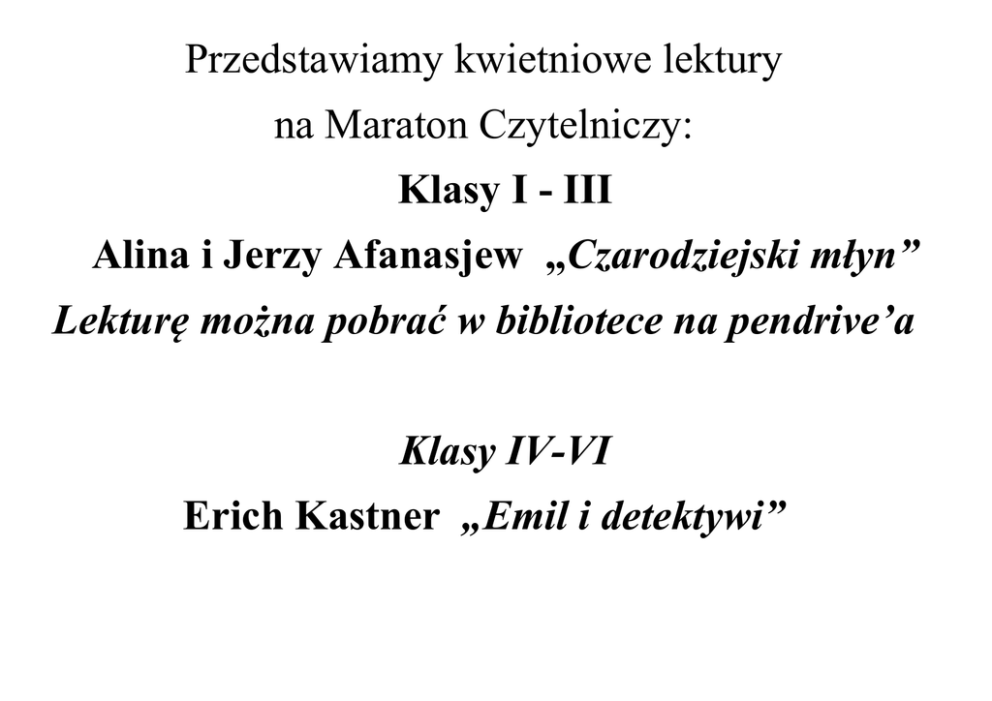 Przedstawiamy kwietniowe lektury na Maraton Czytelniczy: Klasy I - III Alina i Jerzy Afanasjew „Czarodziejski młyn” Lekturę można pobrać w bibliotece na pendrive’a Klasy IV-VI Erich Kastner „Emil i detektywi”