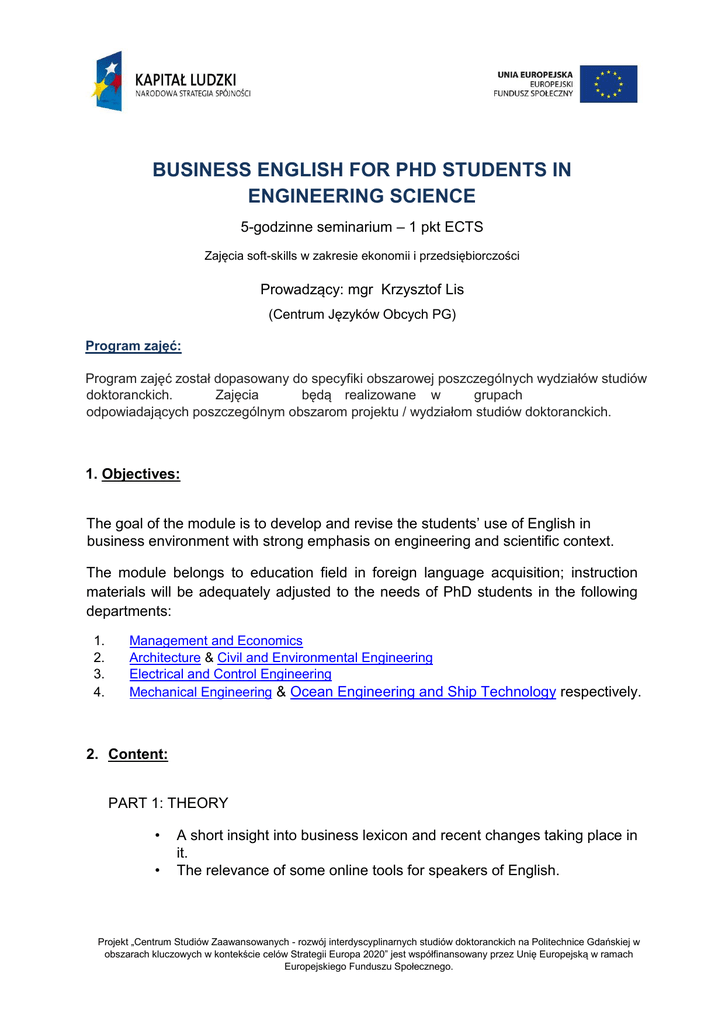 BUSINESS ENGLISH FOR PHD STUDENTS IN ENGINEERING SCIENCE 5-godzinne seminarium – 1 pkt ECTS Zajęcia soft-skills w zakresie ekonomii i przedsiębiorczości Prowadzący: mgr Krzysztof Lis (Centrum Języków Obcych PG) Program zajęć: Program zajęć został dopasowany do specyfiki obszarowej poszczególnych wydziałów studiów doktoranckich. Zajęcia będą realizowane w grupach odpowiadających poszczególnym obszarom projektu / wydziałom studiów doktoranckich. 1. Objectives: The goal of the module is to develop and revise the students’ use of English in business environment with strong emphasis on engineering and scientific context. The module belongs to education field in foreign language acquisition; instruction materials will be adequately adjusted to the needs of PhD students in the following departments: 1. 2. 3. 4. Management and Economics Architecture & Civil and Environmental Engineering Electrical and Control Engineering Mechanical Engineering & Ocean Engineering and Ship Technology respectively. 2. Content: PART 1: THEORY • • A short insight into business lexicon and recent changes taking place in it. The relevance of some online tools for speakers of English. Projekt „Centrum Studiów Zaawansowanych - rozwój interdyscyplinarnych studiów doktoranckich na Politechnice Gdańskiej w obszarach kluczowych w kontekście celów Strategii Europa 2020” jest współfinansowany przez Unię Europejską w ramach Europejskiego Funduszu Społecznego. PART 2: SEMINAR • • • • • • Intensive listening training. Team work management. Solving a problem. Intensive reading. Discussion / Debate. Business writing. 3. Skills: • • • Four language skills shall be practiced / listening, reading, speaking & writing / alongside with note – taking and presenting. Analytical & synthesizing Critical 4. Prerequisites: Completion of English course at M.Sc level or equivalent. 5. Module literature and other teaching material: • • • • Oxford Business English Dictionary For Learners Of English, Oxford University Press 2015 J.Allison, R.Appleby, E.de Chazal:The Business 2.0 C1 Advanced, Macmillan 2013, selected pages. M.Hewings, C.Thaine: Cambridge Academic English, An integrated skills course for EAP C1 Advanced, Cambridge University Press 2013, selected pages. B.Mascull: Business Vocabulary in Use Advanced, Cambridge University Press, 2007, selected pages. 6. Suggested continued reading: Projekt „Centrum Studiów Zaawansowanych - rozwój interdyscyplinarnych studiów doktoranckich na Politechnice Gdańskiej w obszarach kluczowych w kontekście celów Strategii Europa 2020” jest współfinansowany przez Unię Europejską w ramach Europejskiego Funduszu Społecznego. The Ivey Business Business Journals: Journal | BusinessNews:http://www.bizjournals.com/ Improving the Practice of Management: http://iveybusinessjournal.com/ Business Journal Daily | Local business news: http://businessjournaldaily.com/ Business English Magazine; Język Angielski Politics, Economics, Biznesowy, dwumiesięcznik, Colourful Media: http://www.businessenglish.com.pl/ The Economist - World News, Business ... http://www.economist.com/ Termin i miejsce zajęć: Zajęcia będą prowadzone z podziałem na cztery grupy (obszary projektu / wydziały studiów doktoranckich). Grupa – obszar w projekcie – wydział Grupa I. „Mechatronika” WM+WOiO (bez IMP PAN) Grupa II. „Budownictwo, Architektura i Inżynieria” WILiŚ + WA Grupa IV. „Energetyka, Automatyka i Robotyka” WEiA Grupa III. „Zarządzanie w Przemyśle” WZiE (kierunek „Nauki o Zarządzaniu”) Data Dzień tygodnia 2015-03-12 Cz 16.15-21.00 Gmach B 311 2015-03-13 Pt 16.15-21.00 Gmach B 613 2015-03-19 Cz 9.15-14.00 2015-03-19 Cz 16.15-21.00 Gmach B 311 Godzina Sala OiO 406 Projekt „Centrum Studiów Zaawansowanych - rozwój interdyscyplinarnych studiów doktoranckich na Politechnice Gdańskiej w obszarach kluczowych w kontekście celów Strategii Europa 2020" jest współfinansowany przez Unię Europejską w ramach Europejskiego Funduszu Społecznego.