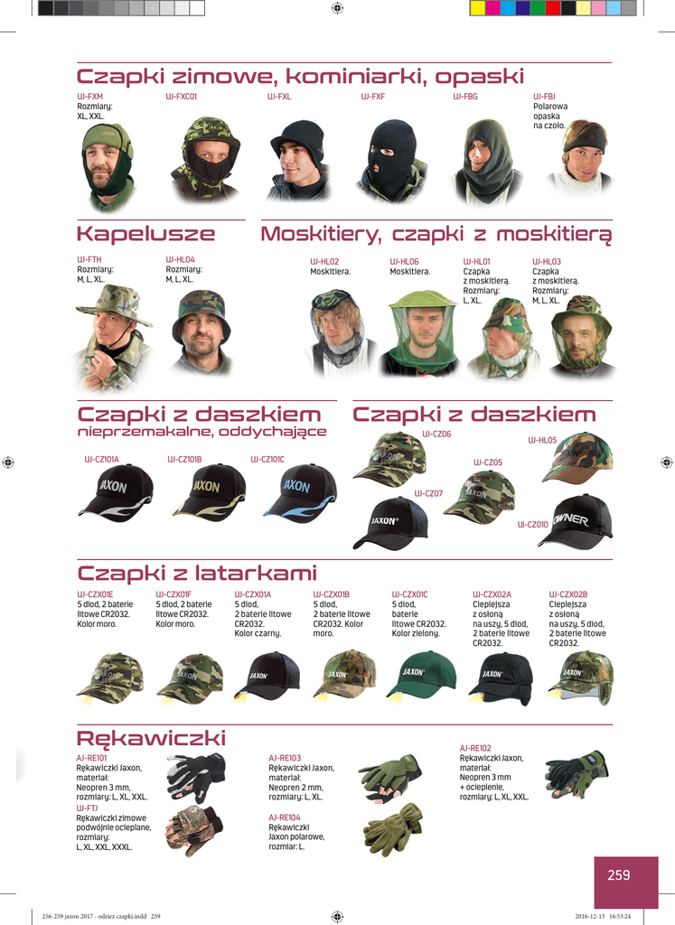 Czapki zimowe, kominiarki, opaski UJ-FXM Rozmiary: XL, XXL. UJ-FXC01 Kapelusze UJ-FTH Rozmiary: M, L, XL. UJ-FXL UJ-FXF UJ-HL02 Moskitiera. Czapki z daszkiem nieprzemakalne, oddychające UJ-CZ101B UJ-FBJ Polarowa opaska na czoło. Moskitiery, czapki z moskitierą UJ-HL04 Rozmiary: M, L, XL. UJ-CZ101A UJ-FBG UJ-HL06 Moskitiera. UJ-HL01 Czapka z moskitierą. Rozmiary: L, XL. UJ-HL03 Czapka z moskitierą. Rozmiary: M, L, XL. Czapki z daszkiem UJ-CZ06 UJ-CZ101C UJ-HL05 UJ-CZ05 UJ-CZ07 UI-CZ010 Czapki z latarkami UJ-CZX01E 5 diod, 2 baterie litowe CR2032. Kolor moro. UJ-CZX01F 5 diod, 2 baterie litowe CR2032. Kolor moro. UJ-CZX01A 5 diod, 2 baterie litowe CR2032. Kolor czarny. UJ-CZX01B 5 diod, 2 baterie litowe CR2032. Kolor moro. Rękawiczki AJ-RE101 Rękawiczki Jaxon, materiał: Neopren 3 mm, rozmiary: L, XL, XXL. UJ-FTJ Rękawiczki zimowe podwójnie ocieplane, rozmiary: L, XL, XXL, XXXL. AJ-RE103 Rękawiczki Jaxon, materiał: Neopren 2 mm, rozmiary: L, XL. UJ-CZX01C 5 diod, baterie litowe CR2032. Kolor zielony. UJ-CZX02A Cieplejsza z osłoną na uszy, 5 diod, 2 baterie litowe CR2032. UJ-CZX02B Cieplejsza z osłoną na uszy, 5 diod, 2 baterie litowe CR2032. AJ-RE102 Rękawiczki Jaxon, materiał: Neopren 3 mm + ocieplenie, rozmiary: L, XL, XXL. AJ-RE104 Rękawiczki Jaxon polarowe, rozmiar: L. 259 256-259 jaxon 2017 - odziez czapki.indd 259 2016-12-13 16:53:24