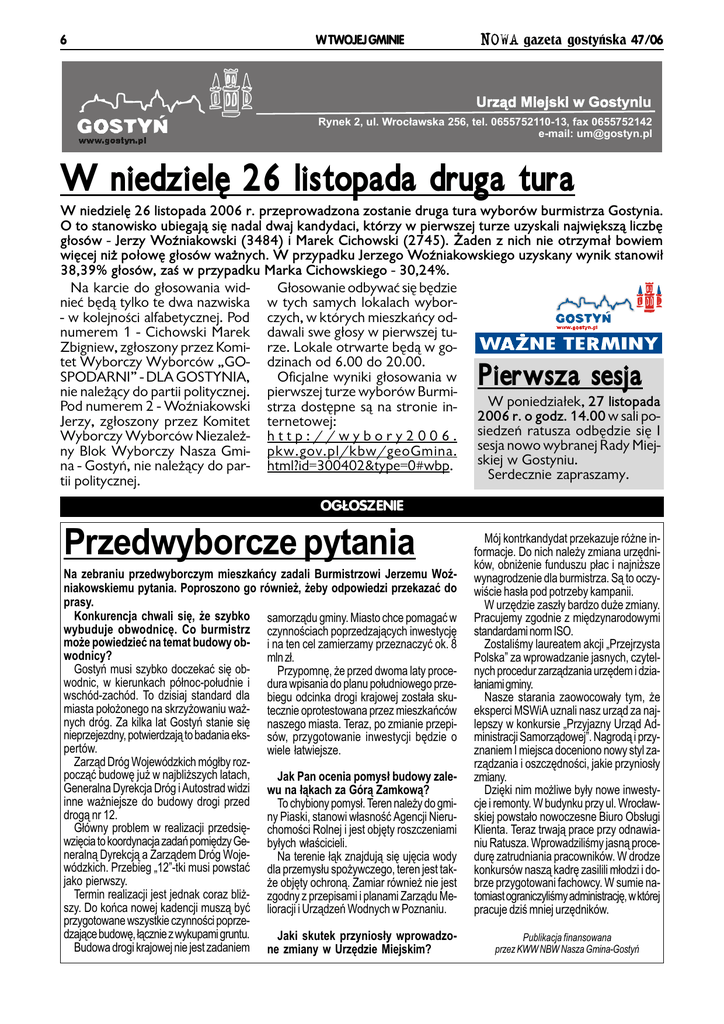6 W TWOJEJ GMINIE NOWA gazeta gostyñska 47/06 Rynek 2, ul. Wroc³awska 256, tel. 0655752110-13, fax 0655752142 e-mail: [email protected] W niedzielê 26 listopada druga tura W niedzielê 26 listopada 2006 r. przeprowadzona zostanie druga tura wyborów burmistrza Gostynia. O to stanowisko ubiegaj¹ siê nadal dwaj kandydaci, którzy w pierwszej turze uzyskali najwiêksz¹ liczbê g³osów - Jerzy Woniakowski (3484) i Marek Cichowski (2745). ¯aden z nich nie otrzyma³ bowiem wiêcej ni¿ po³owê g³osów wa¿nych. W przypadku Jerzego Woniakowskiego uzyskany wynik stanowi³ 38,39% g³osów, za w przypadku Marka Cichowskiego - 30,24%. Na karcie do g³osowania widG³osowanie odbywaæ siê bêdzie nieæ bêd¹ tylko te dwa nazwiska w tych samych lokalach wybor- w kolejnoci alfabetycznej. Pod czych, w których mieszkañcy odnumerem 1 - Cichowski Marek dawali swe g³osy w pierwszej tuZbigniew, zg³oszony przez Komi- rze. Lokale otrwarte bêd¹ w gotet Wyborczy Wyborców GO- dzinach od 6.00 do 20.00. SPODARNI - DLA GOSTYNIA, Oficjalne wyniki g³osowania w nie nale¿¹cy do partii politycznej. pierwszej turze wyborów BurmiW poniedzia³ek, 27 listopada Pod numerem 2 - Woniakowski strza dostêpne s¹ na stronie in2006 r. o godz. 14.00 w sali poJerzy, zg³oszony przez Komitet ternetowej: siedzeñ ratusza odbêdzie siê I Wyborczy Wyborców Niezale¿- h t t p : / / w y b o r y 2 0 0 6 . sesja nowo wybranej Rady Miejny Blok Wyborczy Nasza Gmi- pkw.gov.pl/kbw/geoGmina. skiej w Gostyniu. na - Gostyñ, nie nale¿¹cy do par- html?id=300402&type=0#wbp. Serdecznie zapraszamy. tii politycznej. Pierwsza sesja OG£OSZENIE Przedwyborcze pytania Na zebraniu przedwyborczym mieszkañcy zadali Burmistrzowi Jerzemu Woniakowskiemu pytania. Poproszono go równie¿, ¿eby odpowiedzi przekazaæ do prasy. Konkurencja chwali siê, ¿e szybko samorz¹du gminy. Miasto chce pomagaæ w wybuduje obwodnicê. Co burmistrz czynnociach poprzedzaj¹cych inwestycjê mo¿e powiedzieæ na temat budowy ob- i na ten cel zamierzamy przeznaczyæ ok. 8 wodnicy? mln z³. Gostyñ musi szybko doczekaæ siê obPrzypomnê, ¿e przed dwoma laty procewodnic, w kierunkach pó³noc-po³udnie i dura wpisania do planu po³udniowego przewschód-zachód. To dzisiaj standard dla biegu odcinka drogi krajowej zosta³a skumiasta po³o¿onego na skrzy¿owaniu wa¿- tecznie oprotestowana przez mieszkañców nych dróg. Za kilka lat Gostyñ stanie siê naszego miasta. Teraz, po zmianie przepinieprzejezdny, potwierdzaj¹ to badania eks- sów, przygotowanie inwestycji bêdzie o pertów. wiele ³atwiejsze. Zarz¹d Dróg Wojewódzkich móg³by rozpocz¹æ budowê ju¿ w najbli¿szych latach, Jak Pan ocenia pomys³ budowy zaleGeneralna Dyrekcja Dróg i Autostrad widzi wu na ³¹kach za Gór¹ Zamkow¹? inne wa¿niejsze do budowy drogi przed To chybiony pomys³. Teren nale¿y do gmidrog¹ nr 12. ny Piaski, stanowi w³asnoæ Agencji NieruG³ówny problem w realizacji przedsiê- chomoci Rolnej i jest objêty roszczeniami wziêcia to koordynacja zadañ pomiêdzy Ge- by³ych w³acicieli. neraln¹ Dyrekcj¹ a Zarz¹dem Dróg WojeNa terenie ³¹k znajduj¹ siê ujêcia wody wódzkich. Przebieg 12-tki musi powstaæ dla przemys³u spo¿ywczego, teren jest takjako pierwszy. ¿e objêty ochron¹. Zamiar równie¿ nie jest Termin realizacji jest jednak coraz bli¿- zgodny z przepisami i planami Zarz¹du Meszy. Do koñca nowej kadencji musz¹ byæ lioracji i Urz¹dzeñ Wodnych w Poznaniu. przygotowane wszystkie czynnoci poprzedzaj¹ce budowê, ³¹cznie z wykupami gruntu. Jaki skutek przynios³y wprowadzoBudowa drogi krajowej nie jest zadaniem ne zmiany w Urzêdzie Miejskim? Mój kontrkandydat przekazuje ró¿ne informacje. Do nich nale¿y zmiana urzêdników, obni¿enie funduszu p³ac i najni¿sze wynagrodzenie dla burmistrza. S¹ to oczywicie has³a pod potrzeby kampanii. W urzêdzie zasz³y bardzo du¿e zmiany. Pracujemy zgodnie z miêdzynarodowymi standardami norm ISO. Zostalimy laureatem akcji Przejrzysta Polska za wprowadzanie jasnych, czytelnych procedur zarz¹dzania urzêdem i dzia³aniami gminy. Nasze starania zaowocowa³y tym, ¿e eksperci MSWiA uznali nasz urz¹d za najlepszy w konkursie Przyjazny Urz¹d Administracji Samorz¹dowej. Nagrod¹ i przyznaniem I miejsca doceniono nowy styl zarz¹dzania i oszczêdnoci, jakie przynios³y zmiany. Dziêki nim mo¿liwe by³y nowe inwestycje i remonty. W budynku przy ul. Wroc³awskiej powsta³o nowoczesne Biuro Obs³ugi Klienta. Teraz trwaj¹ prace przy odnawianiu Ratusza. Wprowadzilimy jasn¹ procedurê zatrudniania pracowników. W drodze konkursów nasz¹ kadrê zasilili m³odzi i dobrze przygotowani fachowcy. W sumie natomiast ograniczylimy administracjê, w której pracuje dzi mniej urzêdników. Publikacja finansowana przez KWW NBW Nasza Gmina-Gostyñ