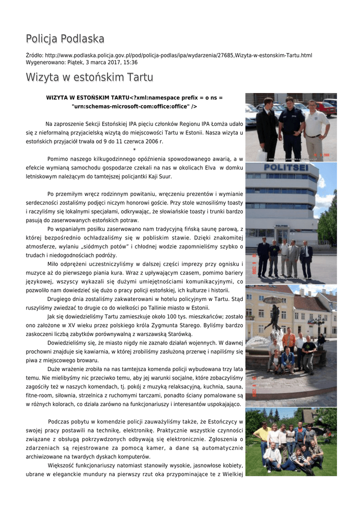 Policja Podlaska Źródło: http://www.podlaska.policja.gov.pl/pod/policja-podlas/ipa/wydarzenia/27685,Wizyta-w-estonskim-Tartu.html Wygenerowano: Piątek, 3 marca 2017, 15:36 Wizyta w estońskim Tartu WIZYTA W ESTOŃSKIM TARTU<?xml:namespace prefix = o ns = "urn:schemas-microsoft-com:office:office" /> Na zaproszenie Sekcji Estońskiej IPA pięciu członków Regionu IPA Łomża udało się z nieformalną przyjacielską wizytą do miejscowości Tartu w Estonii. Nasza wizyta u estońskich przyjaciół trwała od 9 do 11 czerwca 2006 r. * Pomimo naszego kilkugodzinnego opóźnienia spowodowanego awarią, a w efekcie wymianą samochodu gospodarze czekali na nas w okolicach Elva w domku letniskowym należącym do tamtejszej policjantki Kaji Suur. Po przemiłym wręcz rodzinnym powitaniu, wręczeniu prezentów i wymianie serdeczności zostaliśmy podjęci niczym honorowi goście. Przy stole wznosiliśmy toasty i raczyliśmy się lokalnymi specjałami, odkrywając, że słowiańskie toasty i trunki bardzo pasują do zaserwowanych estońskich potraw. Po wspaniałym posiłku zaserwowano nam tradycyjną fińską saunę parową, z której bezpośrednio ochładzaliśmy się w pobliskim stawie. Dzięki znakomitej atmosferze, wylaniu „siódmych potów” i chłodnej wodzie zapomnieliśmy szybko o trudach i niedogodnościach podróży. Miło odprężeni uczestniczyliśmy w dalszej części imprezy przy ognisku i muzyce aż do pierwszego piania kura. Wraz z upływającym czasem, pomimo bariery językowej, wszyscy wykazali się dużymi umiejętnościami komunikacyjnymi, co pozwoliło nam dowiedzieć się dużo o pracy policji estońskiej, ich kulturze i historii. Drugiego dnia zostaliśmy zakwaterowani w hotelu policyjnym w Tartu. Stąd ruszyliśmy zwiedzać to drugie co do wielkości po Tallinie miasto w Estonii. Jak się dowiedzieliśmy Tartu zamieszkuje około 100 tys. mieszkańców; zostało ono założone w XV wieku przez polskiego króla Zygmunta Starego. Byliśmy bardzo zaskoczeni liczbą zabytków porównywalną z warszawską Starówką. Dowiedzieliśmy się, że miasto nigdy nie zaznało działań wojennych. W dawnej prochowni znajduje się kawiarnia, w której zrobiliśmy zasłużoną przerwę i napiliśmy się piwa z miejscowego browaru. Duże wrażenie zrobiła na nas tamtejsza komenda policji wybudowana trzy lata temu. Nie mielibyśmy nic przeciwko temu, aby jej warunki socjalne, które zobaczyliśmy zagościły też w naszych komendach, tj. pokój z muzyką relaksacyjną, kuchnia, sauna, fitne-room, siłownia, strzelnica z ruchomymi tarczami, ponadto ściany pomalowane są w różnych kolorach, co działa zarówno na funkcjonariuszy i interesantów uspokajająco. Podczas pobytu w komendzie policji zauważyliśmy także, że Estończycy w swojej pracy postawili na technikę, elektronikę. Praktycznie wszystkie czynności związane z obsługą pokrzywdzonych odbywają się elektronicznie. Zgłoszenia o zdarzeniach są rejestrowane za pomocą kamer, a dane są automatycznie archiwizowane na twardych dyskach komputerów. Większość funkcjonariuszy natomiast stanowiły wysokie, jasnowłose kobiety, ubrane w eleganckie mundury na pierwszy rzut oka przypominające te z Wielkiej Brytanii. Jak nas poinformowano, w Estonii kobiety w policji stanowią ponad pięćdziesiąt procent wszystkich zatrudnionych. Nikogo nie dziwi fakt, że kobiety jeżdżą w zmotoryzowanych patrolach, służą w pionach kryminalnych, zatrzymują groźnych przestępców i odbijają zakładników. Zarobki w policji estońskiej wcale nie są wysokie, dlatego mężczyźni nie garną się do służby. Zamiast tego wyjeżdżają do sąsiedniej Finlandii, aby tam zarabiać pieniądze w budownictwie i rolnictwie. Wielu z nich już dawno zamieniło się rolami ze swoimi partnerkami i wolą siedzieć w domu, gdzie zajmują się gotowaniem i opieką na dziećmi. Te jaskrawe przykłady dobitnie świadczą o tym, że zmiany cywilizacyjne i moda ze Szwecji na dobre zakorzeniły się w tamtejszej kulturze. Z drugiej strony nie ma się czemu dziwić: kobiet na świecie jest zdecydowanie więcej, są lepiej wykształcone, statystycznie dłużej żyją, mają w sobie mniej agresji, potrafią docenić prawdziwą przyjaźń. W tej sytuacji my mężczyźni powinniśmy - jako ginący „gatunek” - być objęci specjalnym programem ochronnym. Trzeba przyznać, że służba w estońskiej policji jest zdecydowanie lżejsza od naszej. Władze Estonii kładą nacisk na bezpieczeństwo, co widać po nowoczesnych radiowozach, wystawnych obiektach policyjnych, sprzęcie biurowym, uproszczonych procedurach. Specyficzny klimat i mała liczebność Republiki Estonii sprawia, że zagrożenie przestępczością jest tam minimalne. Praktycznie rola policjanta sprowadza się jedynie do obsługi aparatury i prewencji ogólnej. Wieczorem udaliśmy się do jednego z lokali w Tartu i spróbowaliśmy swoich sił na tamtejszym parkiecie. Po niestety zbyt krótkiej nocy zaprosiliśmy naszych estońskich przyjaciół do nas: na piękną gościnną podlaską ziemię. Następnie udaliśmy się na zakupy i po zaopatrzeniu w pamiątki, serdecznym pożegnaniu, pełni wrażeń wróciliśmy do kraju. Robert Głażewski Region IPA Łomża Podlaska Grupa Wojewódzka IPA Ocena: 0/5 (0) Tweetnij