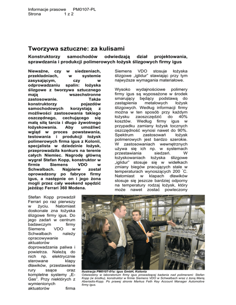 Informacje prasowe PM0107-PL Strona 1z2 Tworzywa sztuczne: za kulisami Konstruktorzy samochodów odwiedzają dział projektowania, sprawdzania i produkcji polimerowych łożysk ślizgowych firmy igus Nieważne, czy w siedzeniach, przekładniach, w systemie zasysającym, czy w odprowadzaniu spalin: łożyska ślizgowe z tworzywa sztucznego mają wszechstronne zastosowanie. Także konstruktorzy pojazdów samochodowych korzystają z możliwości zastosowania takiego oszczędnego, cechującego się małą siłą tarcia i długo żywotnego łożyskowania. Aby umożliwć wgląd w proces powstawania, testowania i produkcji łożysk polimerowych firma igus z Kolonii, specjalista w dziedzinie łożysk, przeprowadziła konkurs na terenie całych Niemiec. Nagrodę główną wygrał Stefan Kopp, konstruktor w firmie Siemens VDO w Schwalbach. Najpierw został oprowadzony po fabryce firmy igus, a następnie on i jego żona mogli przez cały weekend spędzić jeżdżąc Ferrari 360 Modena. Stefan Kopp prowadził Ferrari po raz pierwszy w życiu. Natomiast doskonale zna łożyska ślizgowe firmy igus. Do jego zadań w centrum badawczym firmy Siemens VDO w Schwalbach należy opracowywanie aktuatorów doprowadzania paliwa i powietrza. Należą do nich np. elektrycznie sterowane klapy dławików, przestawiane rury ssące oraz kompletne systemy „EGas”. Przy niektórych z wymienionych aktuatorów firma Siemens VDO stosuje łożyska ślizgowe „iglidur” stawiając przy tym najwyższe wymagania materiałowe. Wysoko wydajnościowe polimery firmy igus są wyposażone w środek smarujący będący podstawą do zastąpienia metalowych łożysk ślizgowych. Według informacji firmy można w ten sposób przy każdym łożysku zaoszczędzić do 40% kosztów. Według firmy igus w przypadku zamiany łożysk tocznych oszczędność wynosi nawet do 90%. Spektrum zastosowań łożysk polimerowych jest bardzo szerokie. W zastosowaniach wewnętrznych używa się ich np. w systemach przestawiania siedzeń. W łożyskowaniach łożyska ślizgowe „iglidur” stosuje się w widełkach zmiany biegów pracujących stale w temperaturach wynoszących 200 °C. Natomiast w klapach dławików stosuje się jeszcze bardziej odporny na temperatury rodzaj łożysk, który może nawet zostać powleczony Ilustracja PM0107-01a: igus GmbH, Kolonia Odwiedziny w laboratorium firmy igus prowadzącej badania nad polimerami: Stefan Kopp (w środku), konstruktor w firmie Siemens VDO w Schwalbach wraz z żoną Marią Aberiadis-Kopp. Po prawej stronie Markus Feth Key Account Manager Automotive firmy igus. Informacje prasowe PM0107-PL Strona 2z2 wzmocnionymi włóknem szklanym tworzywami PA albo PPS. W ten sposób łożysko staje się jednostką konstrukcyjną struktury otoczenia. Dzięki temu możliwe jest także powlekanie klap i wałów. Ponadto w skład portfolio wchodzą także rozwiązania specjalne jak np. „bez stukotowe” łożyska przeznaczone dla układów pedałów w przypadku których sprężyny zapewniają napięcie wstępne ruchu pedała i tym samym łożyskowanie bez żadnego luzu. Ilustracja PM0107-02: igus GmbH, Kolonia Wygrał weekend w Ferrari: Stefan Kopp (po prawej stronie), konstruktor w firmie Siemens VDO w Schwalbach wraz z żoną Marią Aberiadis-Kopp. Po lewej stronie Markus Feth Key Account Manager Automotive firmy igus. KONTAKT: Ilustracja PM0107-01b: igus GmbH, Kolonia Odwiedziny w laboratorium firmy igus prowadzącej badania nad polimerami: Stefan Kopp (w środku), konstruktor w firmie Siemens VDO w Schwalbach wraz z żoną Marią Aberiadis-Kopp. Po prawej stronie Markus Feth Key Account Manager Automotive firmy igus. igus® Sp z o.o ul. Parowcowa 10b 02-445 Warszawa Tel. 022-863 57 70 Faks 022-863 61 69 [email protected] www.igus.pl KONTAKT PRASOWY: André Kluth Corporate Communication Manager Ilustracja PM0107-03: igus GmbH, Kolonia Dzięki bezszelestnemu łożysku z tworzywa sztucznego „iglidur JVFM Preload“ stworzonego dla największych obciążeń statycznych można uniknąć odgłosów stukotania w zespołach pedałów. igus GmbH Spicher Str. 1a D-51147 Köln Tel. +49 (0) 22 03 / 96 49 - 611 Fax +49 (0) 22 03 / 96 49 - 631 [email protected] www.igus.de DIN ISO 9001:2000 “igus, Chainflex, Easy Chain, E-Chain, E-Chain System, Energy Chain, Energy Chain System, Flizz, ReadyChain, Triflex, TwisterChain, DryLin, iglidur, igubal, Polysorb, plastics for longer life, manus“ są znakami towarowymi chronionymi prawem w Republice Federalnej Niemiec i na całym świecie.