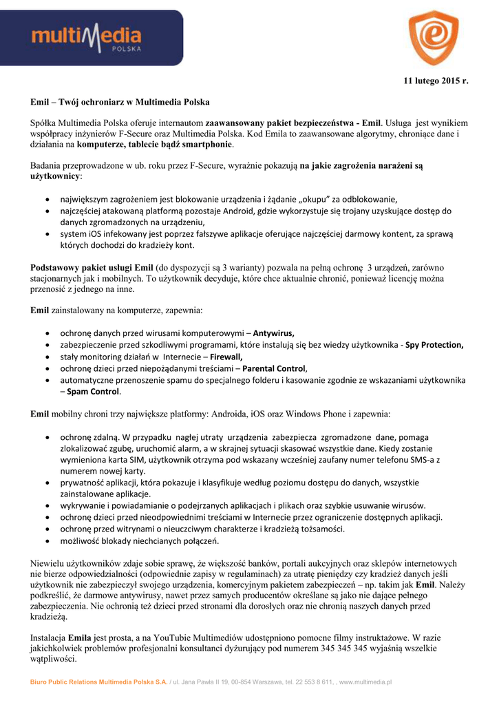 11 lutego 2015 r. Emil – Twój ochroniarz w Multimedia Polska Spółka Multimedia Polska oferuje internautom zaawansowany pakiet bezpieczeństwa - Emil. Usługa jest wynikiem współpracy inżynierów F-Secure oraz Multimedia Polska. Kod Emila to zaawansowane algorytmy, chroniące dane i działania na komputerze, tablecie bądź smartphonie. Badania przeprowadzone w ub. roku przez F-Secure, wyraźnie pokazują na jakie zagrożenia narażeni są użytkownicy: największym zagrożeniem jest blokowanie urządzenia i żądanie „okupu” za odblokowanie, najczęściej atakowaną platformą pozostaje Android, gdzie wykorzystuje się trojany uzyskujące dostęp do danych zgromadzonych na urządzeniu, system iOS infekowany jest poprzez fałszywe aplikacje oferujące najczęściej darmowy kontent, za sprawą których dochodzi do kradzieży kont. Podstawowy pakiet usługi Emil (do dyspozycji są 3 warianty) pozwala na pełną ochronę 3 urządzeń, zarówno stacjonarnych jak i mobilnych. To użytkownik decyduje, które chce aktualnie chronić, ponieważ licencję można przenosić z jednego na inne. Emil zainstalowany na komputerze, zapewnia: ochronę danych przed wirusami komputerowymi – Antywirus, zabezpieczenie przed szkodliwymi programami, które instalują się bez wiedzy użytkownika - Spy Protection, stały monitoring działań w Internecie – Firewall, ochronę dzieci przed niepożądanymi treściami – Parental Control, automatyczne przenoszenie spamu do specjalnego folderu i kasowanie zgodnie ze wskazaniami użytkownika – Spam Control. Emil mobilny chroni trzy największe platformy: Androida, iOS oraz Windows Phone i zapewnia: ochronę zdalną. W przypadku nagłej utraty urządzenia zabezpiecza zgromadzone dane, pomaga zlokalizować zgubę, uruchomić alarm, a w skrajnej sytuacji skasować wszystkie dane. Kiedy zostanie wymieniona karta SIM, użytkownik otrzyma pod wskazany wcześniej zaufany numer telefonu SMS-a z numerem nowej karty. prywatność aplikacji, która pokazuje i klasyfikuje według poziomu dostępu do danych, wszystkie zainstalowane aplikacje. wykrywanie i powiadamianie o podejrzanych aplikacjach i plikach oraz szybkie usuwanie wirusów. ochronę dzieci przed nieodpowiednimi treściami w Internecie przez ograniczenie dostępnych aplikacji. ochronę przed witrynami o nieuczciwym charakterze i kradzieżą tożsamości. możliwość blokady niechcianych połączeń. Niewielu użytkowników zdaje sobie sprawę, że większość banków, portali aukcyjnych oraz sklepów internetowych nie bierze odpowiedzialności (odpowiednie zapisy w regulaminach) za utratę pieniędzy czy kradzież danych jeśli użytkownik nie zabezpieczył swojego urządzenia, komercyjnym pakietem zabezpieczeń – np. takim jak Emil. Należy podkreślić, że darmowe antywirusy, nawet przez samych producentów określane są jako nie dające pełnego zabezpieczenia. Nie ochronią też dzieci przed stronami dla dorosłych oraz nie chronią naszych danych przed kradzieżą. Instalacja Emila jest prosta, a na YouTubie Multimediów udostępniono pomocne filmy instruktażowe. W razie jakichkolwiek problemów profesjonalni konsultanci dyżurujący pod numerem 345 345 345 wyjaśnią wszelkie wątpliwości. Biuro Public Relations Multimedia Polska S.A. / ul. Jana Pawła II 19, 00-854 Warszawa, tel. 22 553 8 611, , www.multimedia.pl