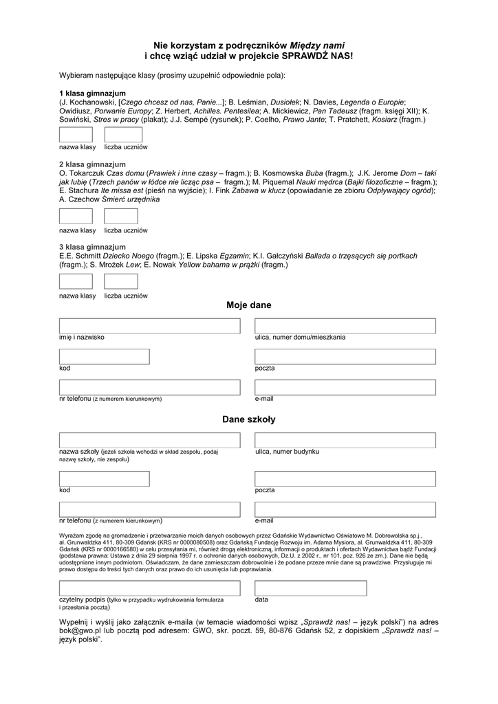 Nie korzystam z podręczników Między nami i chcę wziąć udział w projekcie SPRAWDŹ NAS! Wybieram następujące klasy (prosimy uzupełnić odpowiednie pola): 1 klasa gimnazjum (J. Kochanowski, [Czego chcesz od nas, Panie...]; B. Leśmian, Dusiołek; N. Davies, Legenda o Europie; Owidiusz, Porwanie Europy; Z. Herbert, Achilles. Pentesilea; A. Mickiewicz, Pan Tadeusz (fragm. księgi XII); K. Sowiński, Stres w pracy (plakat); J.J. Sempé (rysunek); P. Coelho, Prawo Jante; T. Pratchett, Kosiarz (fragm.) nazwa klasy liczba uczniów 2 klasa gimnazjum O. Tokarczuk Czas domu (Prawiek i inne czasy – fragm.); B. Kosmowska Buba (fragm.); J.K. Jerome Dom – taki jak lubię (Trzech panów w łódce nie licząc psa – fragm.); M. Piquemal Nauki mędrca (Bajki filozoficzne – fragm.); E. Stachura Ite missa est (pieśń na wyjście); I. Fink Zabawa w klucz (opowiadanie ze zbioru Odpływający ogród); A. Czechow Śmierć urzędnika nazwa klasy liczba uczniów 3 klasa gimnazjum E.E. Schmitt Dziecko Noego (fragm.); E. Lipska Egzamin; K.I. Gałczyński Ballada o trzęsących się portkach (fragm.); S. Mrożek Lew; E. Nowak Yellow bahama w prążki (fragm.) nazwa klasy liczba uczniów Moje dane imię i nazwisko ulica, numer domu/mieszkania kod poczta nr telefonu (z numerem kierunkowym) e-mail Dane szkoły nazwa szkoły (jeżeli szkoła wchodzi w skład zespołu, podaj nazwę szkoły, nie zespołu) ulica, numer budynku kod poczta nr telefonu (z numerem kierunkowym) e-mail Wyrażam zgodę na gromadzenie i przetwarzanie moich danych osobowych przez Gdańskie Wydawnictwo Oświatowe M. Dobrowolska sp.j., al. Grunwaldzka 411, 80-309 Gdańsk (KRS nr 0000080508) oraz Gdańską Fundację Rozwoju im. Adama Mysiora, al. Grunwaldzka 411, 80-309 Gdańsk (KRS nr 0000166580) w celu przesyłania mi, również drogą elektroniczną, informacji o produktach i ofertach Wydawnictwa bądź Fundacji (podstawa prawna: Ustawa z dnia 29 sierpnia 1997 r. o ochronie danych osobowych, Dz.U. z 2002 r., nr 101, poz. 926 ze zm.). Dane nie będą udostępniane innym podmiotom. Oświadczam, że dane zamieszczam dobrowolnie i że podane przeze mnie dane są prawdziwe. Przysługuje mi prawo dostępu do treści tych danych oraz prawo do ich usunięcia lub poprawiania. czytelny podpis (tylko w przypadku wydrukowania formularza i przesłania pocztą) data Wypełnij i wyślij jako załącznik e-maila (w temacie wiadomości wpisz „Sprawdź nas! – język polski”) na adres [email protected] lub pocztą pod adresem: GWO, skr. poczt. 59, 80-876 Gdańsk 52, z dopiskiem „Sprawdź nas! – język polski”.