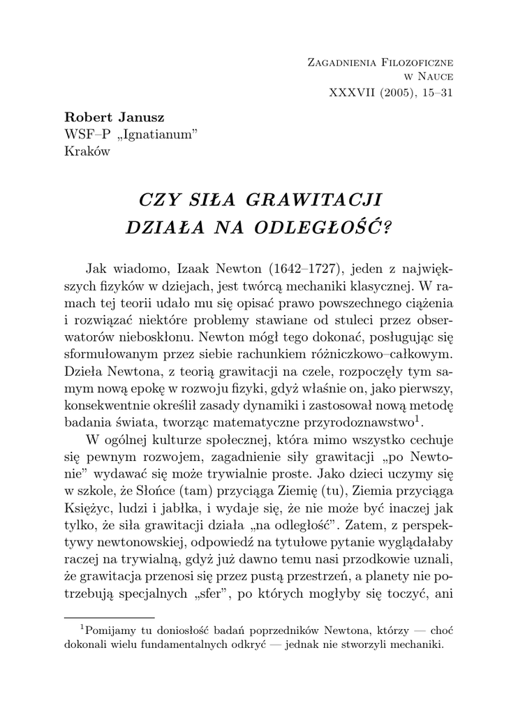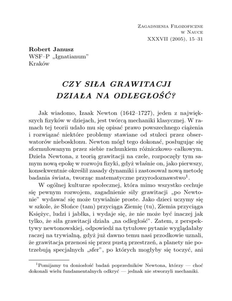 Zagadnienia Filozoficzne w Nauce XXXVII (2005), 15–31 Robert Janusz WSF–P „Ignatianum” Kraków CZY SIŁA GRAWITACJI DZIAŁA NA ODLEGŁOŚĆ? Jak wiadomo, Izaak Newton (1642–1727), jeden z największych fizyków w dziejach, jest twórcą mechaniki klasycznej. W ramach tej teorii udało mu się opisać prawo powszechnego ciążenia i rozwiązać niektóre problemy stawiane od stuleci przez obserwatorów nieboskłonu. Newton mógł tego dokonać, posługując się sformułowanym przez siebie rachunkiem różniczkowo–całkowym. Dzieła Newtona, z teorią grawitacji na czele, rozpoczęły tym samym nową epokę w rozwoju fizyki, gdyż właśnie on, jako pierwszy, konsekwentnie określił zasady dynamiki i zastosował nową metodę badania świata, tworząc matematyczne przyrodoznawstwo1 . W ogólnej kulturze społecznej, która mimo wszystko cechuje się pewnym rozwojem, zagadnienie siły grawitacji „po Newtonie” wydawać się może trywialnie proste. Jako dzieci uczymy się w szkole, że Słońce (tam) przyciąga Ziemię (tu), Ziemia przyciąga Księżyc, ludzi i jabłka, i wydaje się, że nie może być inaczej jak tylko, że siła grawitacji działa „na odległość”. Zatem, z perspektywy newtonowskiej, odpowiedź na tytułowe pytanie wyglądałaby raczej na trywialną, gdyż już dawno temu nasi przodkowie uznali, że grawitacja przenosi się przez pustą przestrzeń, a planety nie potrzebują specjalnych „sfer”, po których mogłyby się toczyć, ani 1 Pomijamy tu doniosłość badań poprzedników Newtona, którzy — choć dokonali wielu fundamentalnych odkryć — jednak nie stworzyli mechaniki. 16 Robert Janusz „lin”, które by je w ruchu krzywoliniowym utrzymywały. Jednakże, wbrew tej prostocie, w tytule naszego artykułu zawartych jest kilka ważnych pytań, na które będziemy się starać odpowiedzieć: co to znaczy, że grawitacja działa?, co znaczy, że działa na odległość? i czy w ogóle grawitacja jest siłą? Zanim zaczniemy odpowiadać na pytania dotyczące powszechnego ciążenia, skupimy uwagę na pojęciu siły, wprowadzonym do fizyki przez Newtona. Następnie spróbujemy — w ramach jego teorii — sprawdzić, czy rzeczywiście grawitacja nie przejawia, jako siła, jakichś trudności. W końcu zobaczymy, co nowego wprowadził do teorii grawitacji A. Einstein. 1. POJĘCIE SIŁY W MECHANICE KLASYCZNEJ Mechanika klasyczna Newtona jest teorią ruchu punktów materialnych. Zagadnienie ruchu stanowiło od zarania dziejów jeden z głównych problemów, także filozoficznych. Do czasów Newtona zrozumienie ruchu (zmiany) związane było z potocznymi intuicjami lub pojęciami jakościowymi. Chociaż już przed Newtonem wyrażano odległości przestrzenne i przedziały czasowe w formie liczbowej, to jednak nie umiano trafnie określić, czym jest zmiana położenia w czasie. Dopiero dzięki matematycznemu pojęciu pochodnej funkcji można było wypracować pojęcie zmiany w taki sposób, że wyjaśniło ono dotychczasowe nieścisłości oraz zapoczątkowało samodzielny rozwój zmatematyzowanego pojęcia ruchu. Pochodna opisuje bowiem, co dzieje się lokalnie, w małym otoczeniu poruszającego się punktu — jest styczną do jego toru. Właśnie poprzez pochodną funkcji Newton opisał prędkość (jako zmianę położenia: v = s0 )2 i przyspieszenie (jako zmianę prędkości: a = v 0 = s00 ) punktowego ciała, którego jedyną wewnętrzną charakterystyką fizyczną — wymaganą przez teorię — była masa. 2 Pochodną względem czasu, na potrzeby naszego artykułu, oznaczamy primem (0 ), pochodną pochodnej — 00 . Pomijamy tu techniczny problem, że położenie, prędkość itd. są wielkościami wektorowymi. Czy siła grawitacji działa na odległość? 17 W ten sposób Newton rozpoczął budowę swojej dynamiki, która wyjaśniła ruchy ciał poruszających się pod wpływem działania na nie różnych sił. Jeśli tylko będzie nam znana matematyczna formuła na działającą siłę, to — dzięki zasadom dynamiki — będzie można obliczyć tor ruchu (położenie w czasie) interesującego nas punktu materialnego. Jednak pojęcie siły, jakie występuje w teorii Newtona, ma swoje specyficzne, niespotykane dotychczas, znaczenie. Newton przejął od Galileusza (1564–1642) zasadę bezwładności, która mówi, co dzieje się z ciałem fizycznym, gdy nie działa na nie żadna siła: ciało takie pozostaje w spoczynku lub porusza się jednostajnie prostoliniowo w układzie inercjalnym3 . Trzeba było następnie odkryć, co dzieje się w tym układzie z takim ciałem fizycznym, gdy działa na nie jakaś siła4 . Właśnie druga zasada, odkryta przez Newtona, odpowiada na to pytanie, tłumacząc jednocześnie zasadę bezwładności Galileusza (gdy F = 0). W myśl drugiego prawa Newtona, siła działająca na ciało powoduje zmianę jego pędu: F = p0 , gdzie pęd jest określony jako iloczyn masy i prędkości: p = mv. W ten sposób, po dodaniu trzeciej zasady: akcja = −reakcja, ogólne zasady dynamiki zostały sformułowane tak, że znając działającą siłę, można rozwiązać układ równań różniczkowych (są to równania zawierające pochodne) opisujący ruch. Zauważmy, że zasady mechaniki obowiązują jedynie w układach inercjalnych, określonych przez niedziałanie nań żadnej siły; aby wskazać układ inercjalny, musimy wiedzieć, co to jest siła — gdy chcemy ją zmierzyć, potrzebujemy układu inercjalnego. Widzimy zatem, że kłopoty z koncepcją siły, będące jednocześnie kłopotami z koncepcją inercjalnego układu odniesienia (i na od3 W gruncie rzeczy, zasada ta definiuje układy inercjalne: są to układy odniesienia, na które nie działa żadna siła. Dzięki określeniu praw ruchu w układach inercjalnych można opisać ruch w układzie, na który działa jakaś znana siła. 4 Por. R.P. Feynman, R.B. Leighton, M. Sands, Feynmana wykłady z fizyki, t. I, cz. 1, rozdz. 7, 9. 18 Robert Janusz wrót), b