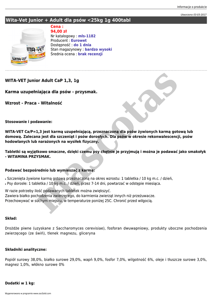 Informacje o produkcie Utworzono 03-03-2017 Wita-Vet Junior + Adult dla psów <25kg 1g 400tabl Cena : 94,00 zł Nr katalogowy : mls-1182 Producent : Eurowet Dostępność : do 1 dnia Stan magazynowy : bardzo wysoki Średnia ocena : brak recenzji Wzrost - Praca - Witalność Stosowanie i podawanie: co ta Karma uzupełniająca dla psów - przysmak. s WITA-VET Junior Adult CaP 1,3, 1g WITA-VET Ca/P=1,3 jest karmą uzupełniającą, przeznaczoną dla psów żywionych karmą gotową lub domową. Zalecana jest dla szczeniąt i psów dorosłych. Dla psów w okresie rekonwalescencji, psów hodowlanych lub narażonych na wysiłek fizyczny. m as Tabletki są wyjątkowo smaczne, dzięki czemu psy chętnie je przyjmują i można je podawać jako smakołyk - WITAMINA PRZYSMAK. Podawać bezpośrednio lub wymieszać z karmą: ● ● Szczenięta żywione karmą gotową przeznaczoną na okres wzrostu: 1 tabletka / 10 kg m.c. / dzień, Psy dorosłe: 1 tabletka / 10 kg m.c. / dzień, przez 7-14 dni, powtarzać w odstępie miesiąca. W razie potrzeby ilość podawanych tabletek można zwiększyć. Zawiera białko pochodzenia zwierzęcego, do karmienia zwierząt innych niż przeżuwacze. Przechowywać w suchym miejscu, w temperaturze poniżej 25C. Chronić przed wilgocią. Skład: Drożdże piwne (uzyskane z Saccharomyces cerevisiae), fosforan dwuwapniowy, produkty uboczne pochodzenia zwierzęcego (ze świń), tlenek magnezu, gliceryna Składniki analityczne: Popiół surowy 38,0%, białko surowe 29,0%, wapń 9,0%, fosfor 7,0%, wilgotność 6%, oleje i tłuszcze surowe 3,0%, magnez 1,0%, włókno surowe 0% Dodatki w 1 kg: Wygenerowano w programie www.oscGold.com m as co ta s Witaminy i pro-witaminy: E672 witamina A 1 000 000 IU, E671 witamina D3 5000 IU, 3a700 witamina E 1250 IU, E300 witamina C (kwas L-askorbowy) 10 000 mg, kwas nikotynowy 7500 mg, kwas pantotenowy (D-pantotenian wapnia) 5000 mg, chlorek choliny 3000 mg, witamina B1 750 mg, witamina B2 750 mg, 3a831 witamina B6 (chlorowodorek pirydoksyny) 100 mg, D-biotyna 50 mg, kwas foliowy 40 mg, witamina B12 150 mcg, aminokwasy, ich sole: 3c3.6.1. L-arginina 2000 mg, 3.2.3. L-lizyna HCl 2000 mg, mieszanka pierwiastków śladowych: E1 żelazo (siarczan żelaza jednowodny) 945 mg, E4 miedź (siarczan miedzi pięciowodny) 200 mg, E2 jod (jodan wapnia) 110 mg, E6 cynk (siarczan cynku jednowodny) 90 mg, E5 mangan (tlenek manganu) 80 mg, przeciwutleniacze: E321 butylohydroksytoluen (BHT) 72 mg
