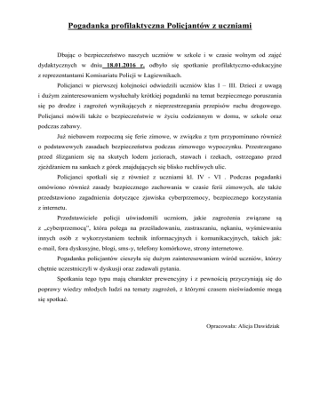 Pogadanka profilaktyczna Policjantów z uczniami Dbając o bezpieczeństwo naszych uczniów w szkole i w czasie wolnym od zajęć dydaktycznych w dniu 18.01.2016 r. odbyło się spotkanie profilaktyczno-edukacyjne z reprezentantami Komisariatu Policji w Łagiewnikach. Policjanci w pierwszej kolejności odwiedzili uczniów klas I – III. Dzieci z uwagą i dużym zainteresowaniem wysłuchały krótkiej pogadanki na temat bezpiecznego poruszania się po drodze i zagrożeń wynikających z nieprzestrzegania przepisów ruchu drogowego. Policjanci mówili także o bezpieczeństwie w życiu codziennym w domu, w szkole oraz podczas zabawy. Już niebawem rozpoczną się ferie zimowe, w związku z tym przypominano również o podstawowych zasadach bezpieczeństwa podczas zimowego wypoczynku. Przestrzegano przed ślizganiem się na skutych lodem jeziorach, stawach i rzekach, ostrzegano przed zjeżdżaniem na sankach z górek znajdujących się blisko ruchliwych ulic. Policjanci spotkali się z również z uczniami kl. IV - VI . Podczas pogadanki omówiono również zasady bezpiecznego zachowania w czasie ferii zimowych, ale także przedstawiono zagadnienia dotyczące zjawiska cyberprzemocy, bezpiecznego korzystania z internetu. Przedstawiciele policji uświadomili uczniom, jakie zagrożenia związane są z „cyberprzemocą”, która polega na prześladowaniu, zastraszaniu, nękaniu, wyśmiewaniu innych osób z wykorzystaniem technik informacyjnych i komunikacyjnych, takich jak: e-mail, fora dyskusyjne, blogi, sms-y, telefony komórkowe, strony internetowe. Pogadanka policjantów cieszyła się dużym zainteresowaniem wśród uczniów, którzy chętnie uczestniczyli w dyskusji oraz zadawali pytania. Spotkania tego typu mają charakter prewencyjny i z pewnością przyczyniają się do poprawy wiedzy młodych ludzi na tematy zagrożeń, z którymi czasem nieświadomie mogą się spotkać. Opracowała: Alicja Dawidziak